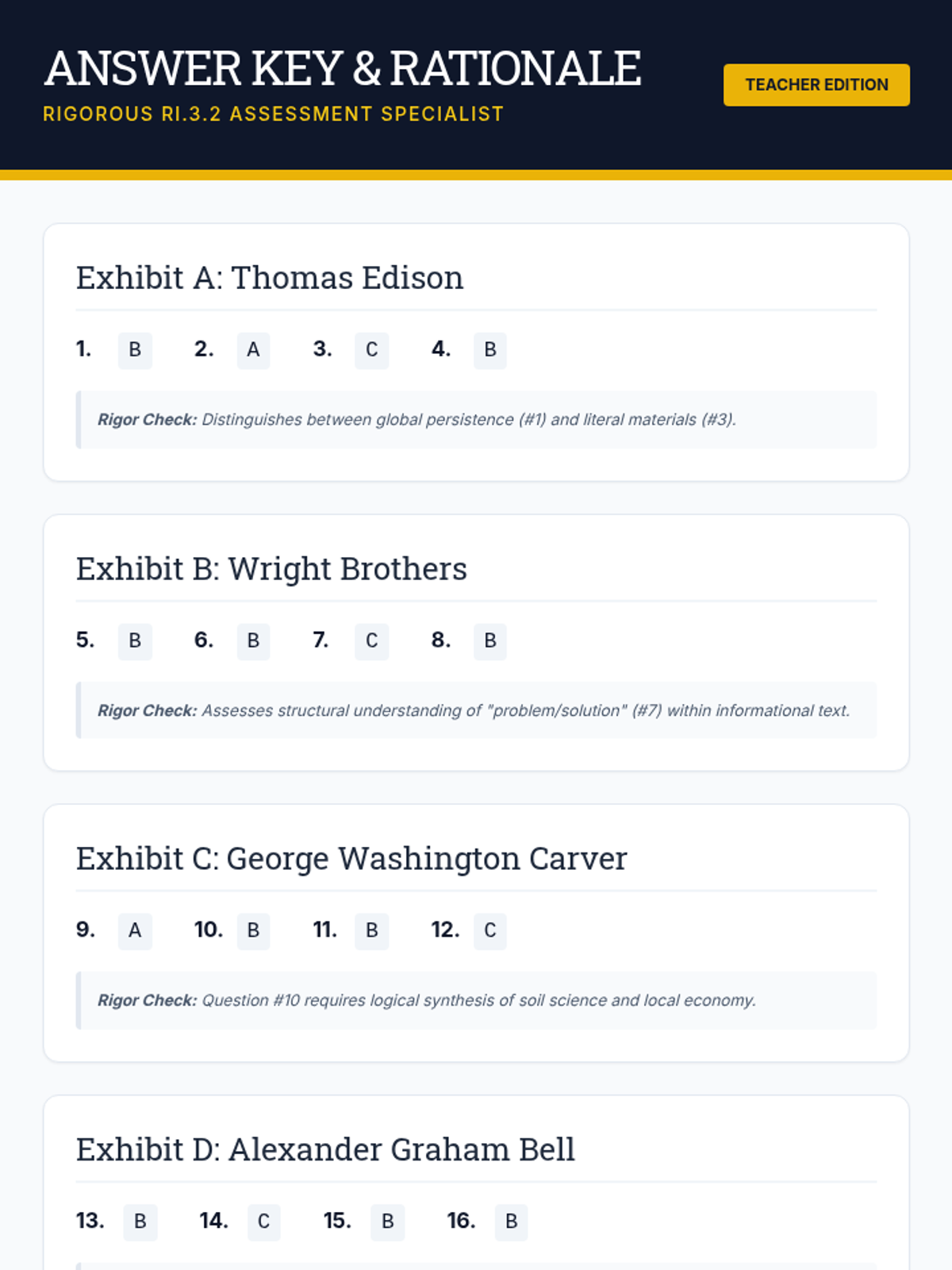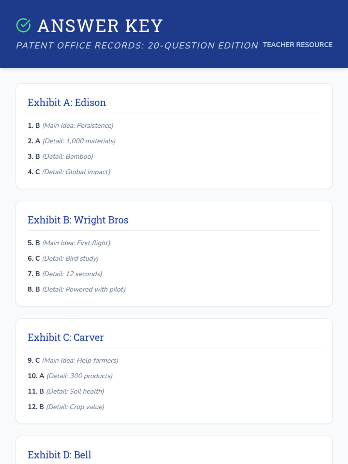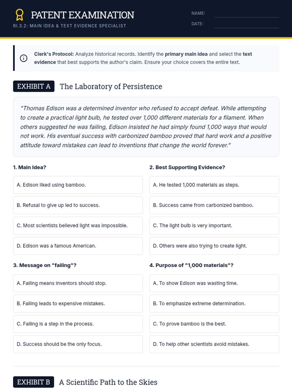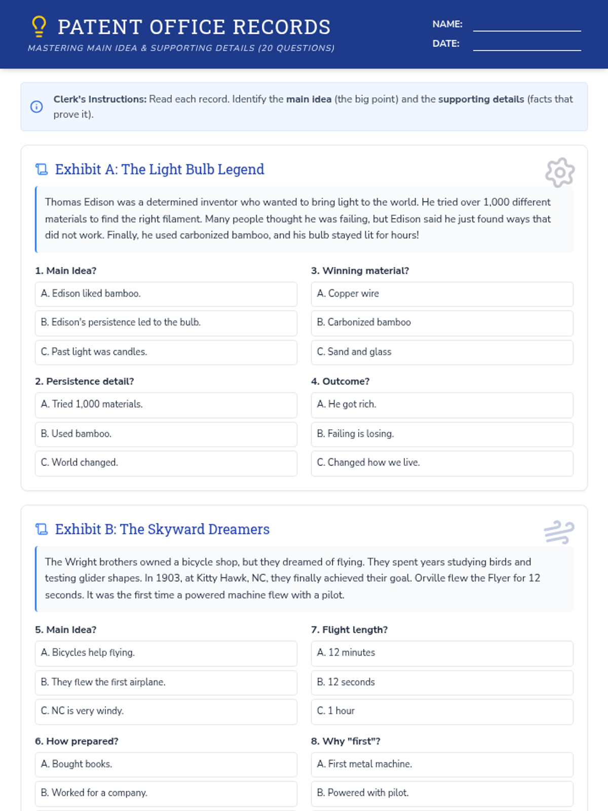 A lesson focused on identifying the main idea and supporting details in informational texts about famous early inventors. Students will practice reading short passages and selecting the best main idea and supporting evidence from multiple-choice options.