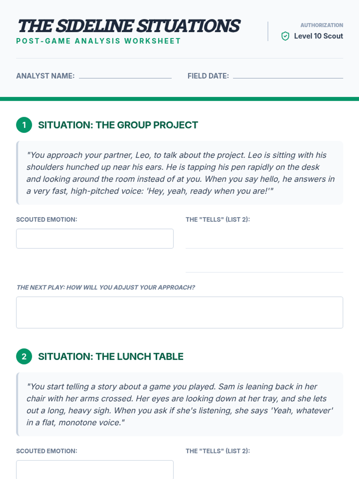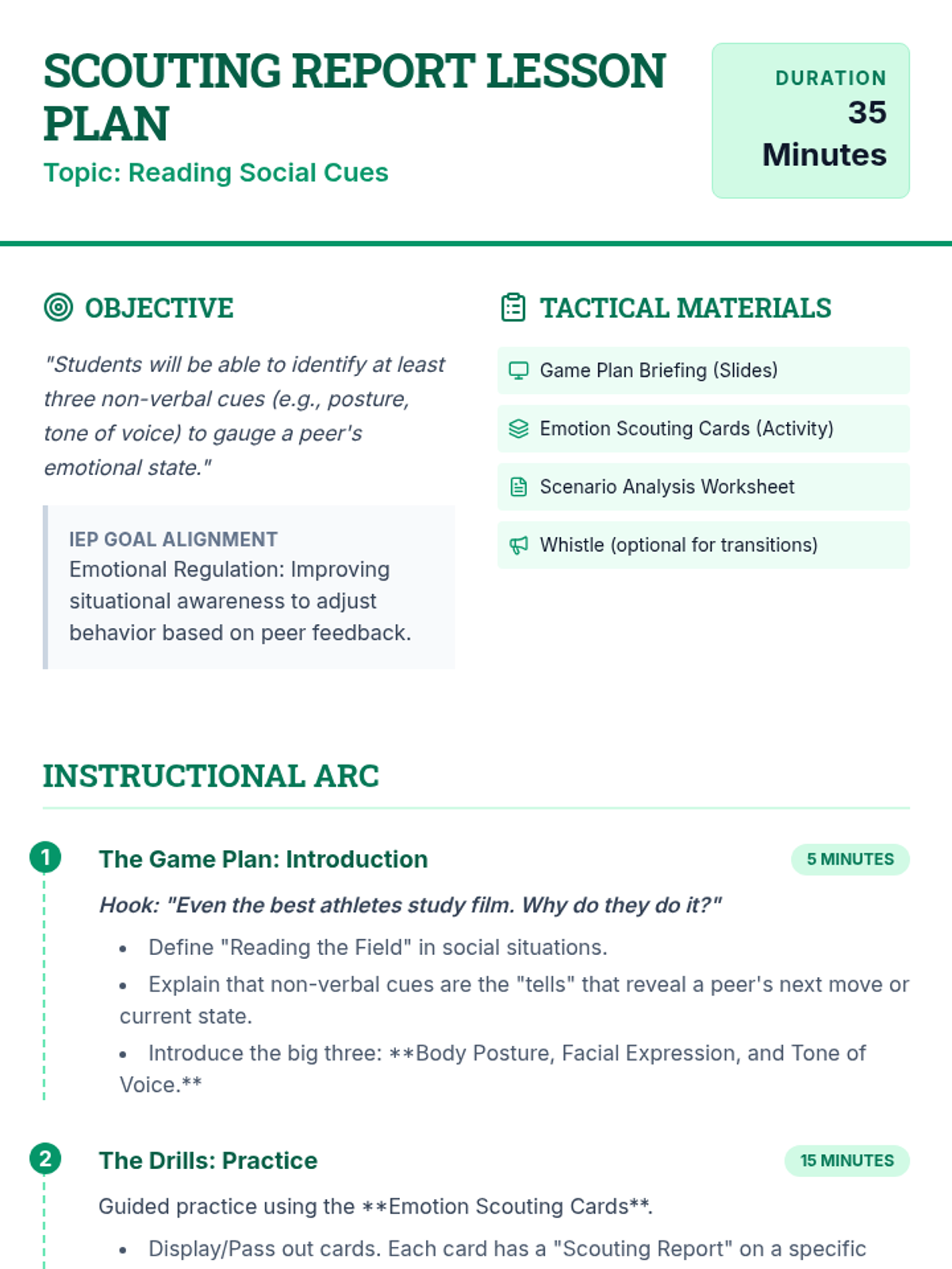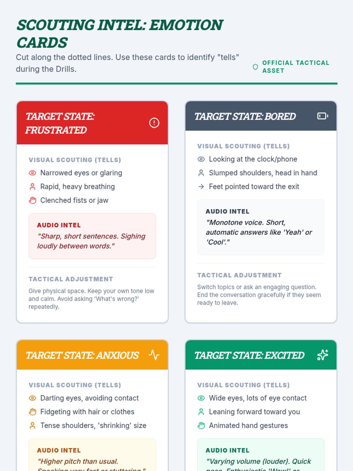 A 35-minute tactical lesson for 10th-grade students on identifying non-verbal cues and emotional states to improve social navigation and regulation.