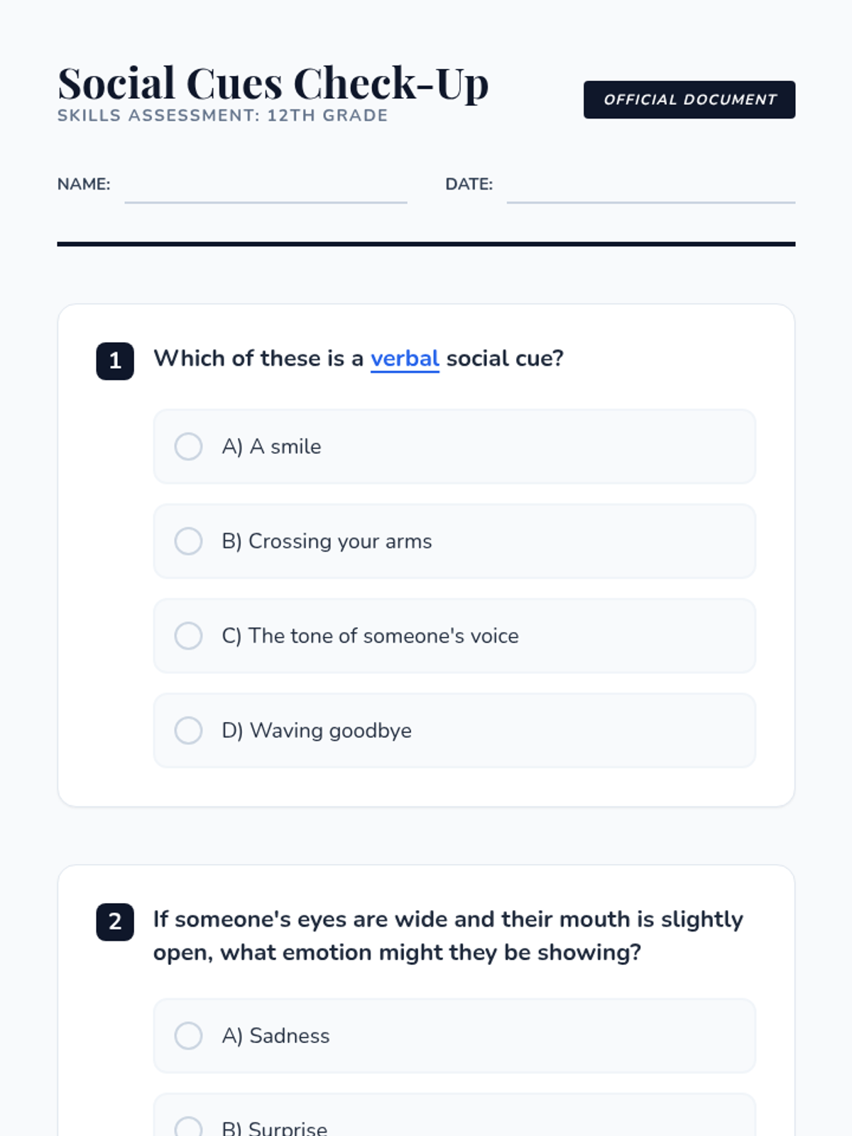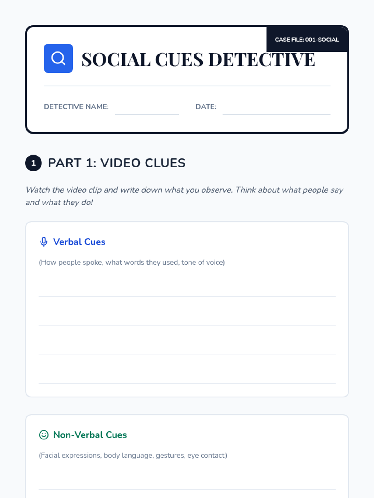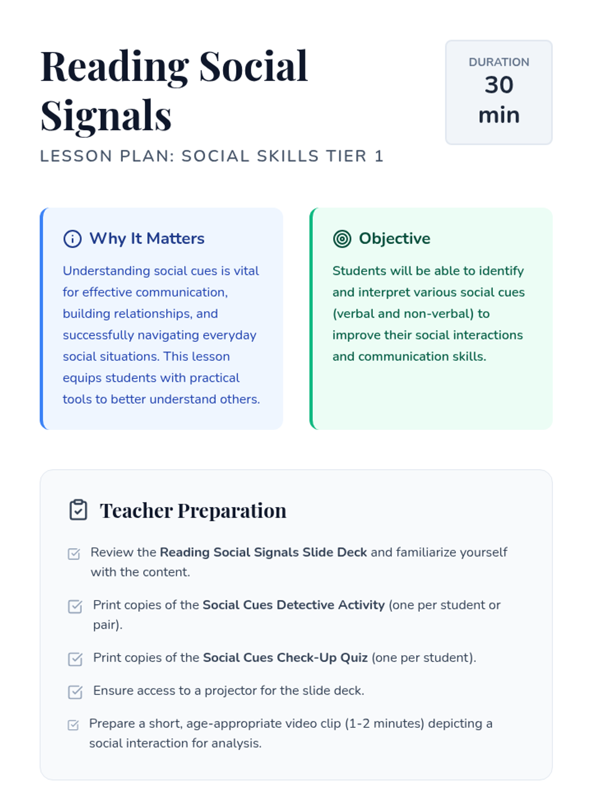 This lesson helps 12th-grade students with cognitive impairments understand and interpret social cues, which is crucial for navigating social interactions and building positive relationships. Students will explore verbal and non-verbal signals through direct instruction, video analysis, and hands-on practice.