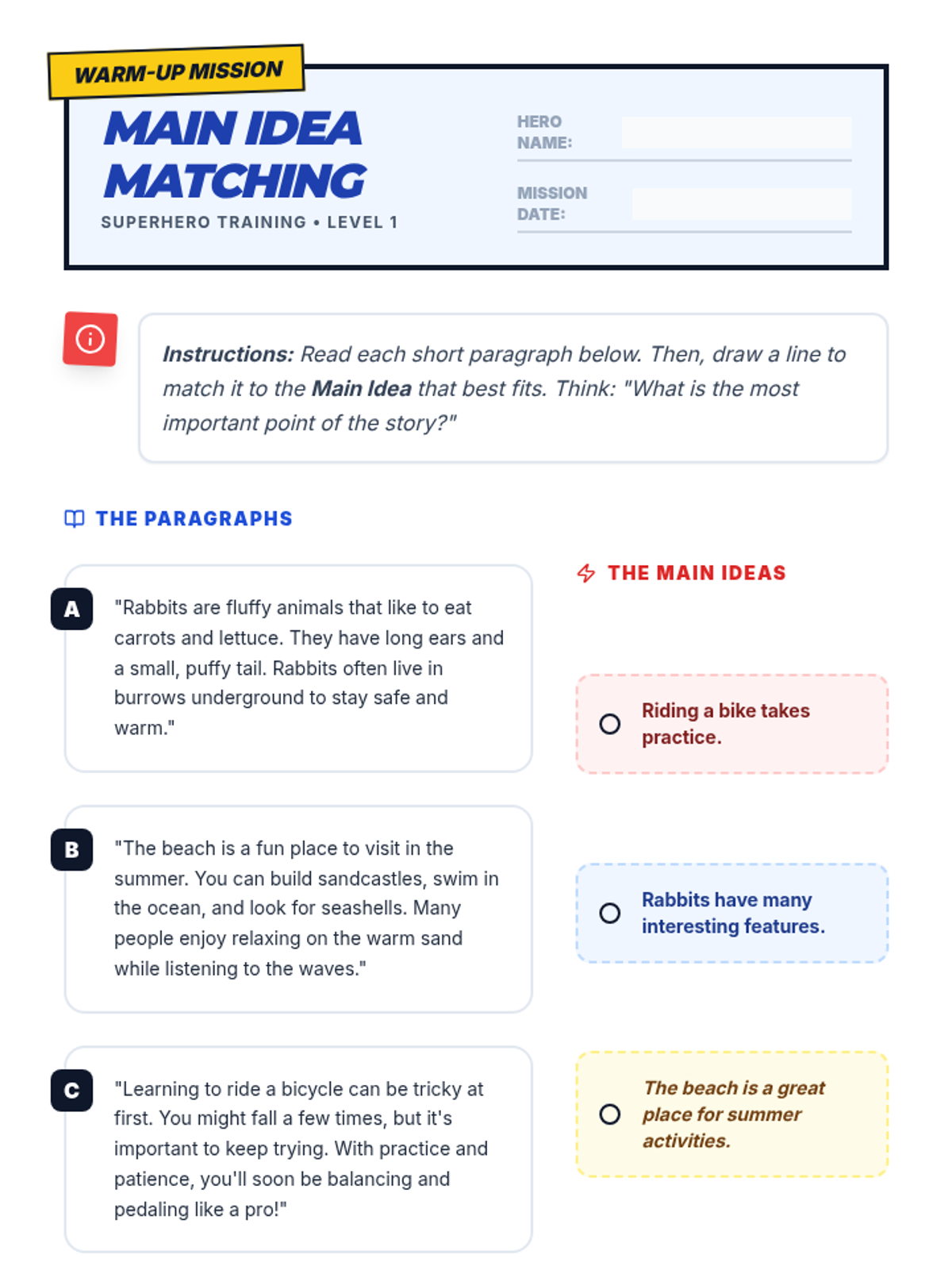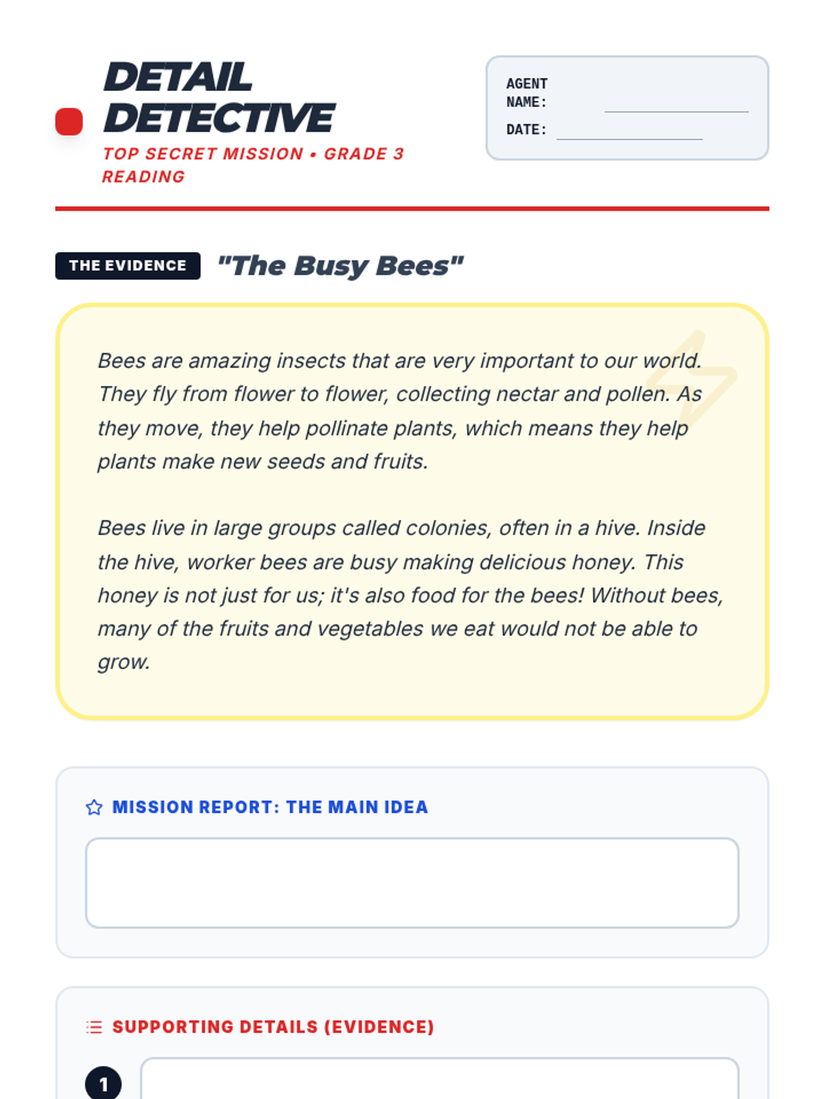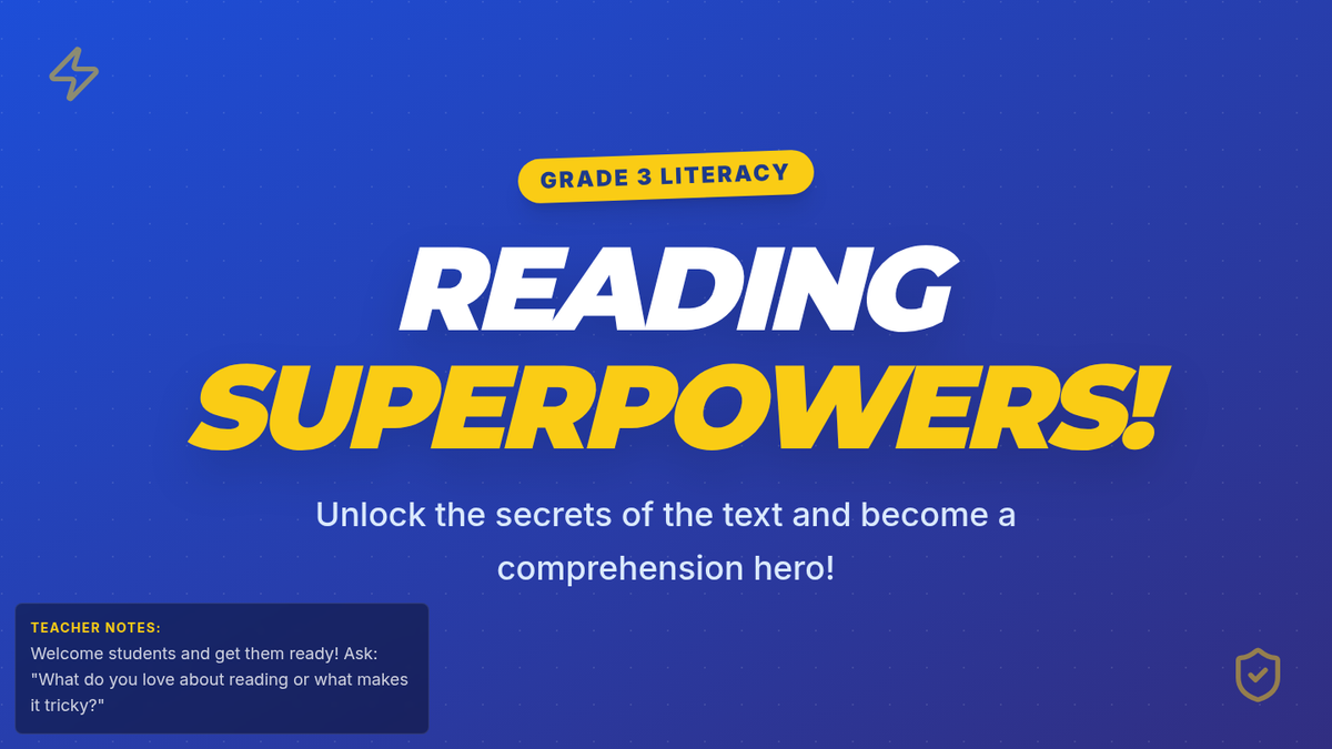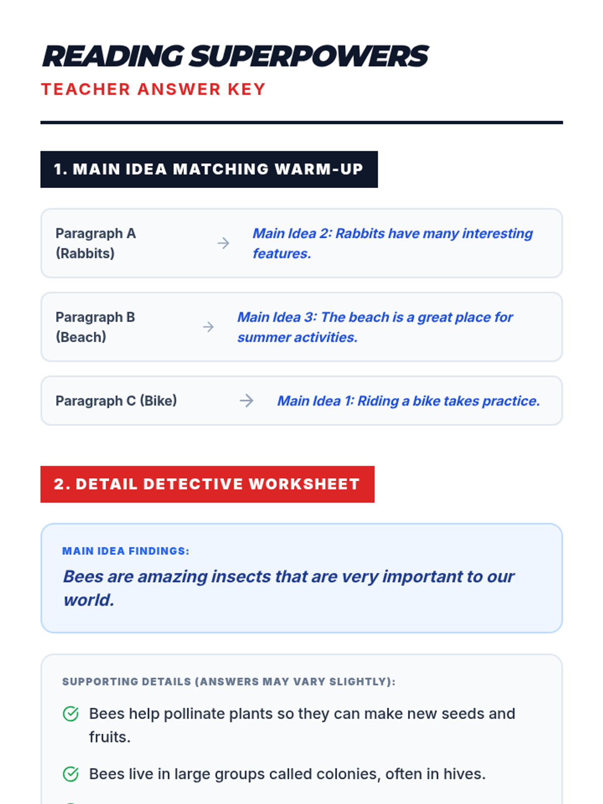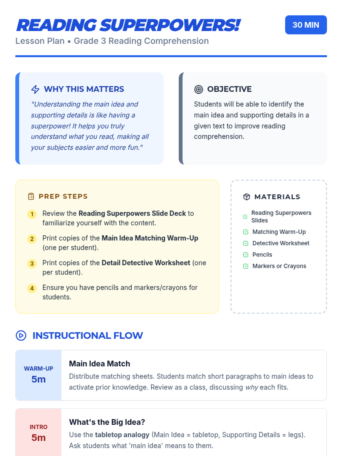 A 30-minute 3rd-grade lesson where students unlock their 'reading superpowers' by learning to identify main ideas and supporting details using a table analogy and detective-themed activities.