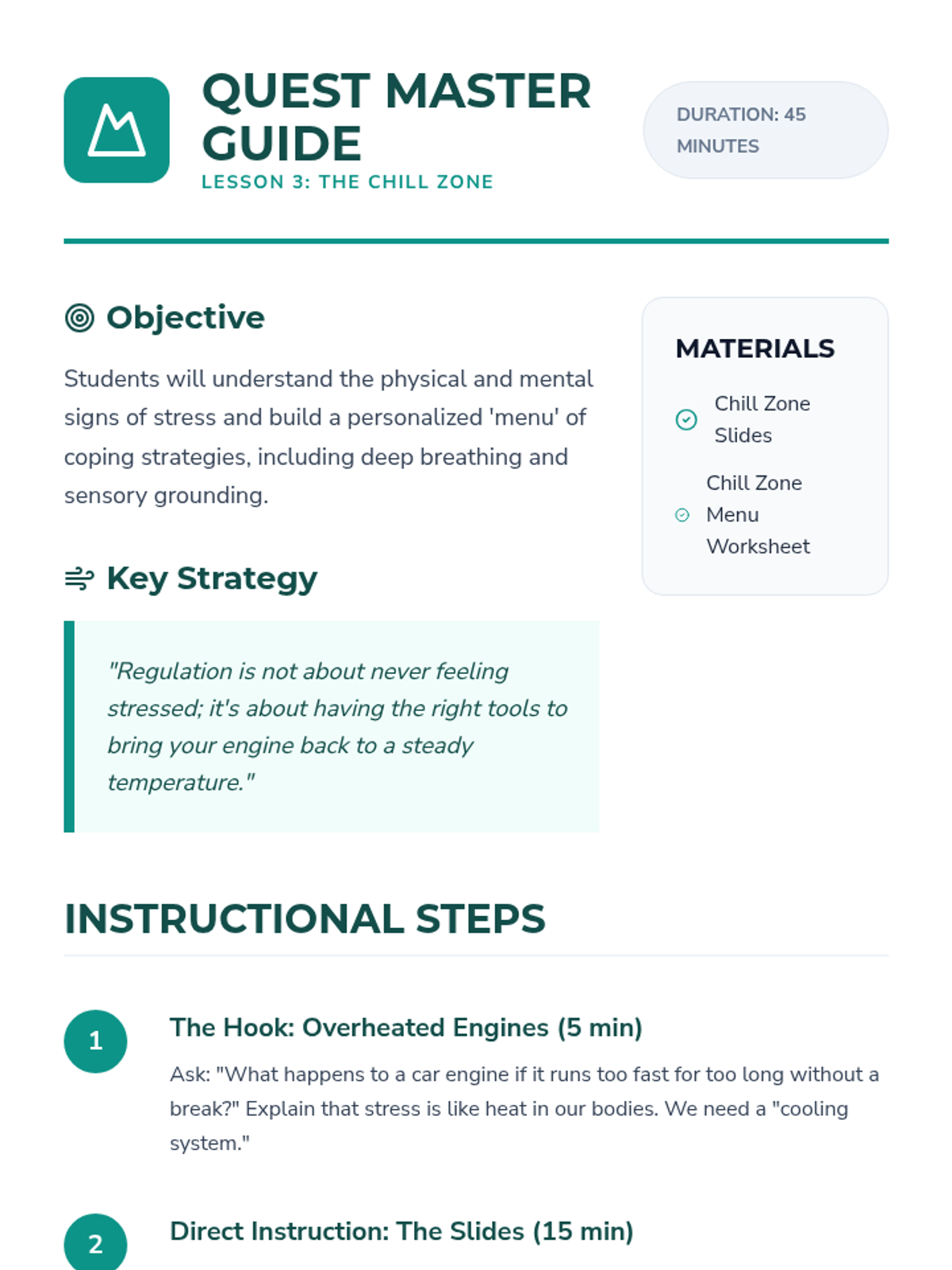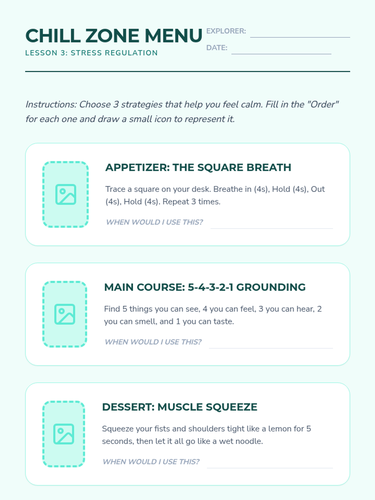 Introduces healthy coping mechanisms for stress and anxiety, providing students with a 'menu' of calming strategies like deep breathing and grounding techniques.