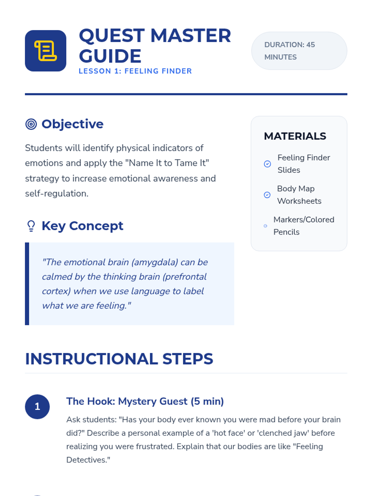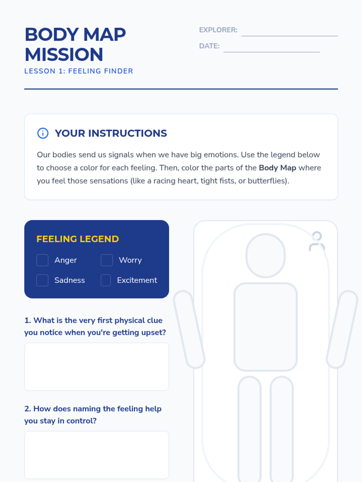 Students learn to identify physical cues of emotions and practice 'name it to tame it' strategies to manage intense feelings before they lead to reactive behaviors.