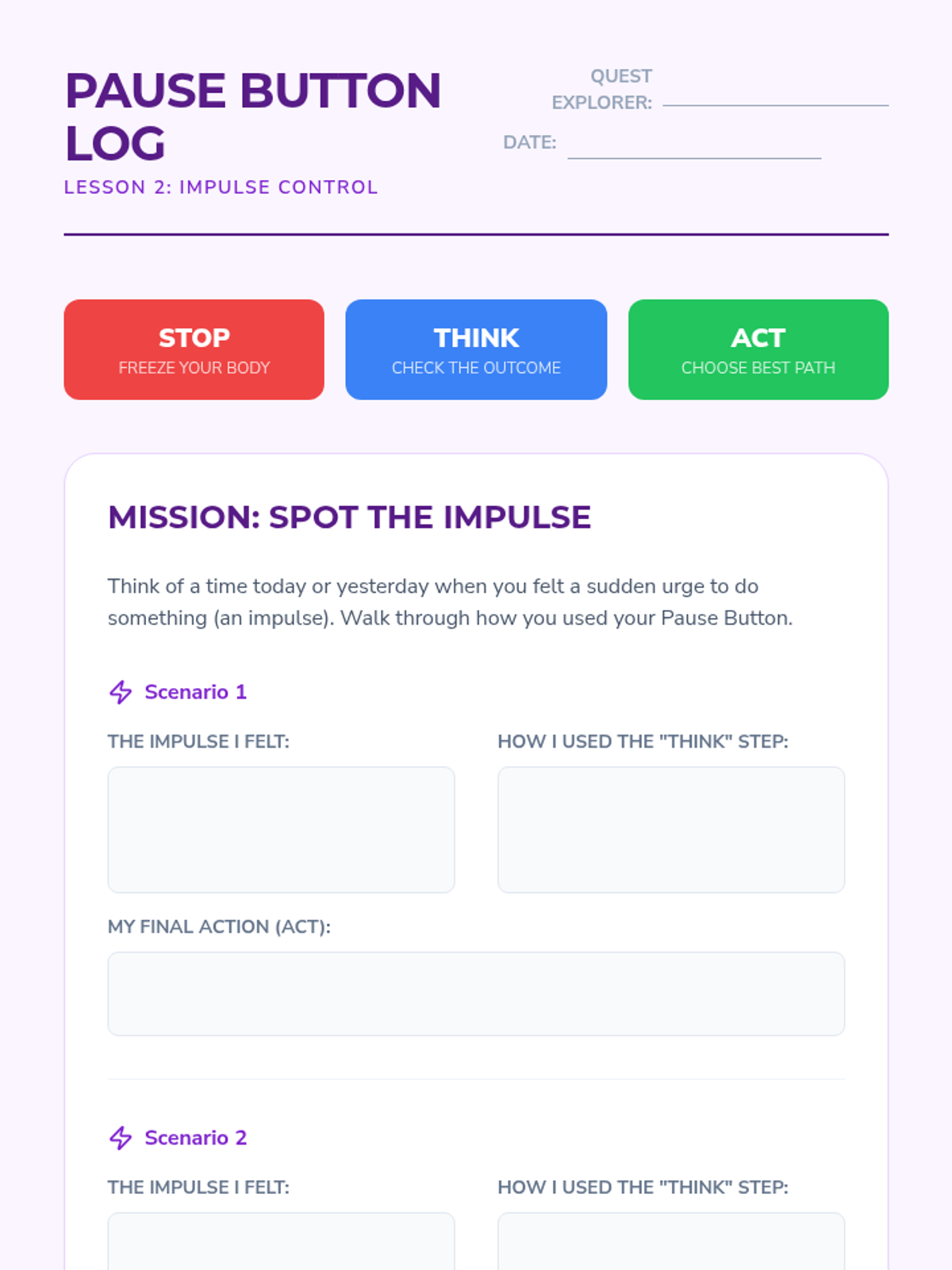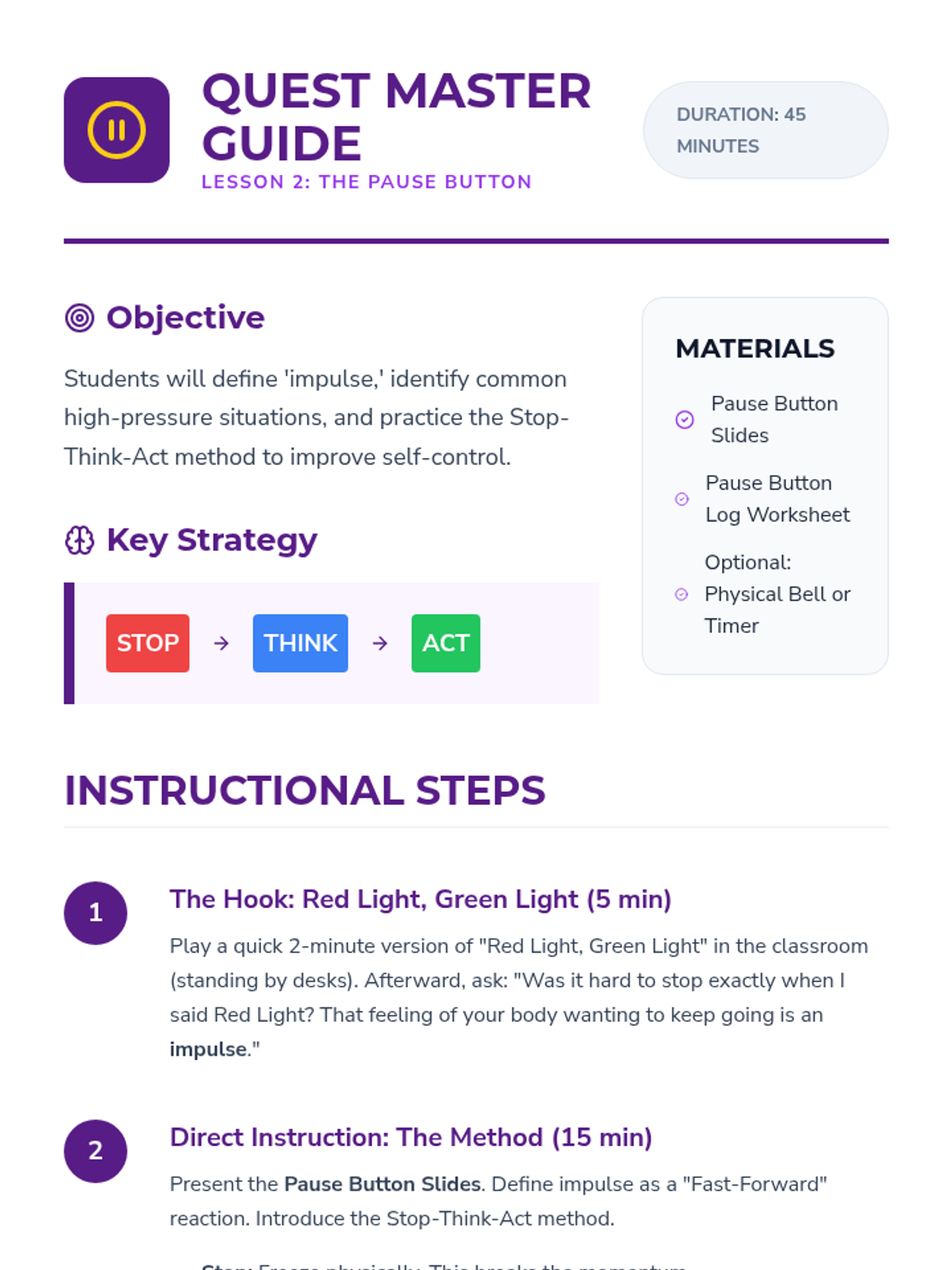 Focuses on impulse control by teaching the 'Stop, Think, Act' method, helping students recognize high-pressure moments and choose thoughtful responses over instant reactions.
