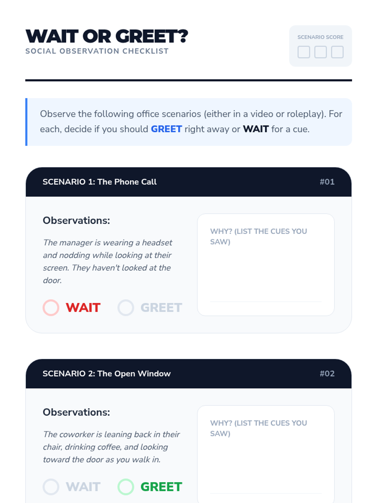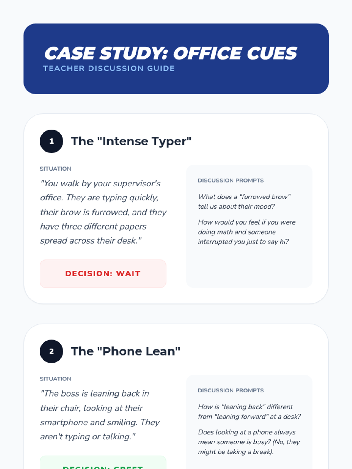 Students learn to observe social cues to determine the appropriate timing for a greeting, focusing on non-verbal "Do Not Disturb" signs and polite entry points.