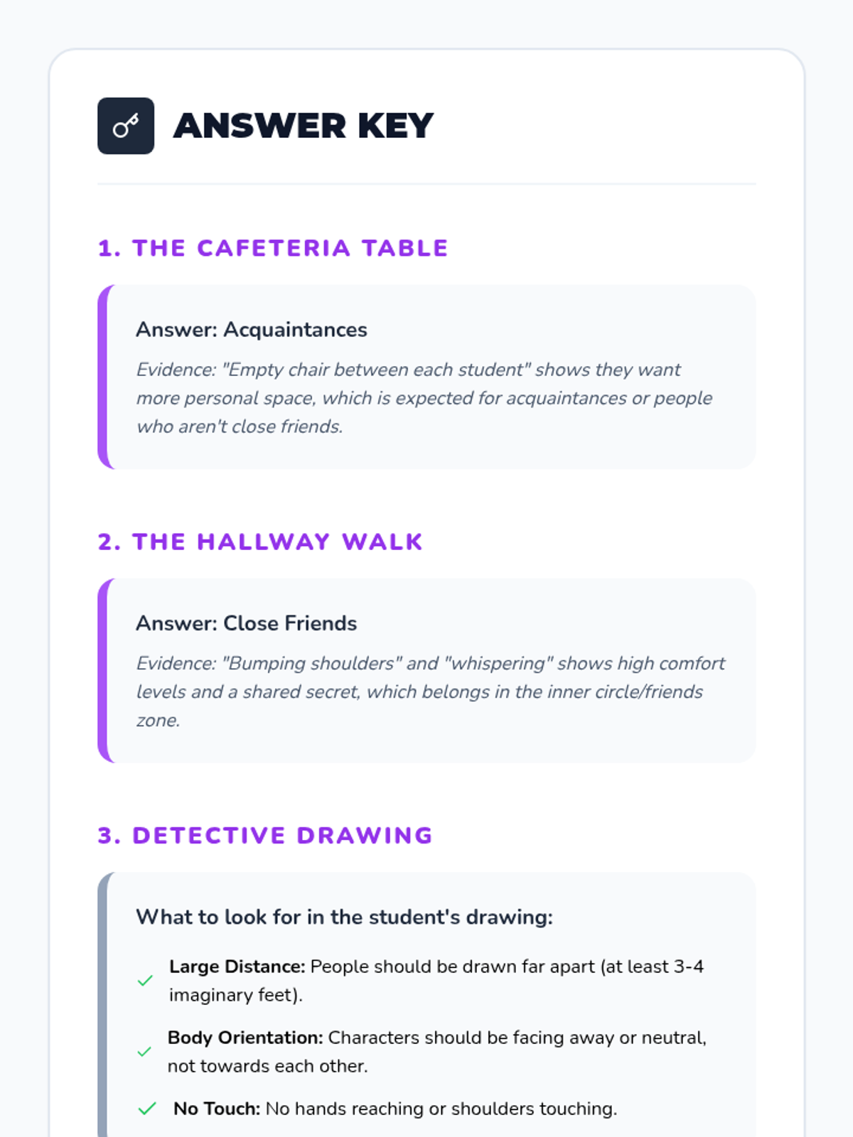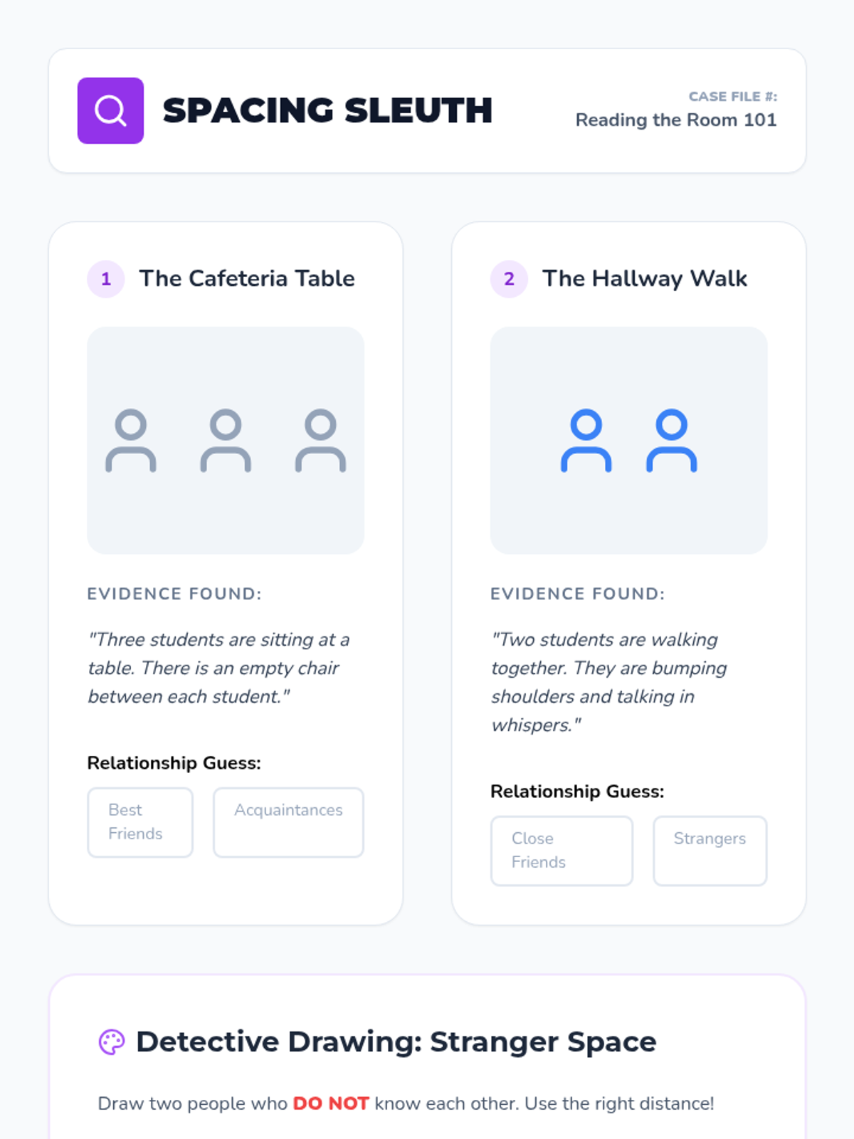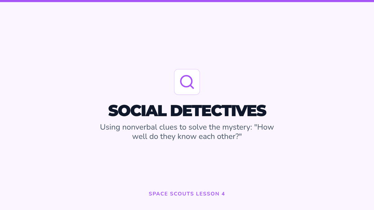 Students become 'social detectives' by observing nonverbal cues (like distance and foot positioning) to infer the relationships between people in photos. They learn to read the room to understand social dynamics.