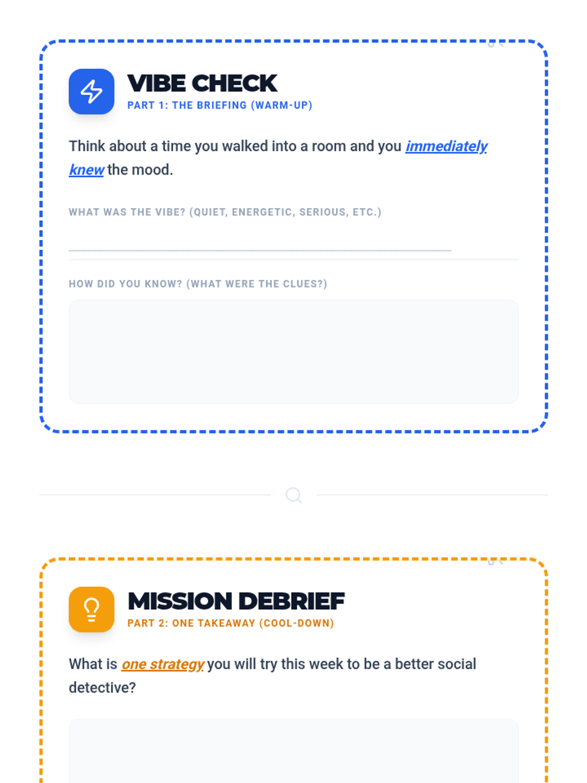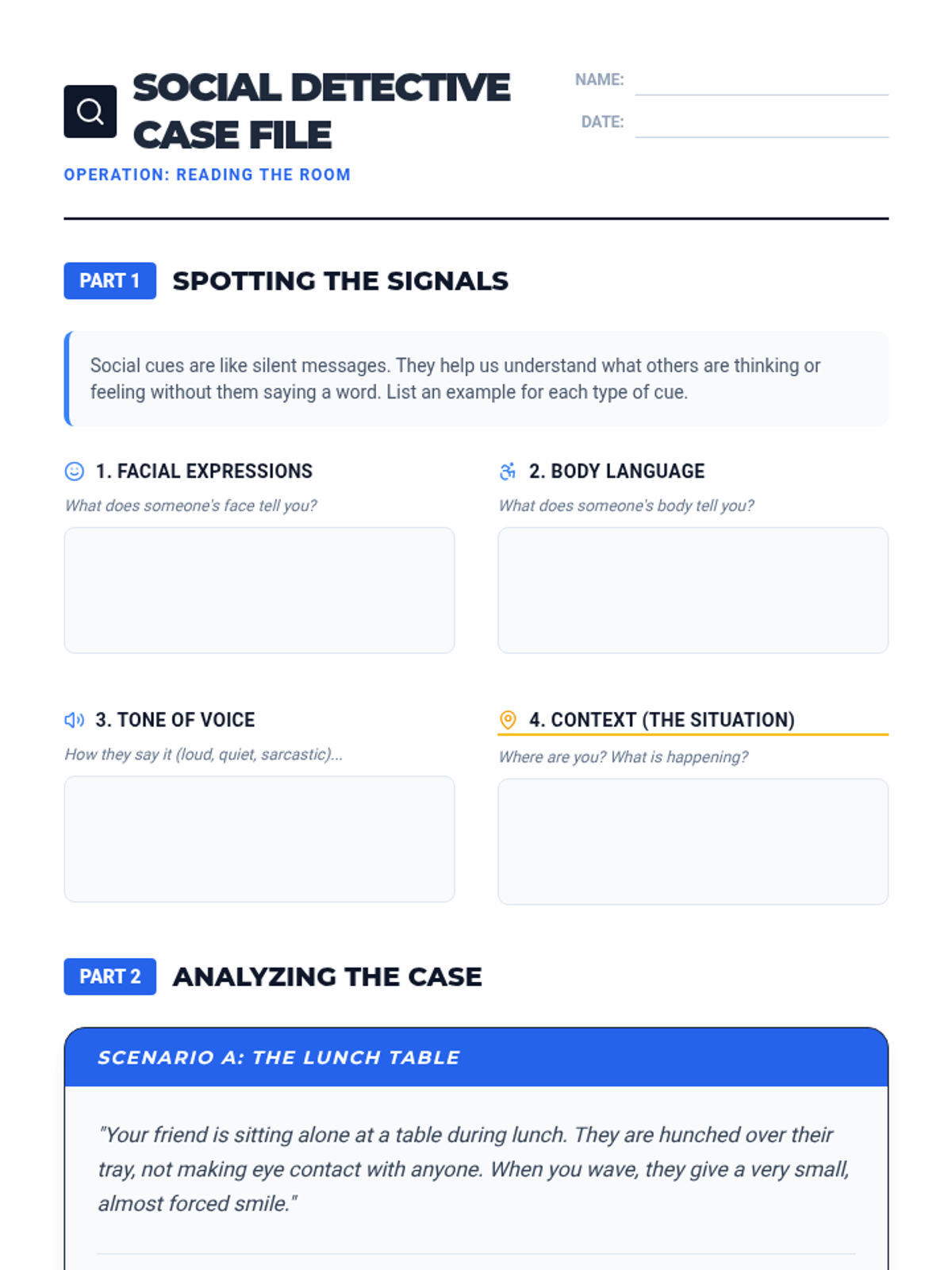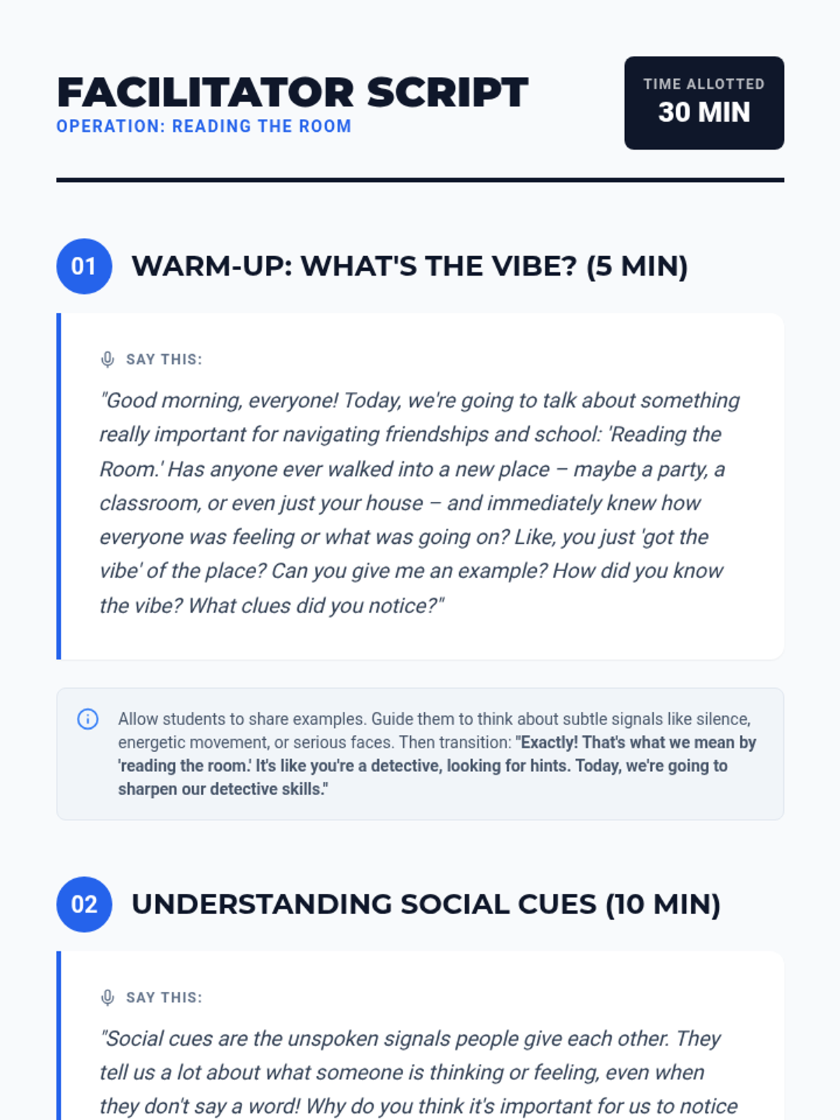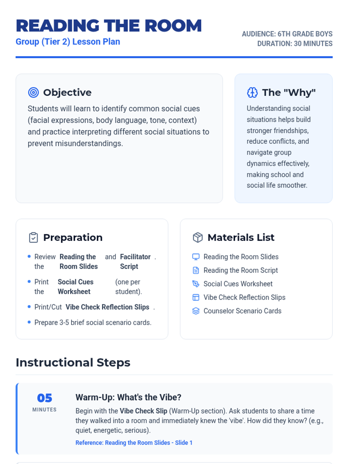 A 30-minute counselor-led session for 6th-grade boys focused on identifying and interpreting social cues to navigate group dynamics and avoid misunderstandings.