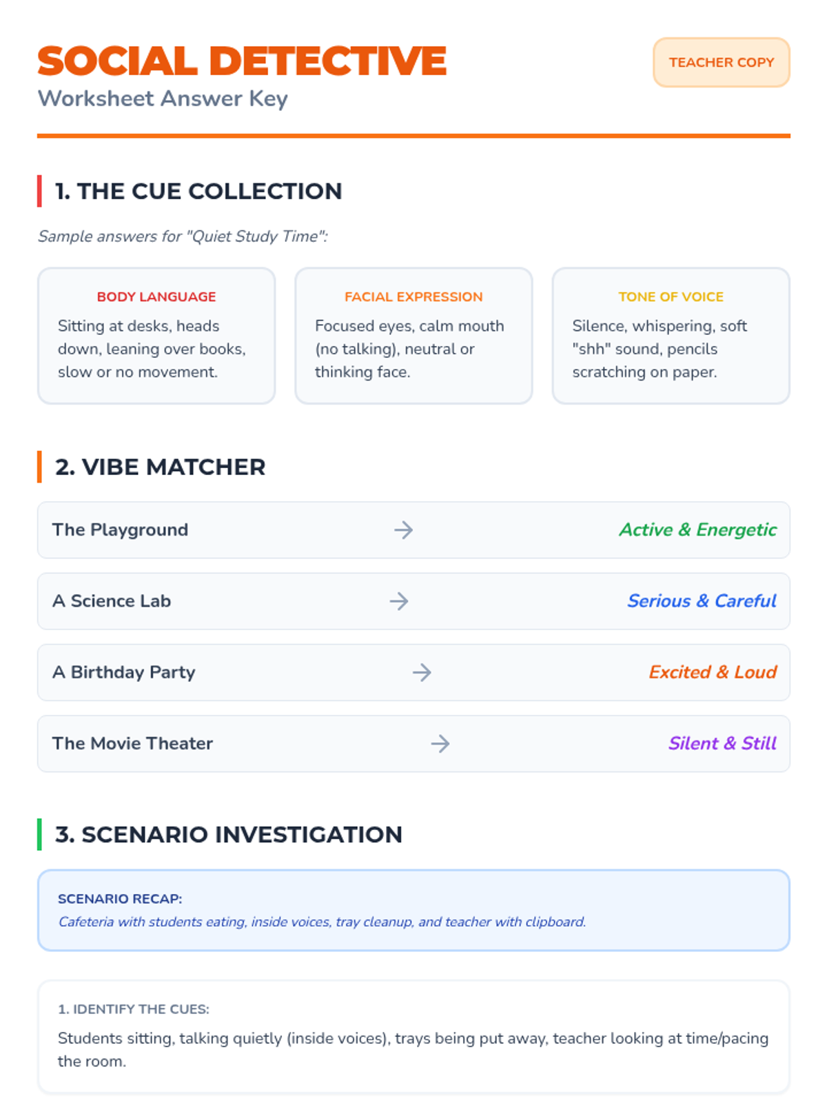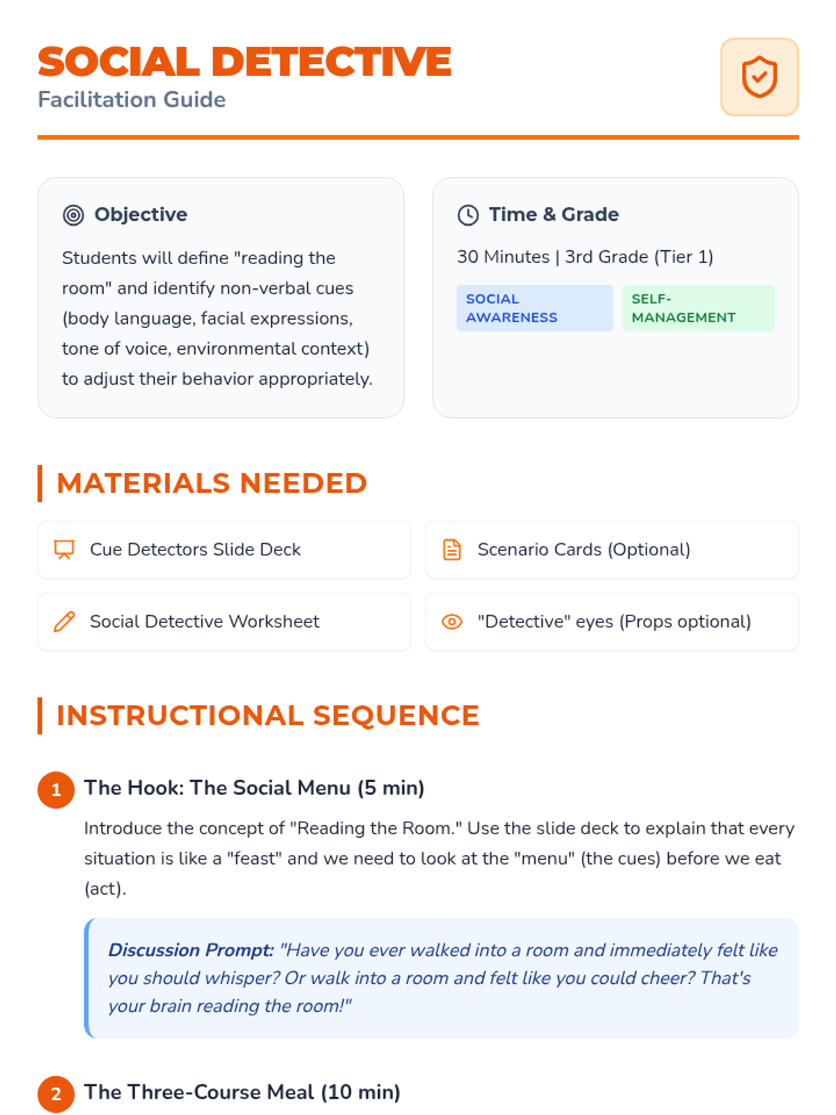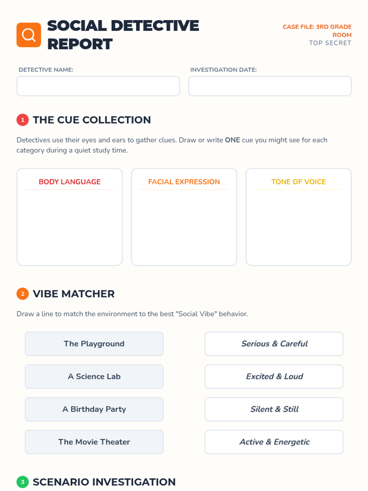 An engaging 30-minute social-emotional learning lesson for 3rd graders on 'reading the room' by interpreting non-verbal cues, body language, and environmental context.