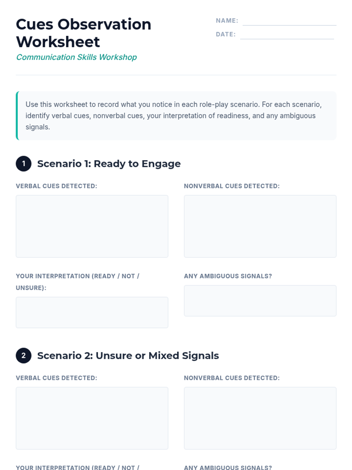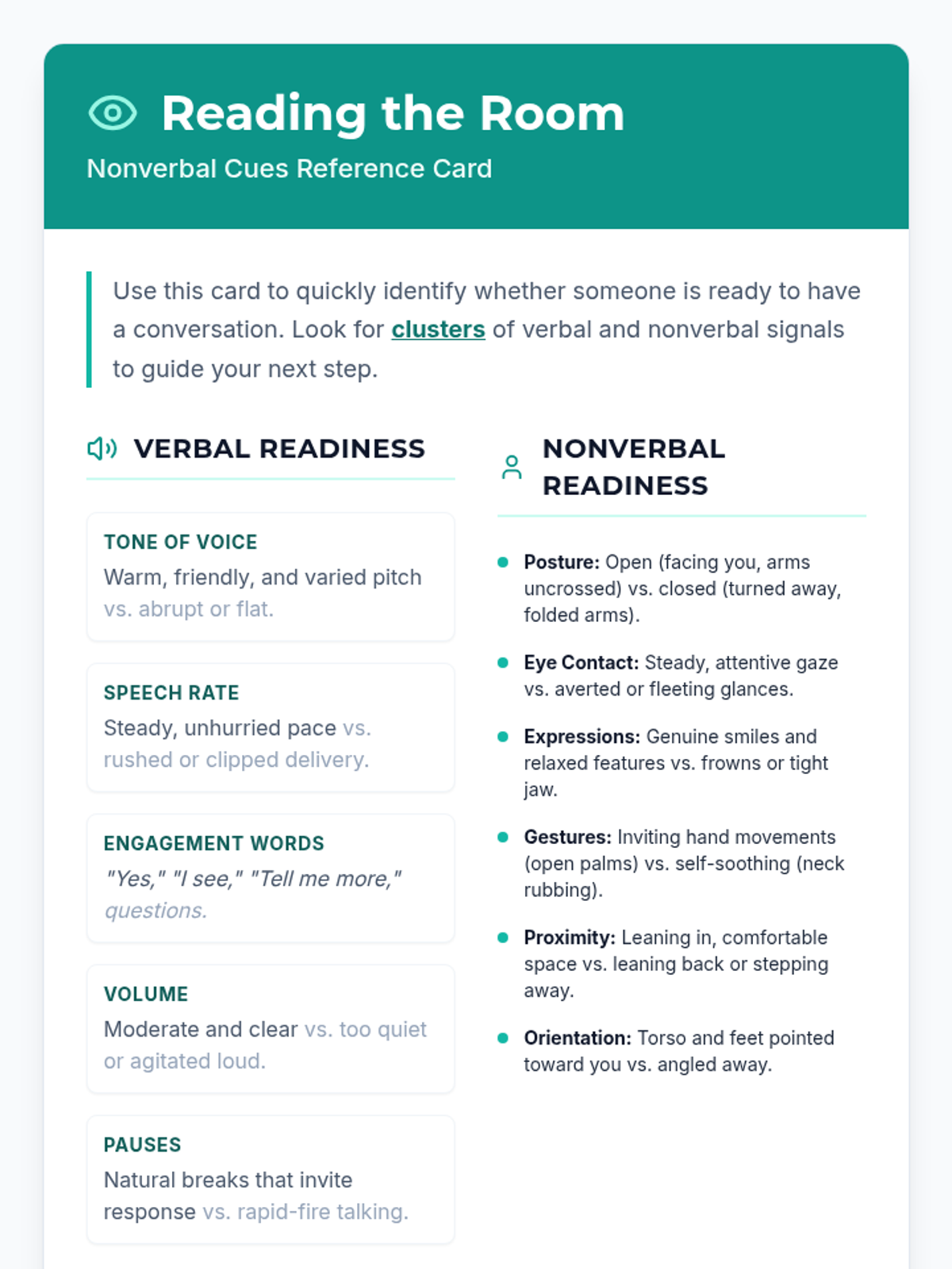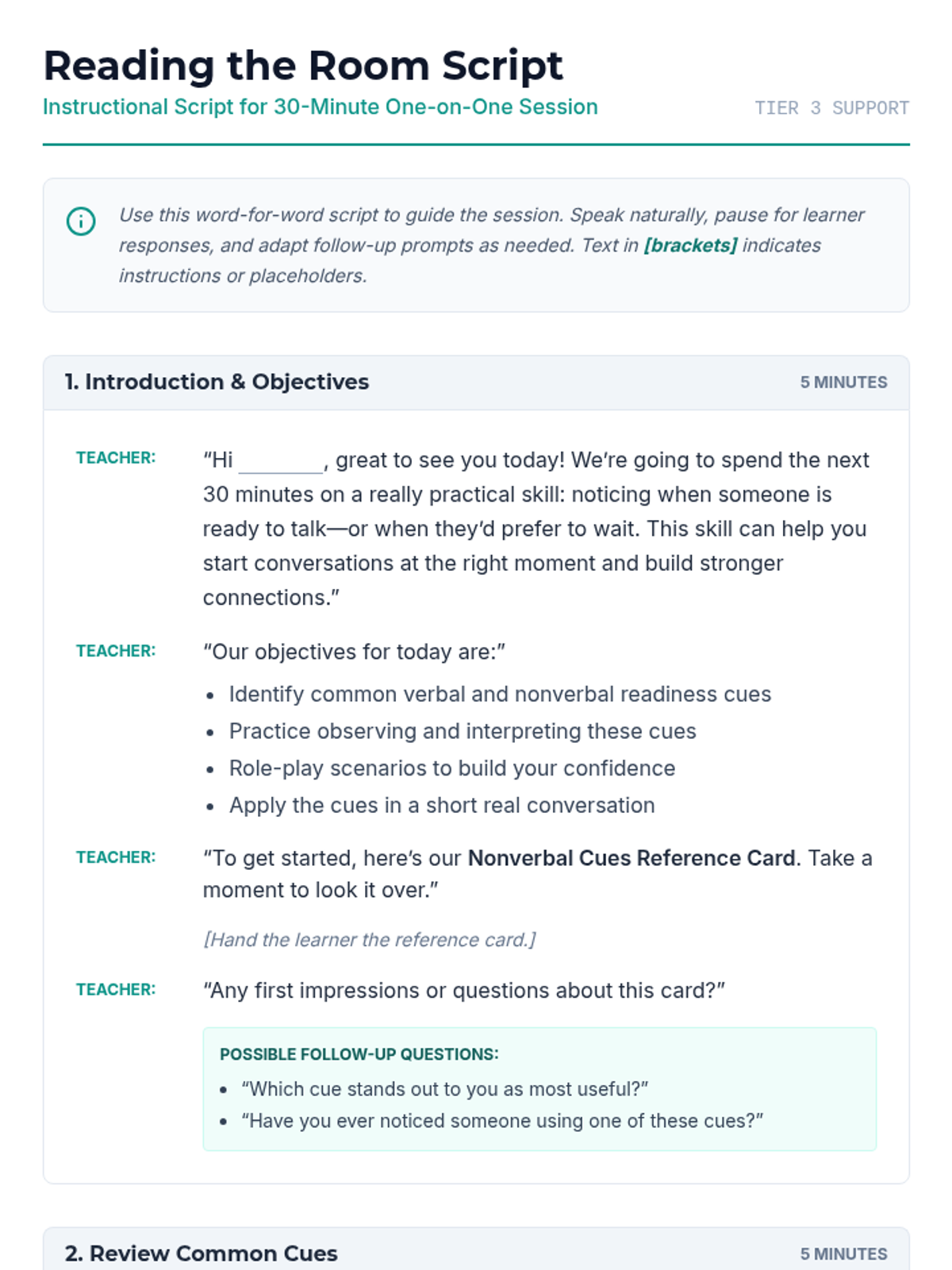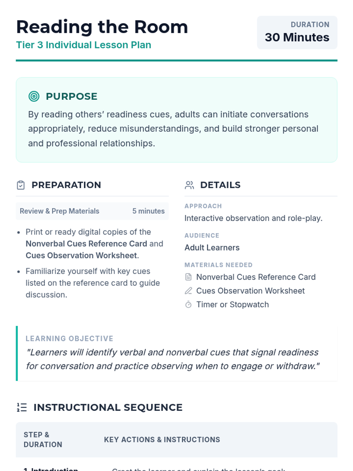 A 30-minute individual lesson for adult learners focused on identifying verbal and nonverbal readiness cues to improve communication and social interaction.