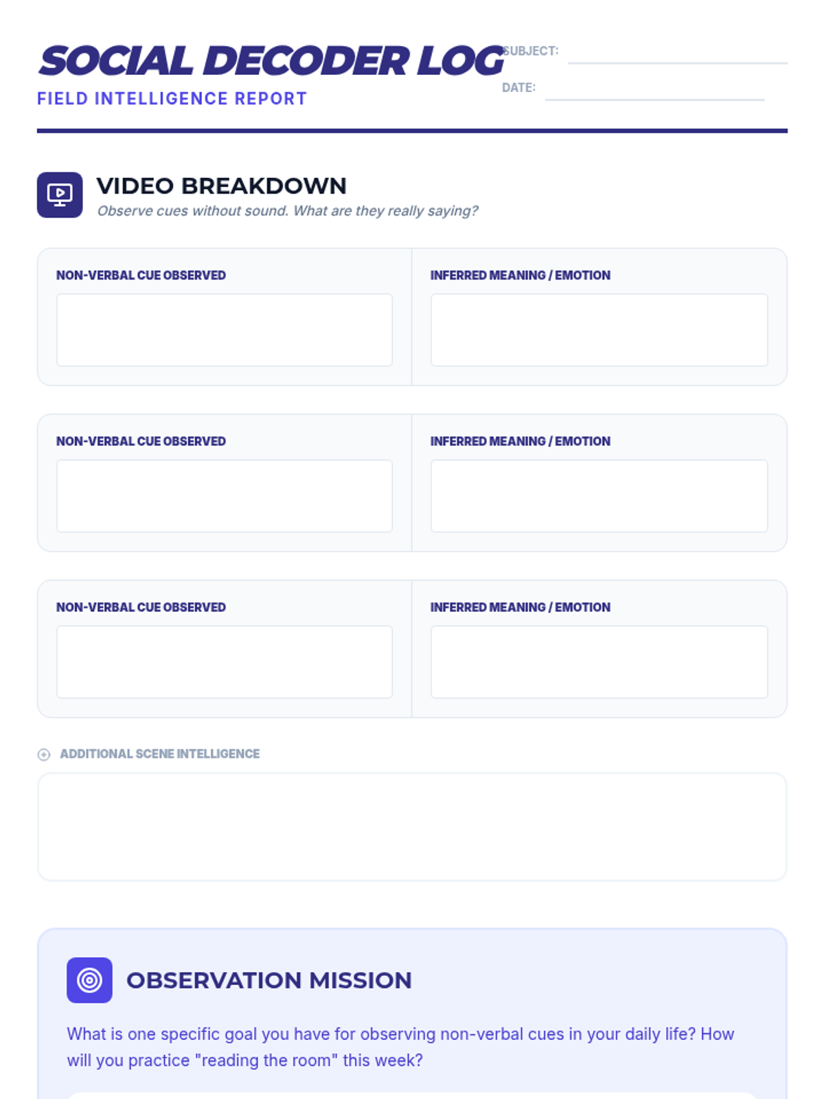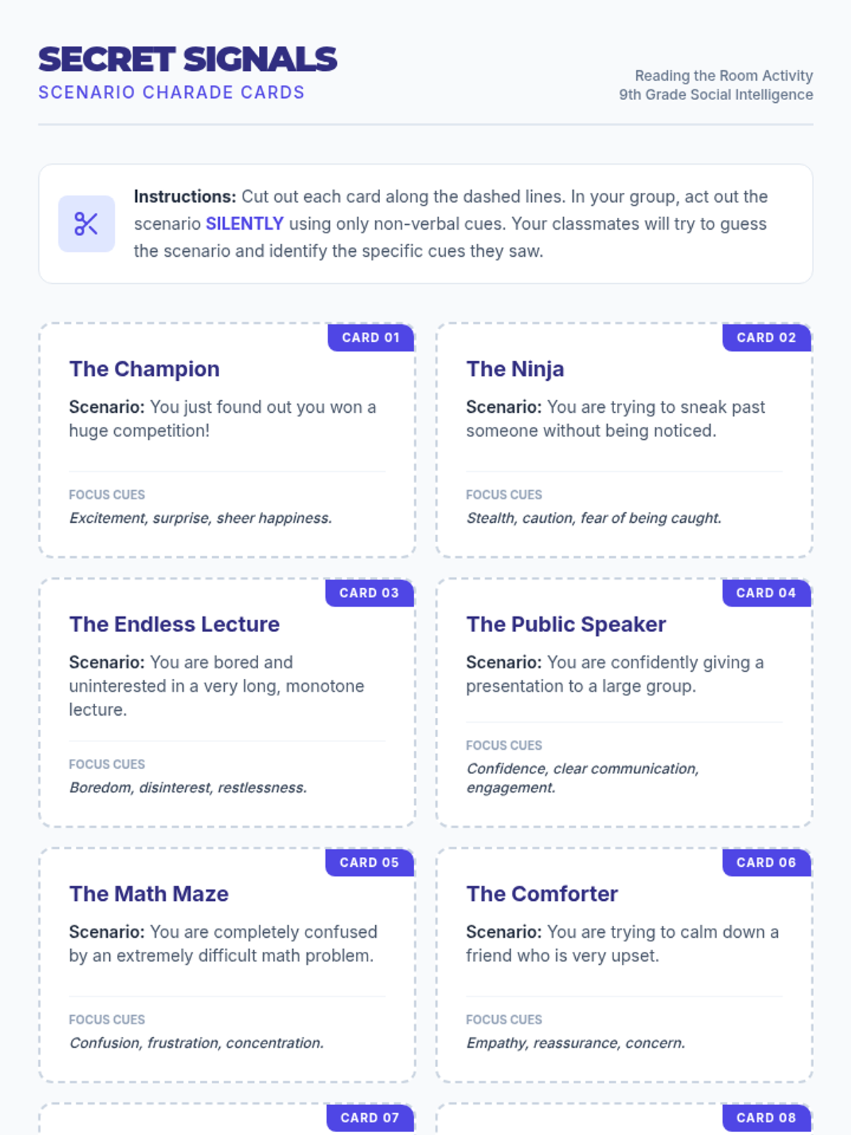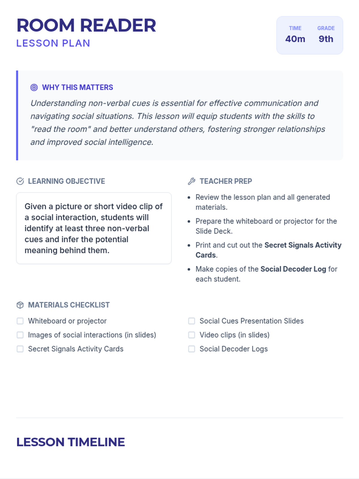 A 40-minute lesson for 9th graders to develop social intelligence by identifying and interpreting non-verbal cues like body language, facial expressions, and context.