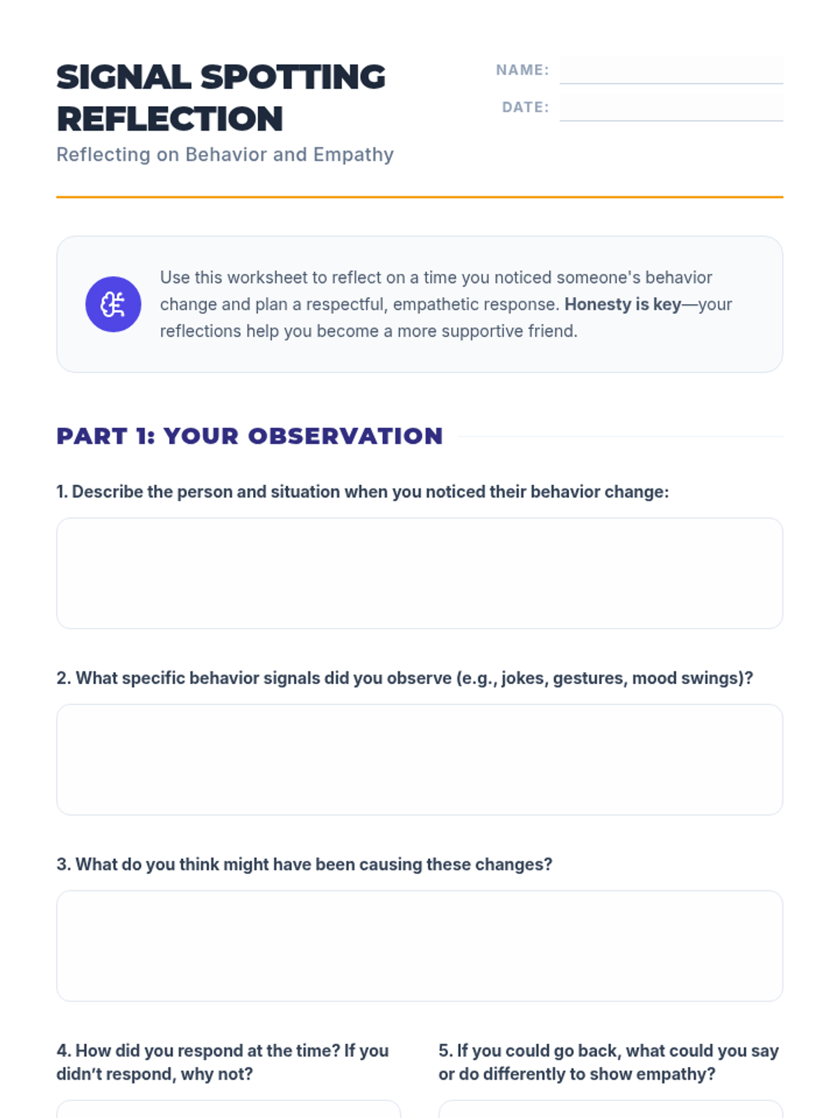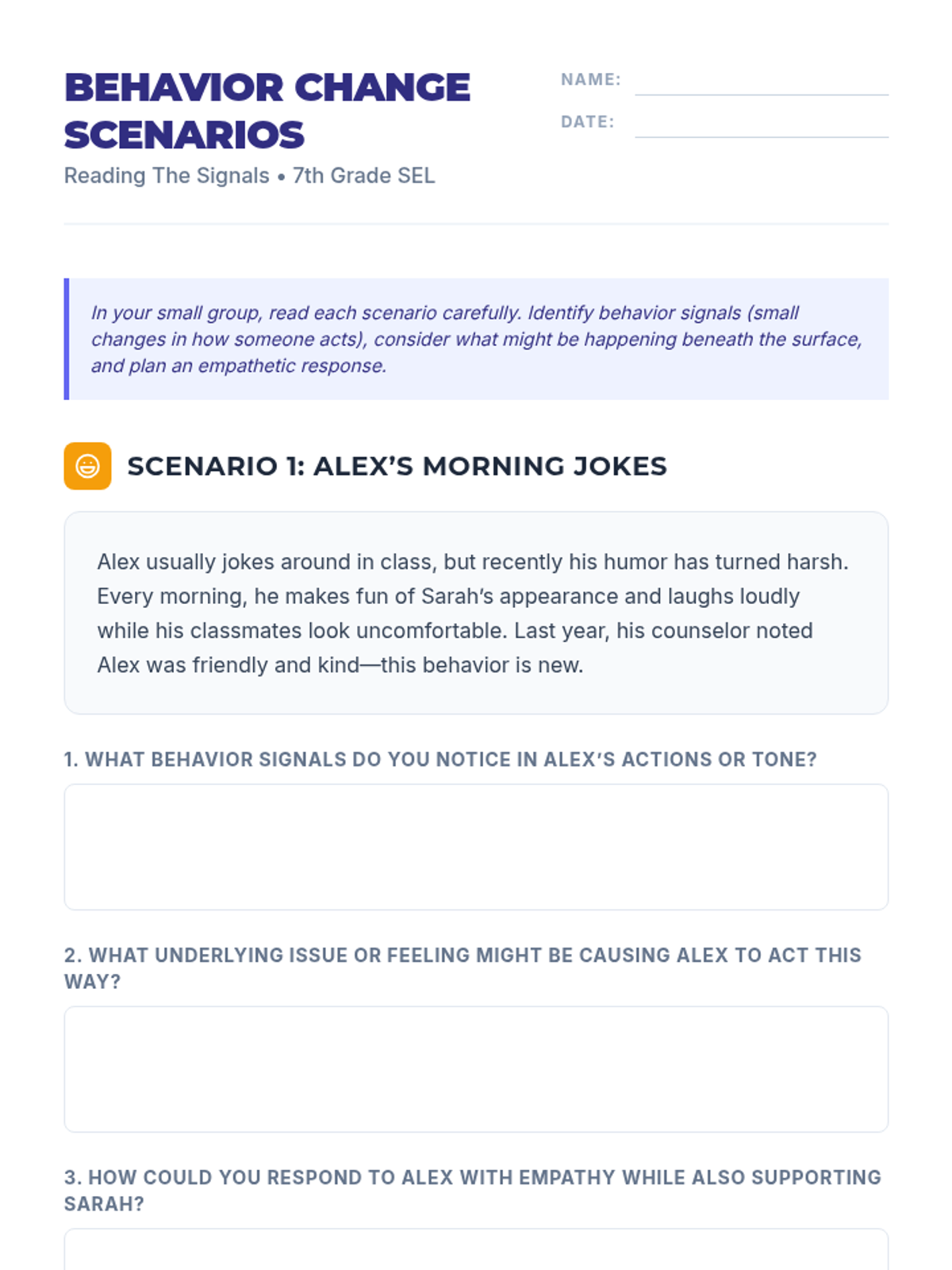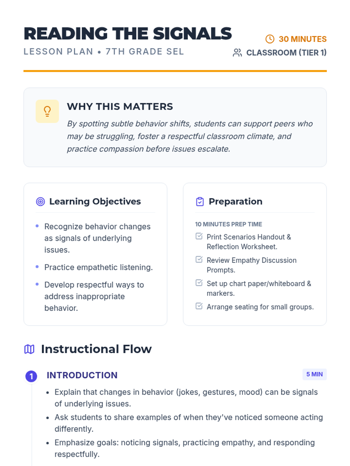 A 30-minute 7th-grade SEL lesson focused on recognizing behavior changes as signals for underlying issues and practicing empathy and respectful communication.
