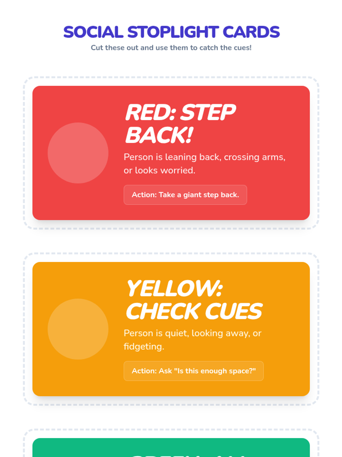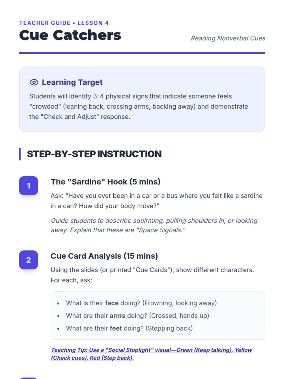 Using image cards and role-play, students identify nonverbal signs that someone feels crowded and practice the 'check and adjust' method.