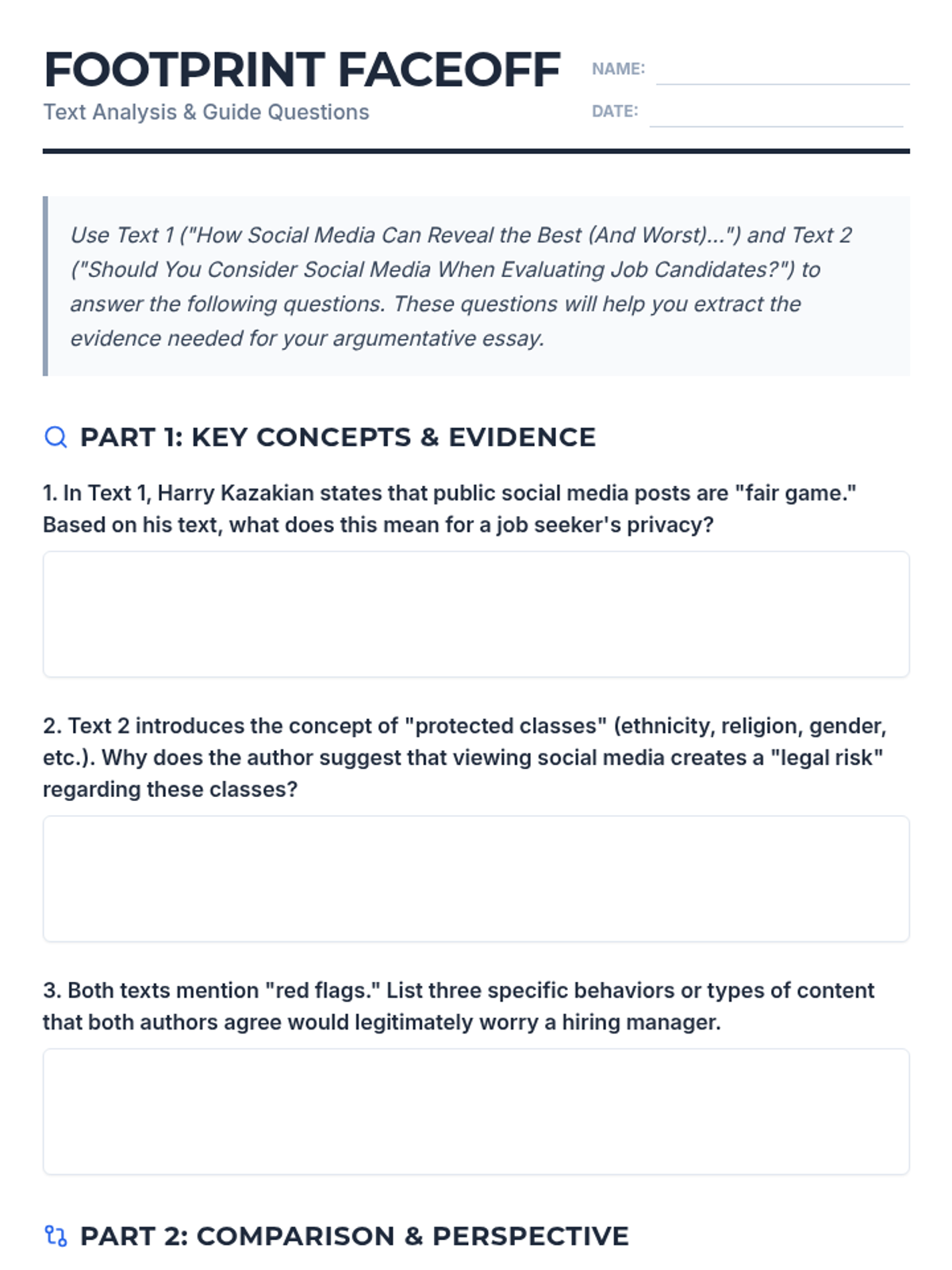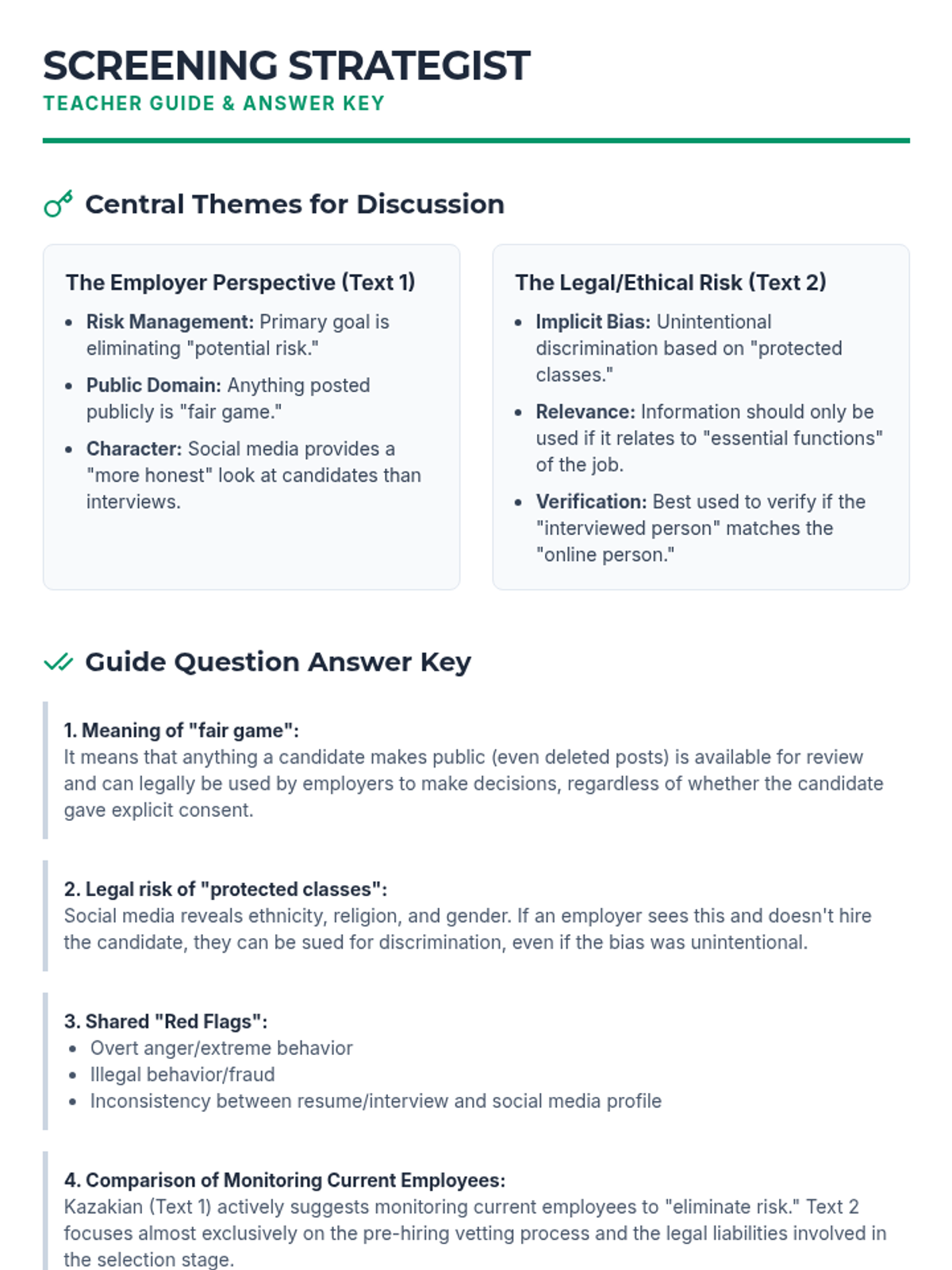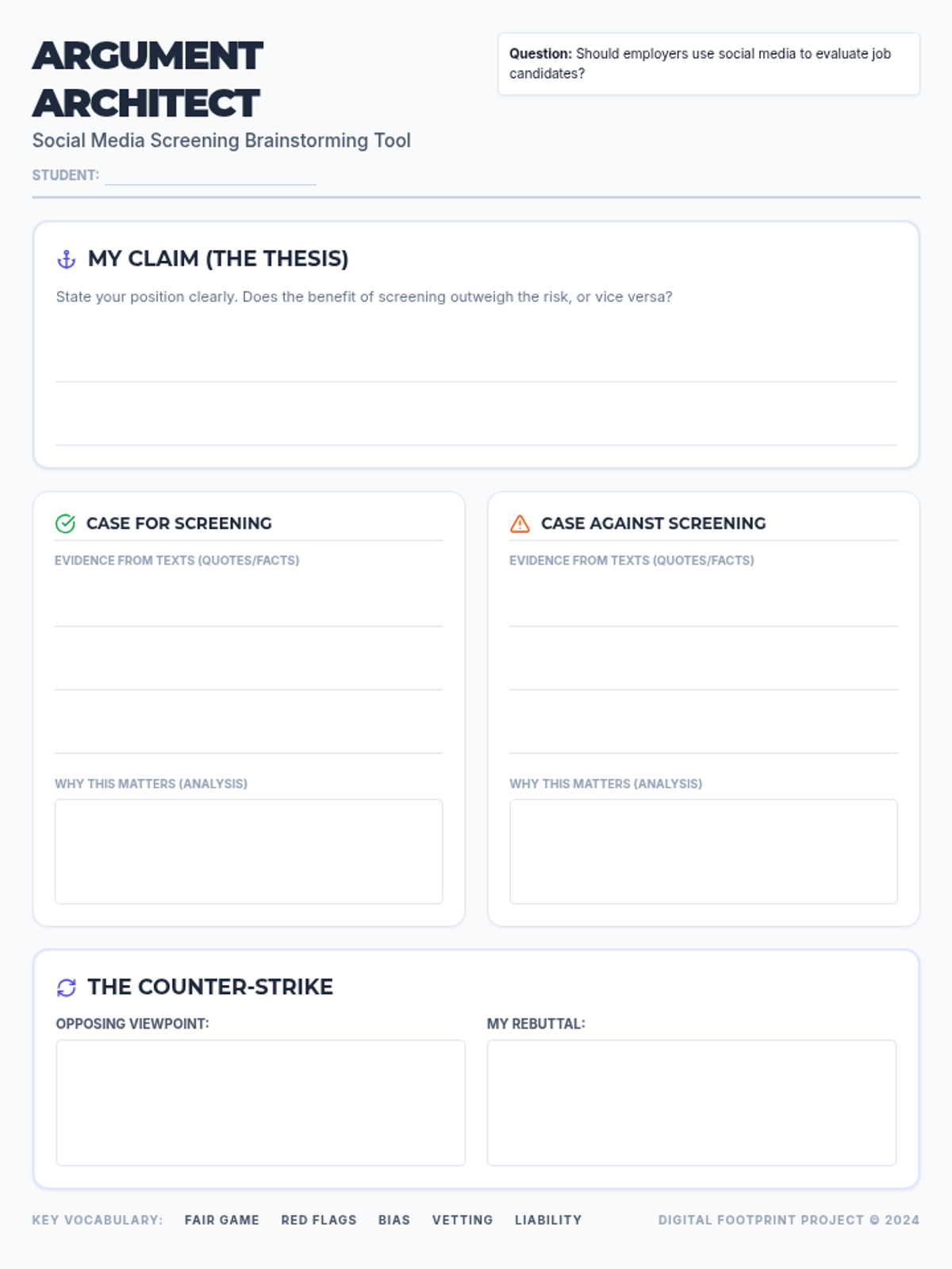 Students analyze two texts regarding social media screenings to identify arguments for and against the practice, preparing them to write a formal argumentative essay.