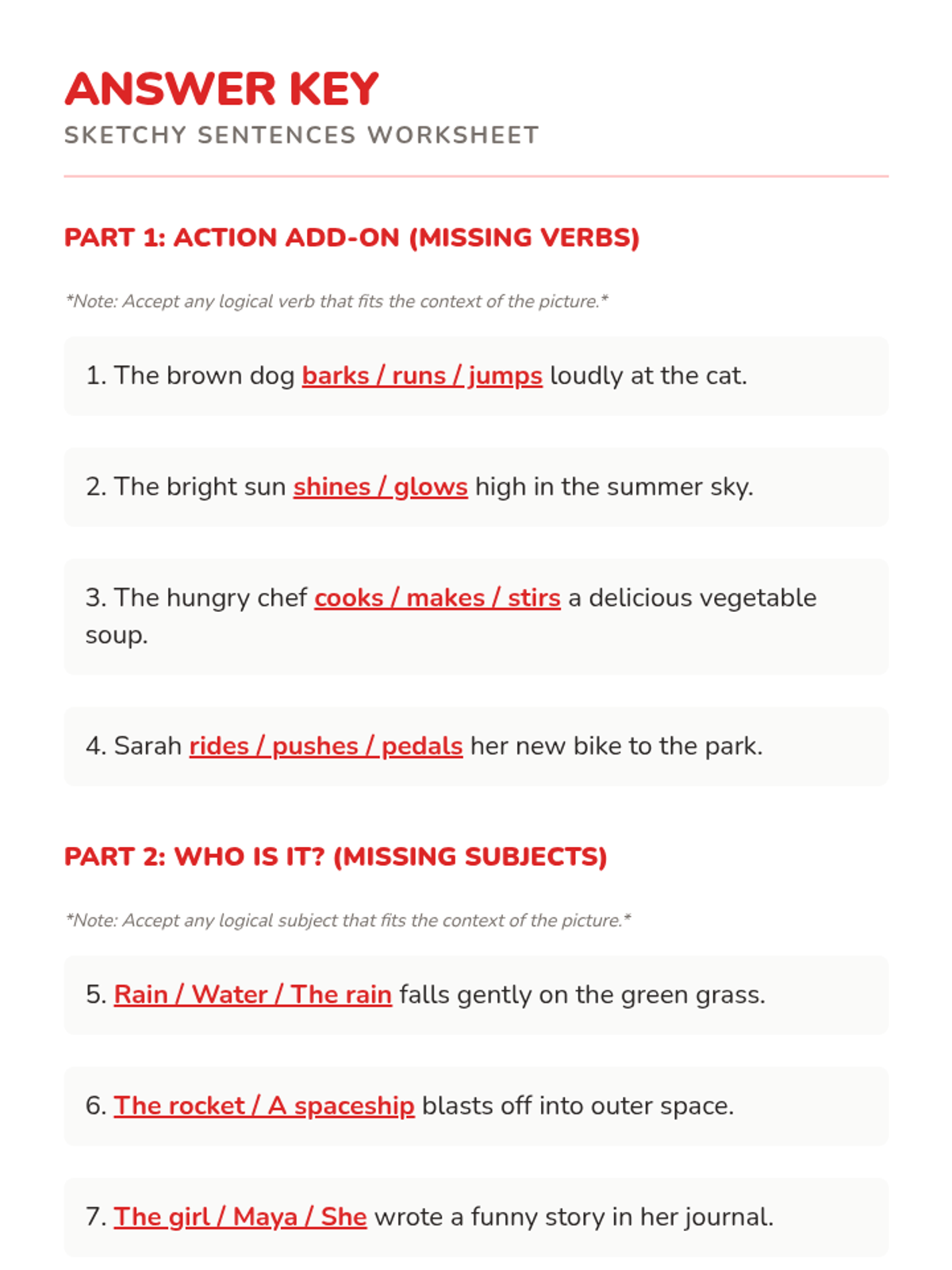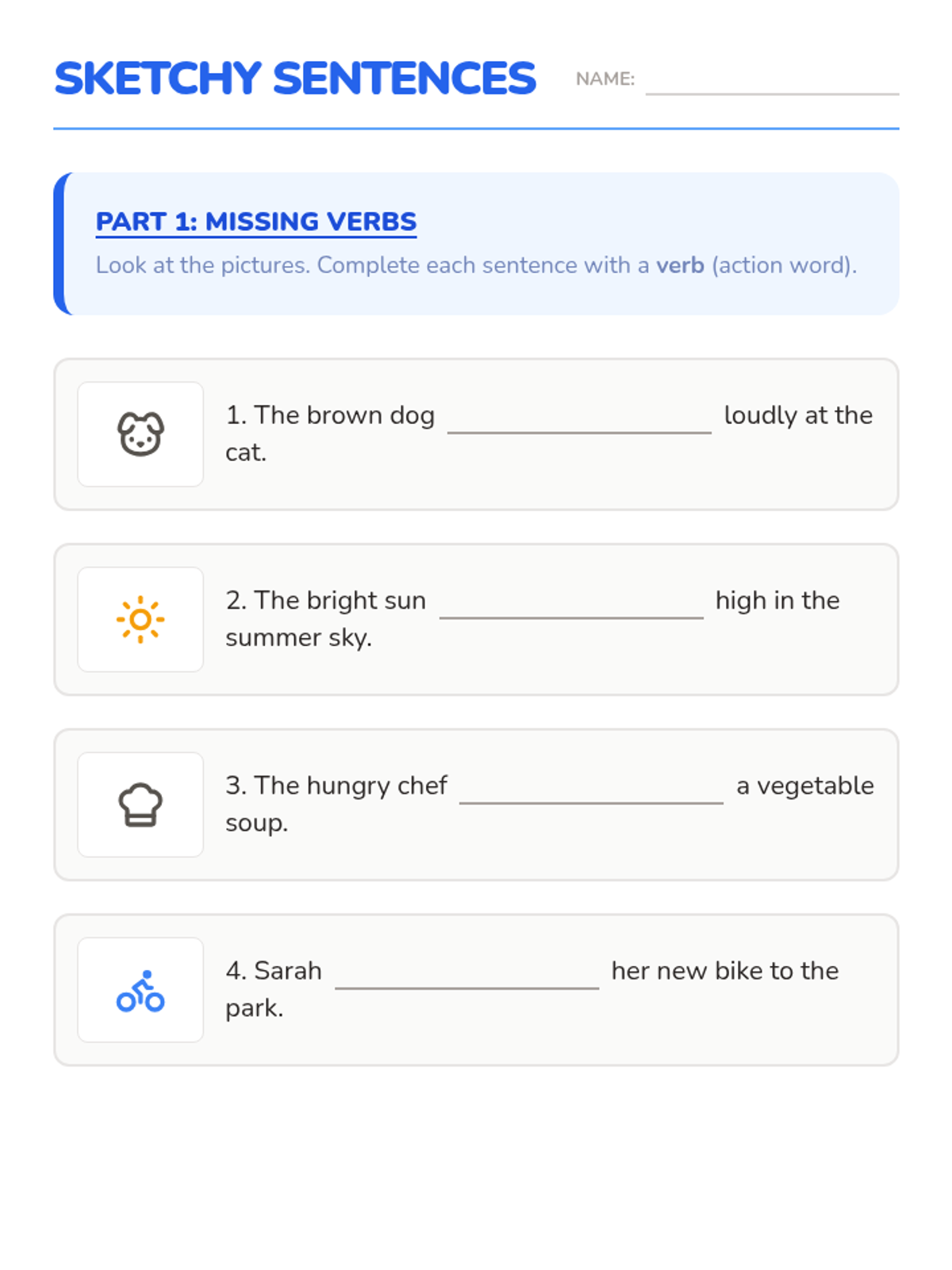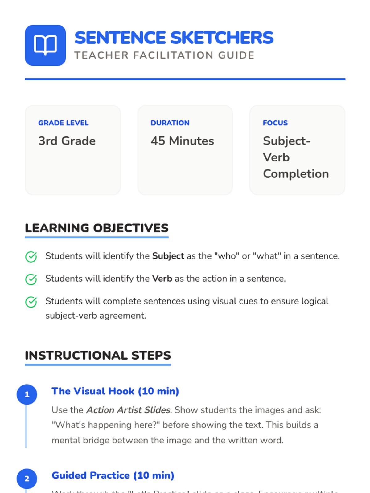 A lesson focused on building complete sentences by identifying and providing missing subjects or verbs, using visual prompts to spark creativity.