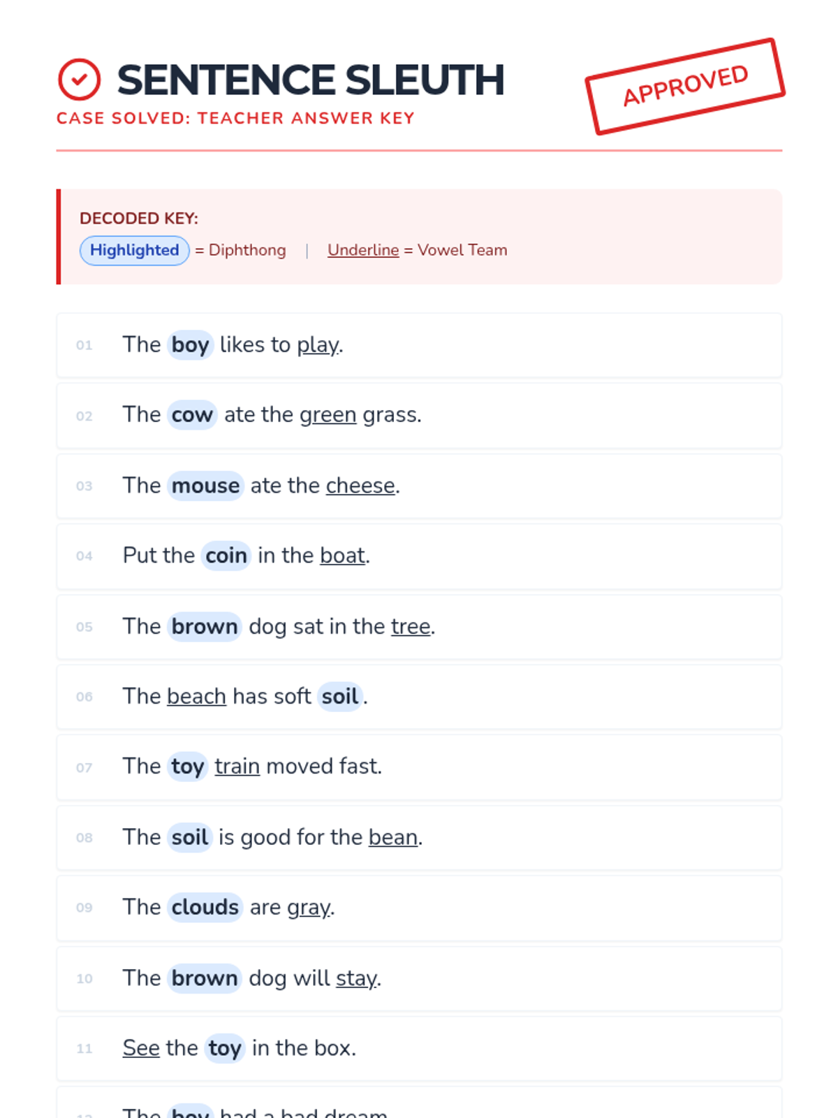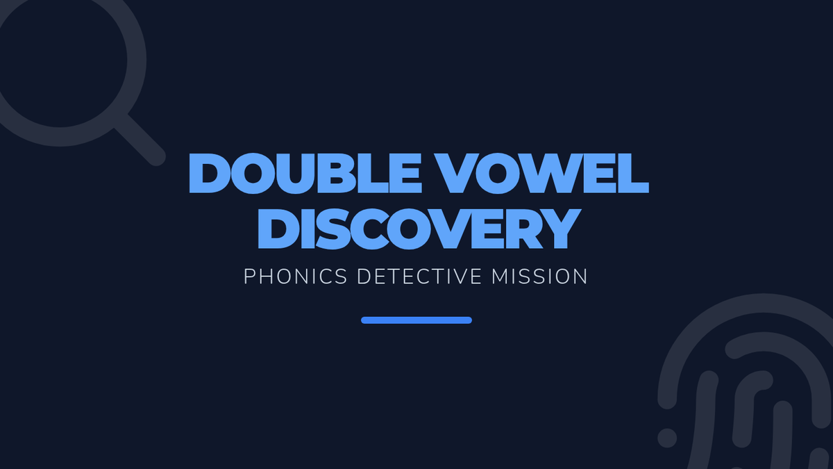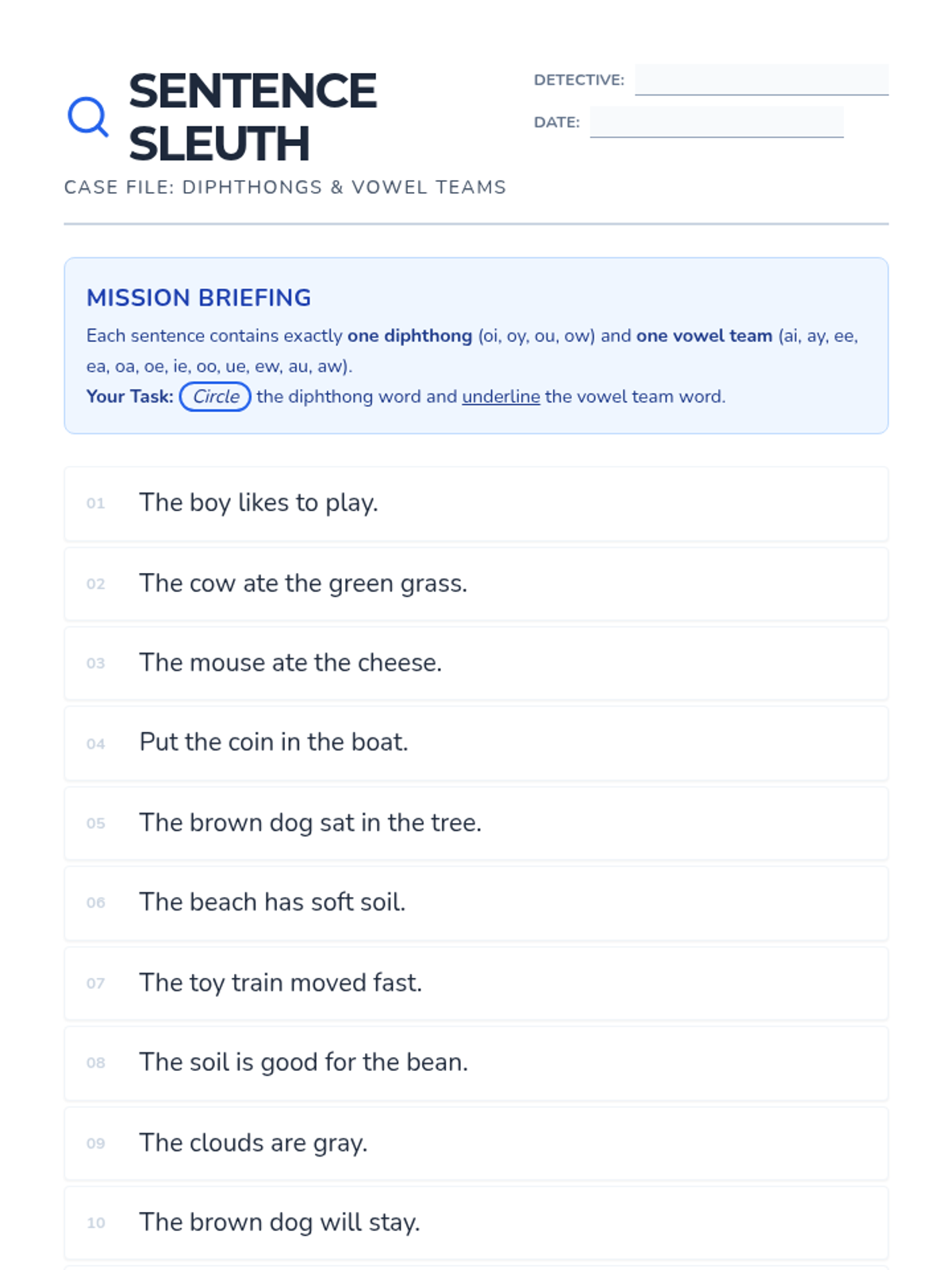 Students practice identifying specific vowel teams and diphthongs within simple sentences through a detective-themed decoding activity.
