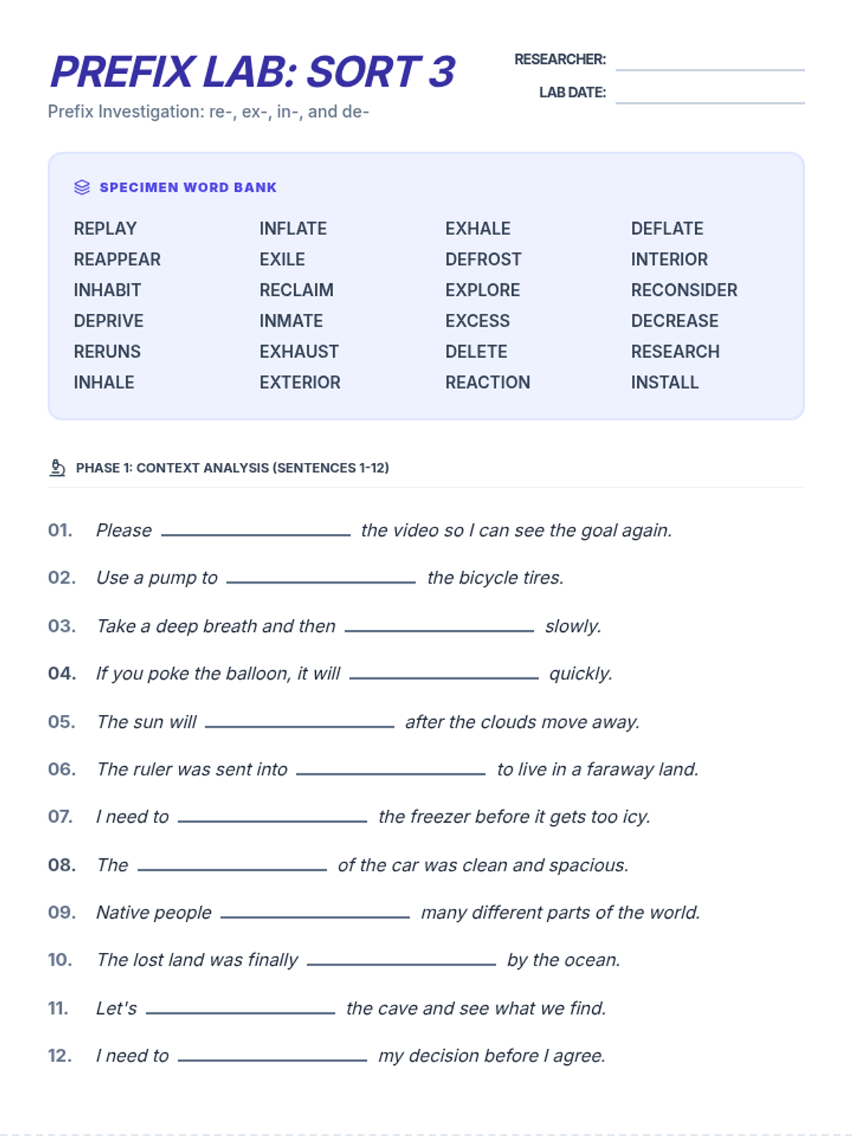 A lesson focused on the prefixes re-, ex-, in-, and de-. Students explore meanings like "again," "out," "in," and "down" through application.
