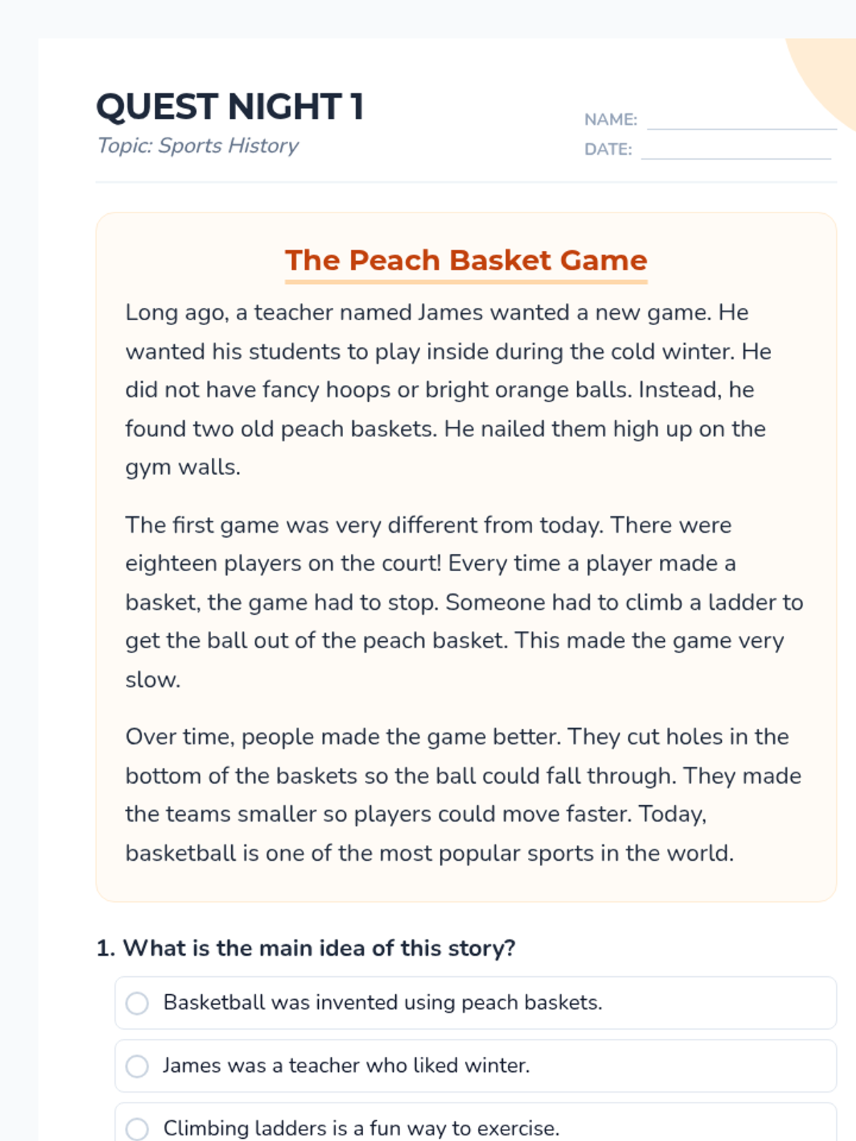 A 5-night homework packet designed for students with a 4th-grade interest level but reading at a 3rd-grade level. Each night features a high-interest passage about sports, technology, or video games, followed by targeted comprehension questions focusing on main idea, context clues, and inferential thinking.