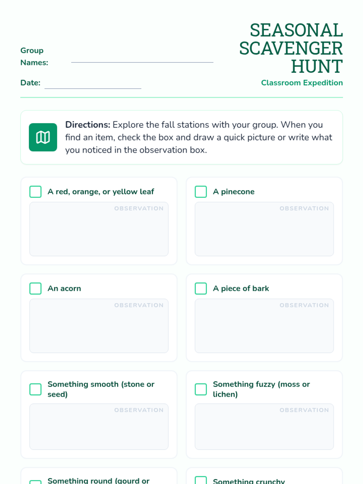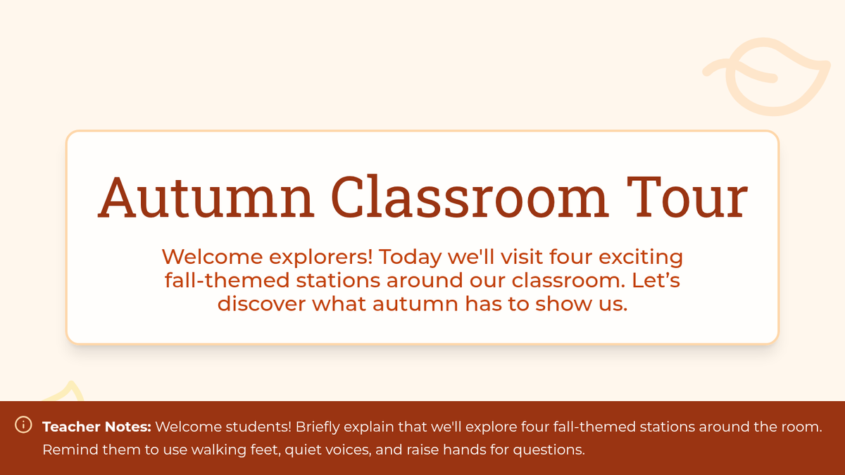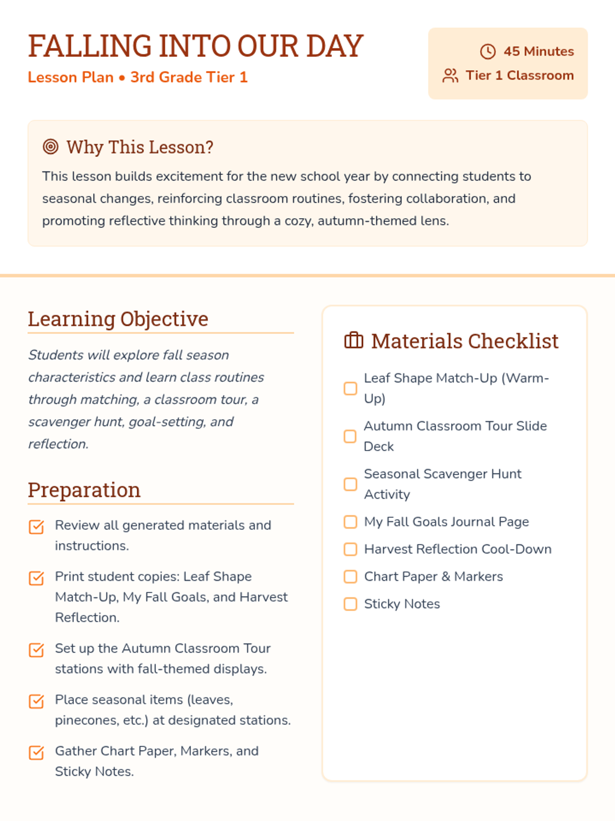 A 45-minute Tier 1 classroom lesson for 3rd graders that explores seasonal changes and classroom routines through interactive fall-themed activities. Students will engage in matching, a classroom tour, a scavenger hunt, goal-setting, and reflection.