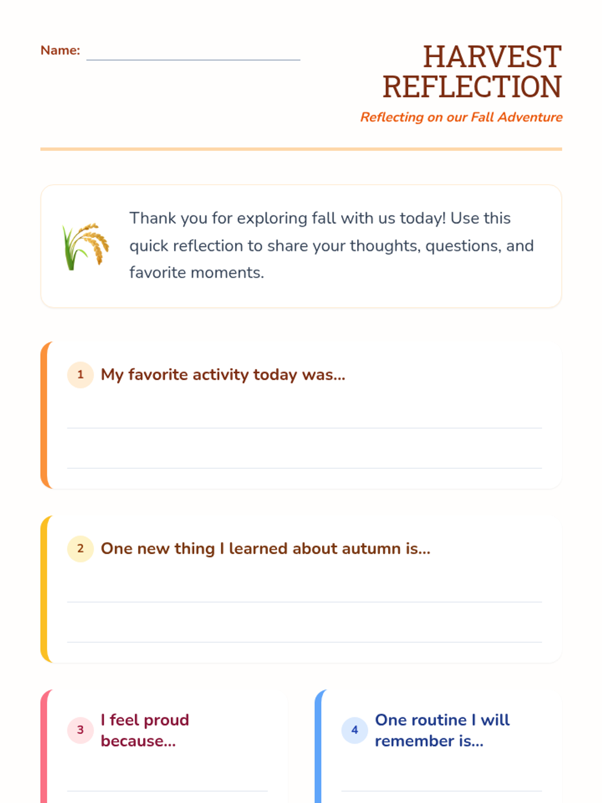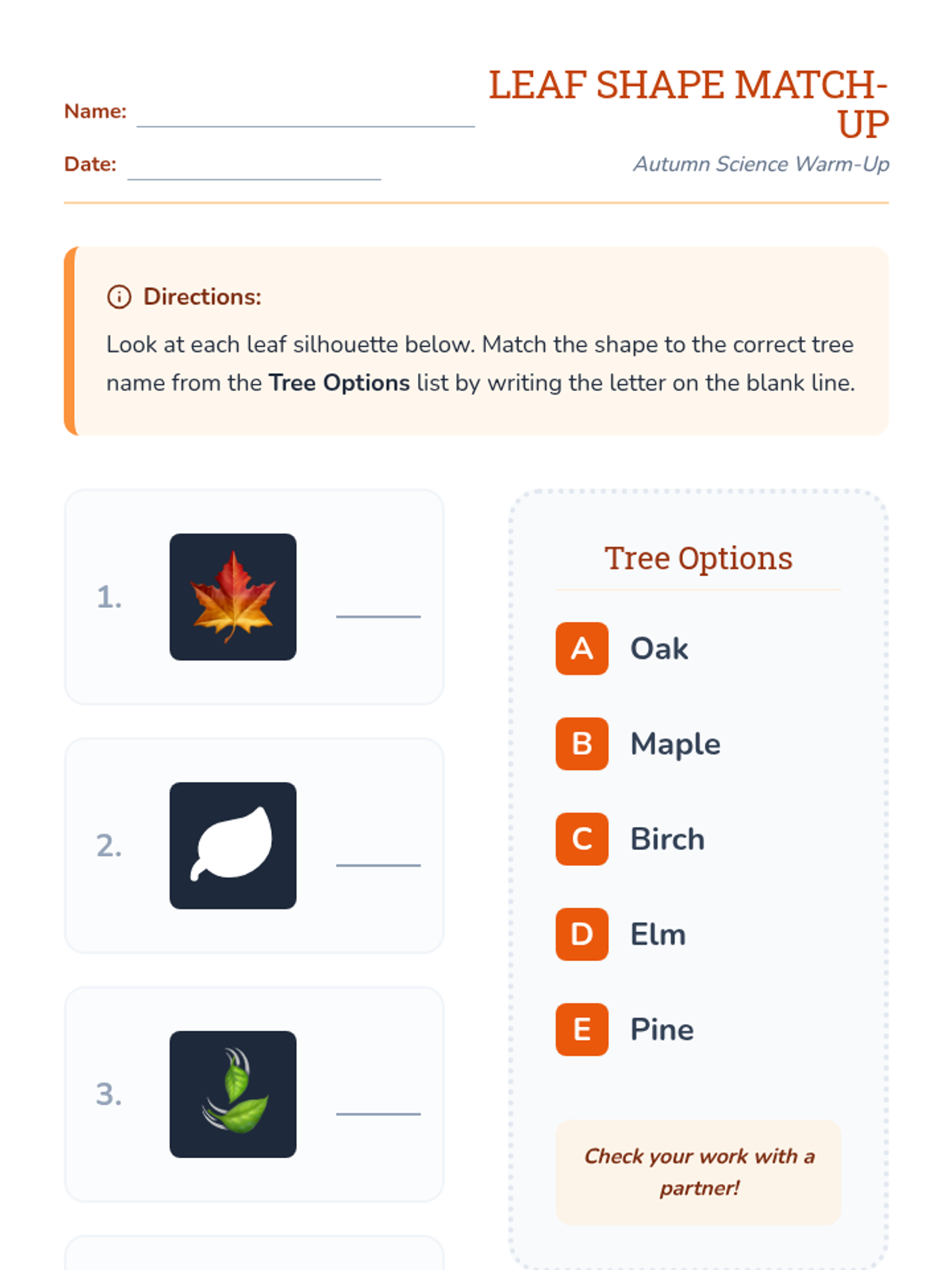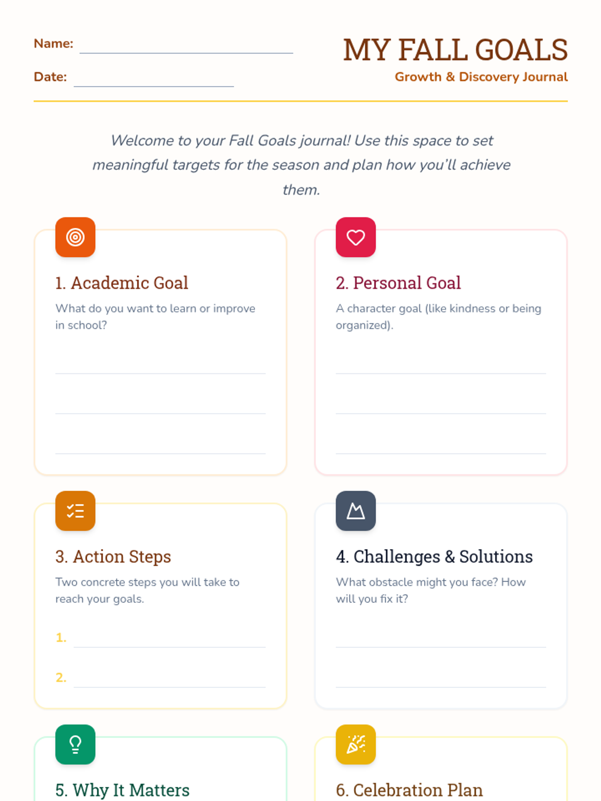 A 45-minute Tier 1 classroom lesson for 3rd graders that explores seasonal changes and classroom routines through interactive fall-themed activities. Students will engage in matching, a classroom tour, a scavenger hunt, goal-setting, and reflection.