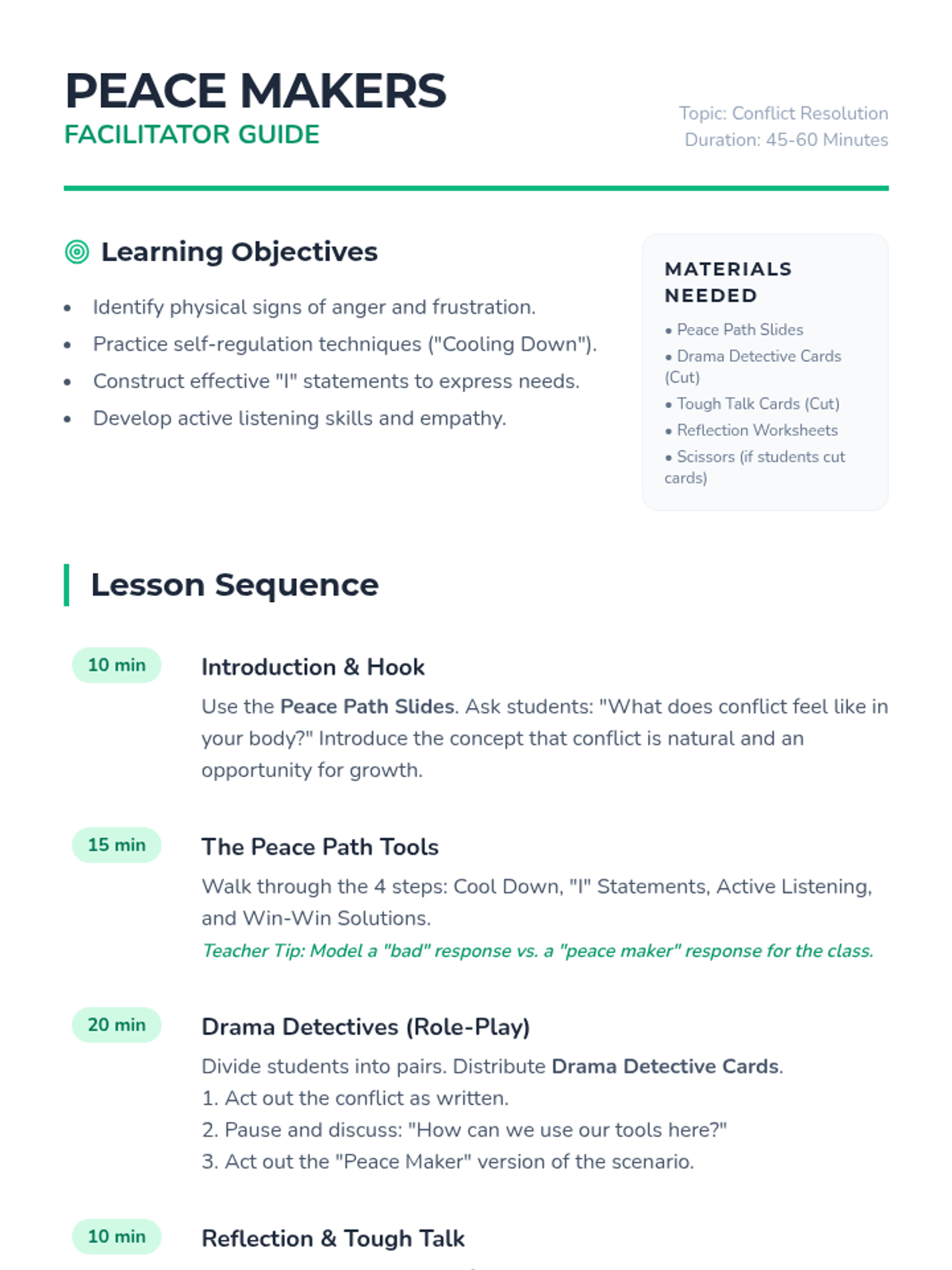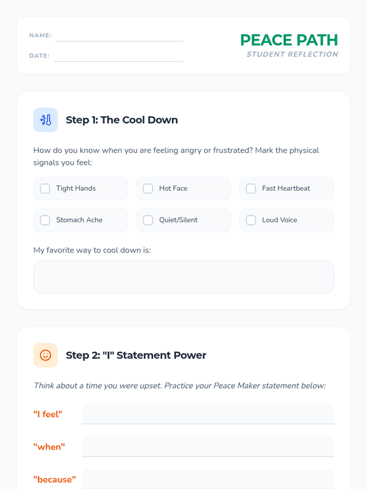 A comprehensive set of reflection and skill-building materials for 3rd-grade students to address physical aggression and hurtful language. The lesson focuses on empathy, impulse control, and the 'Four-Part Apology' method.