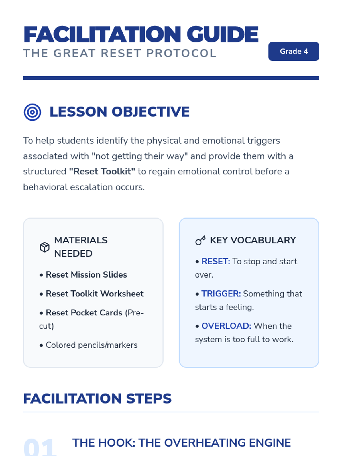 A lesson focused on helping students manage frustration when things don't go their way by using a 'Great Reset' toolkit of coping strategies.