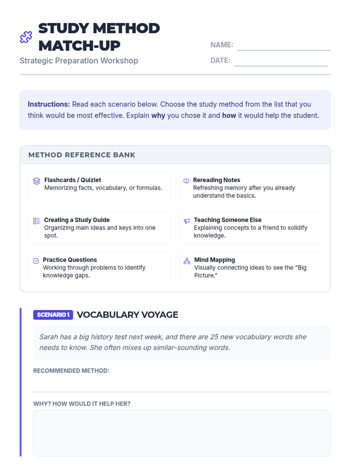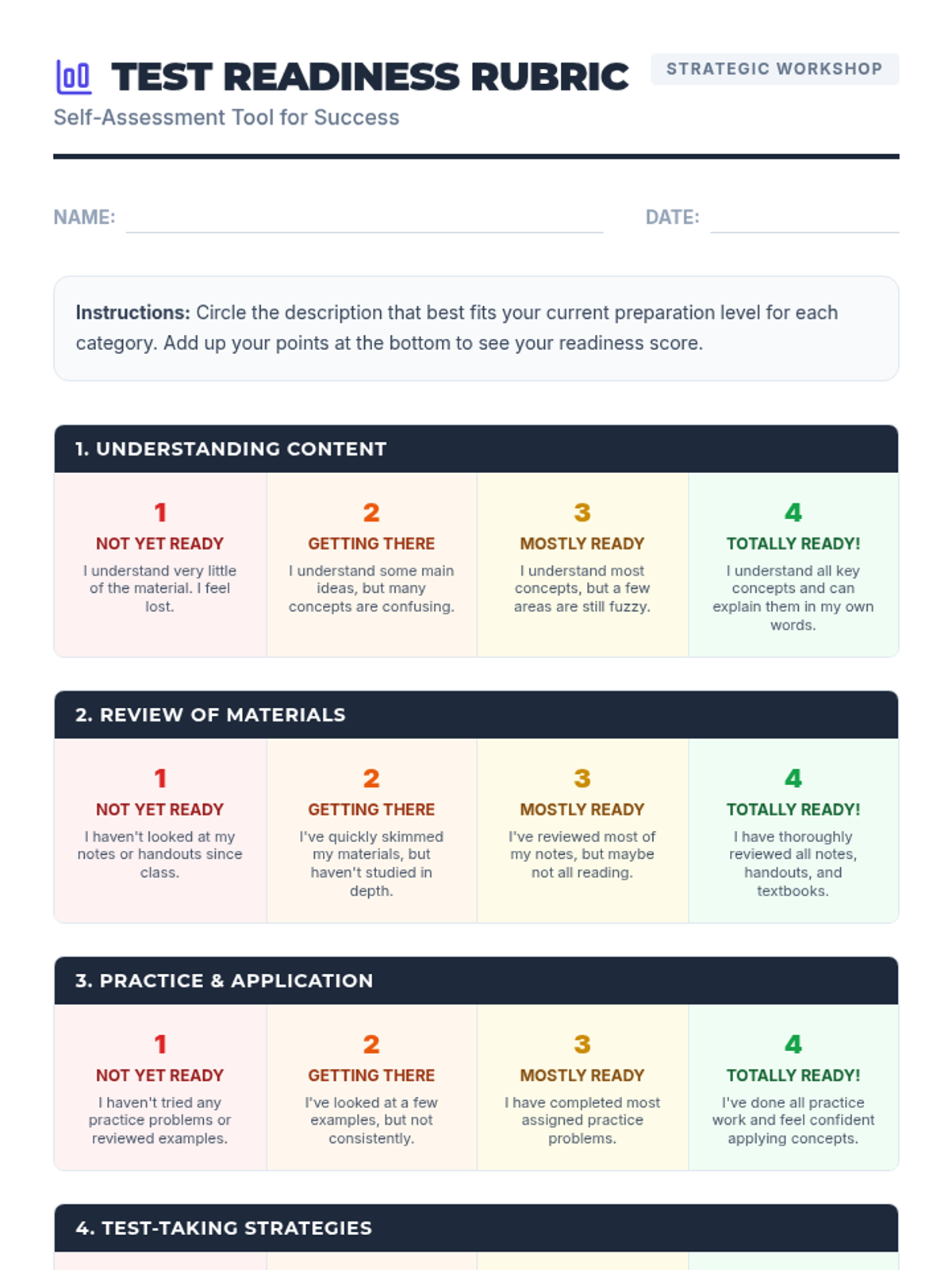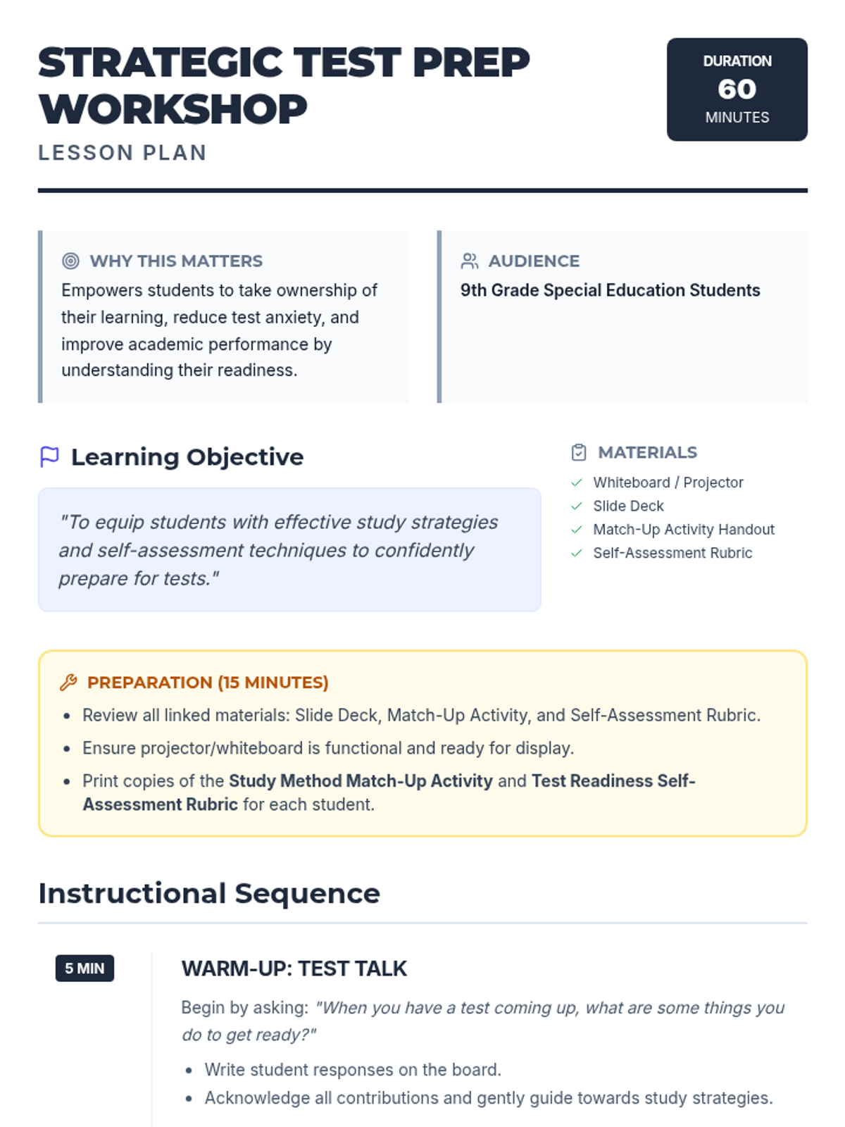 A 60-minute workshop for 9th-grade special education students to develop practical study strategies and self-assessment skills to build test-taking confidence and reduce anxiety.