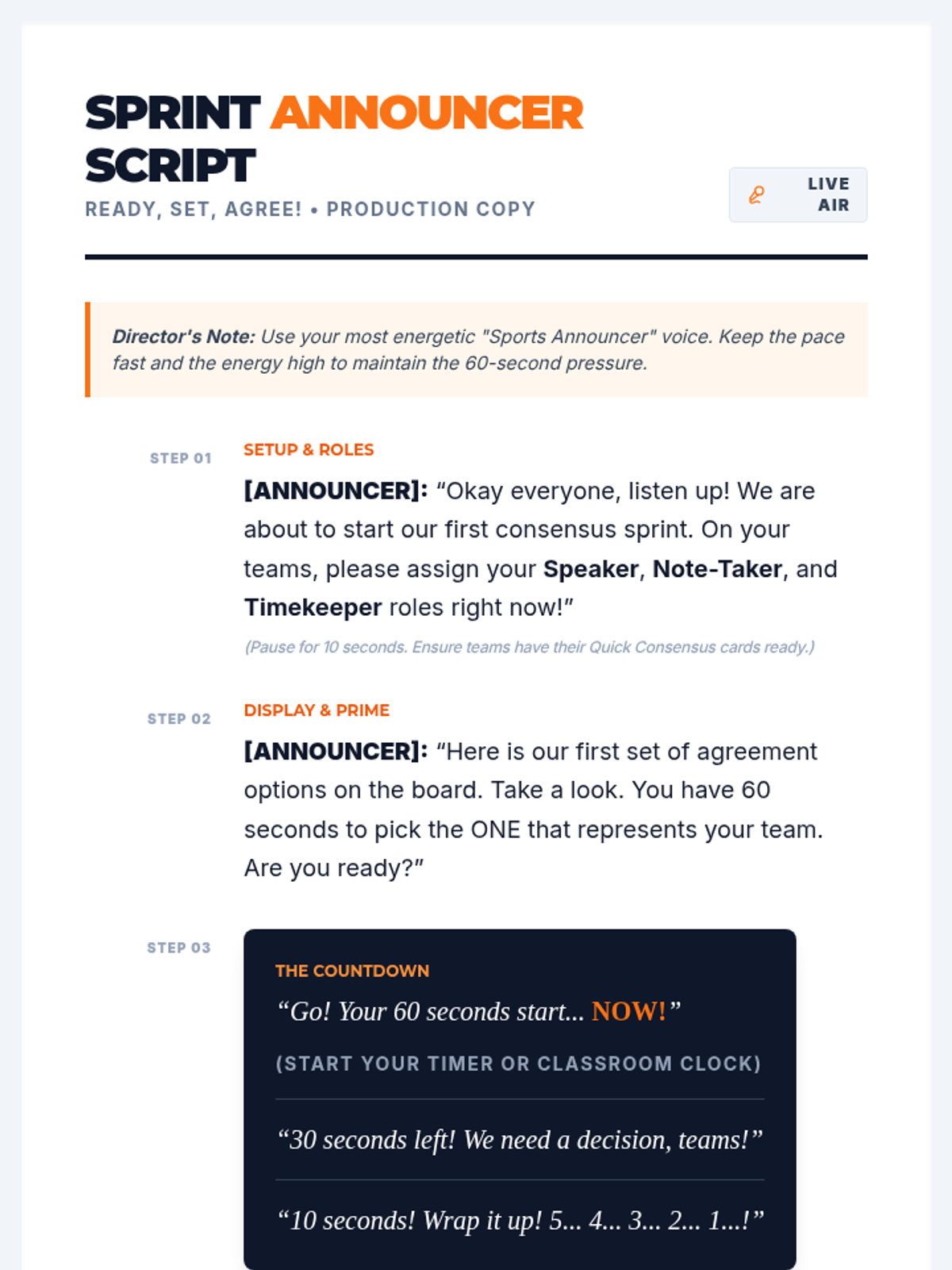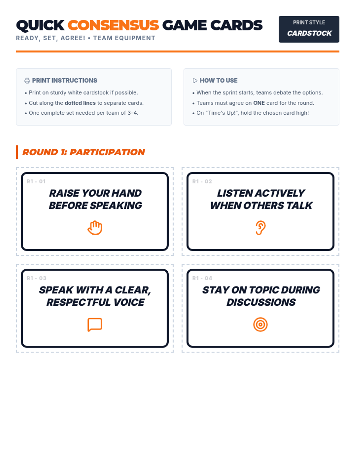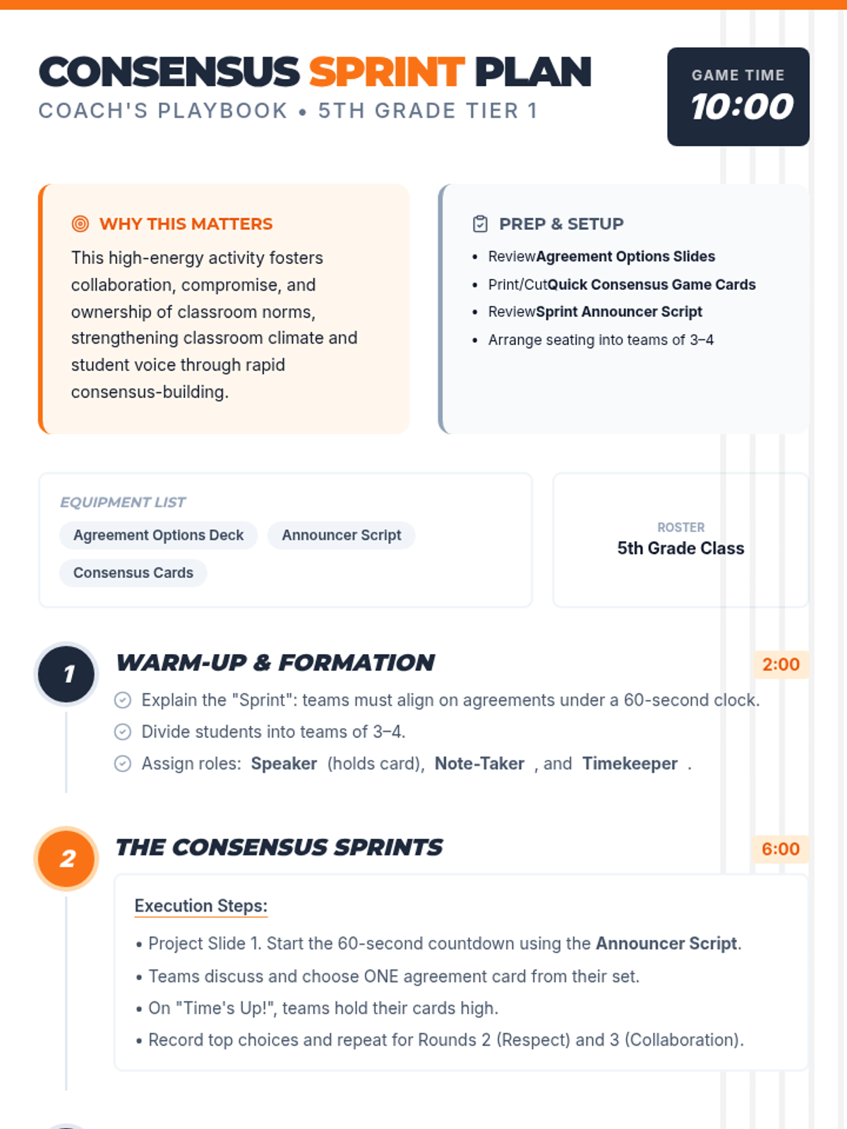 A rapid-fire consensus challenge where 5th grade teams align on classroom agreements under time pressure to build compromise and positive climate.