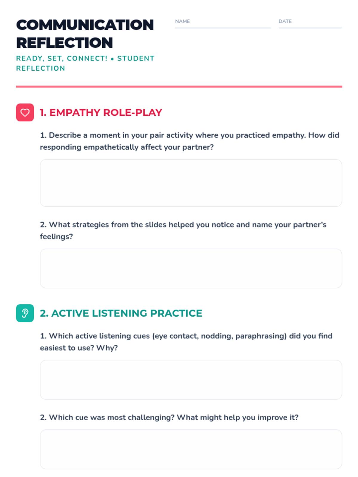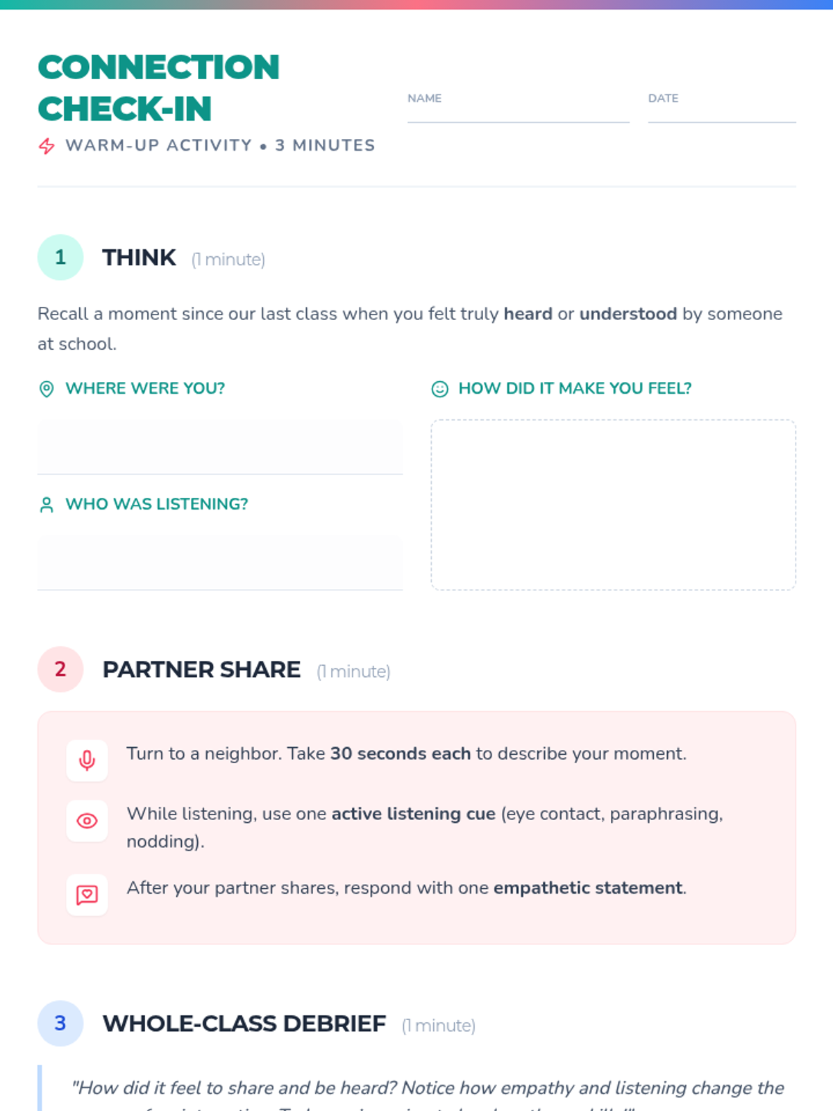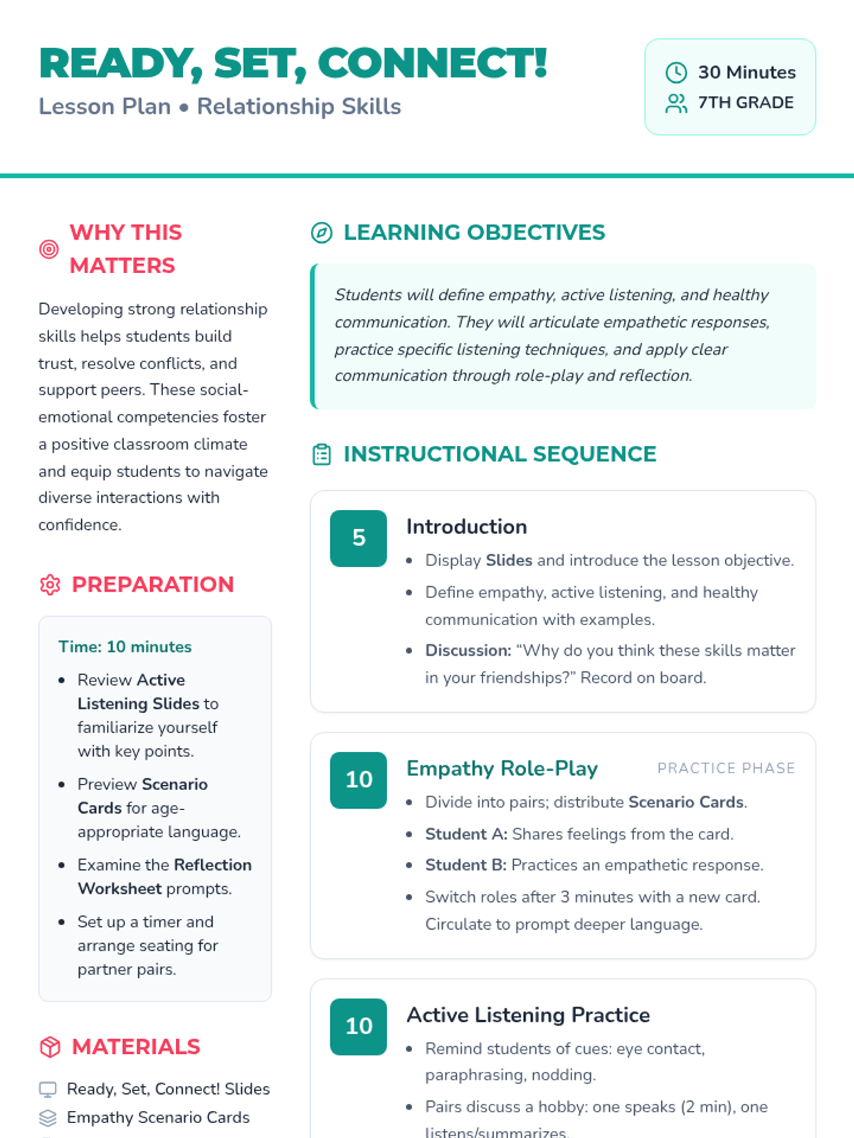 In this 30-minute Tier 1 lesson for 7th graders, students will learn essential relationship skills—empathy, active listening, and healthy communication—through engaging activities. By the end, they’ll be better equipped to build positive connections with peers and navigate social interactions with confidence.