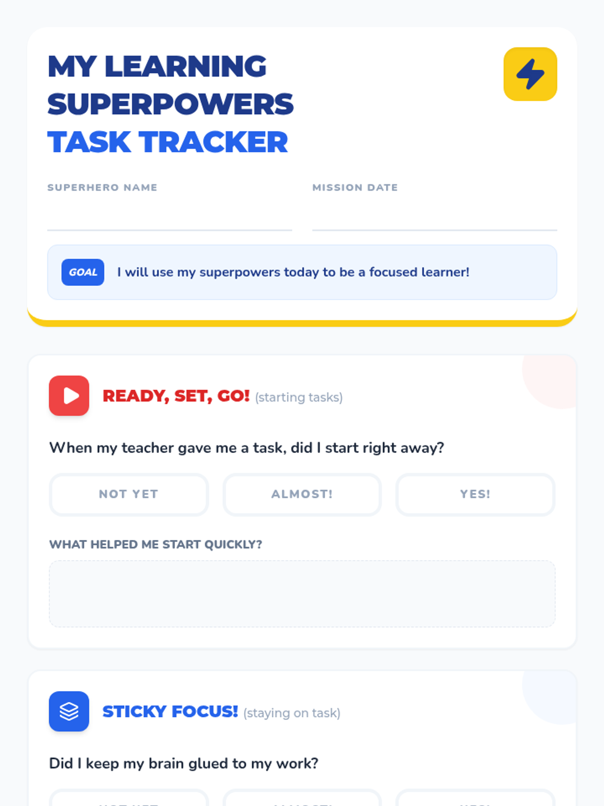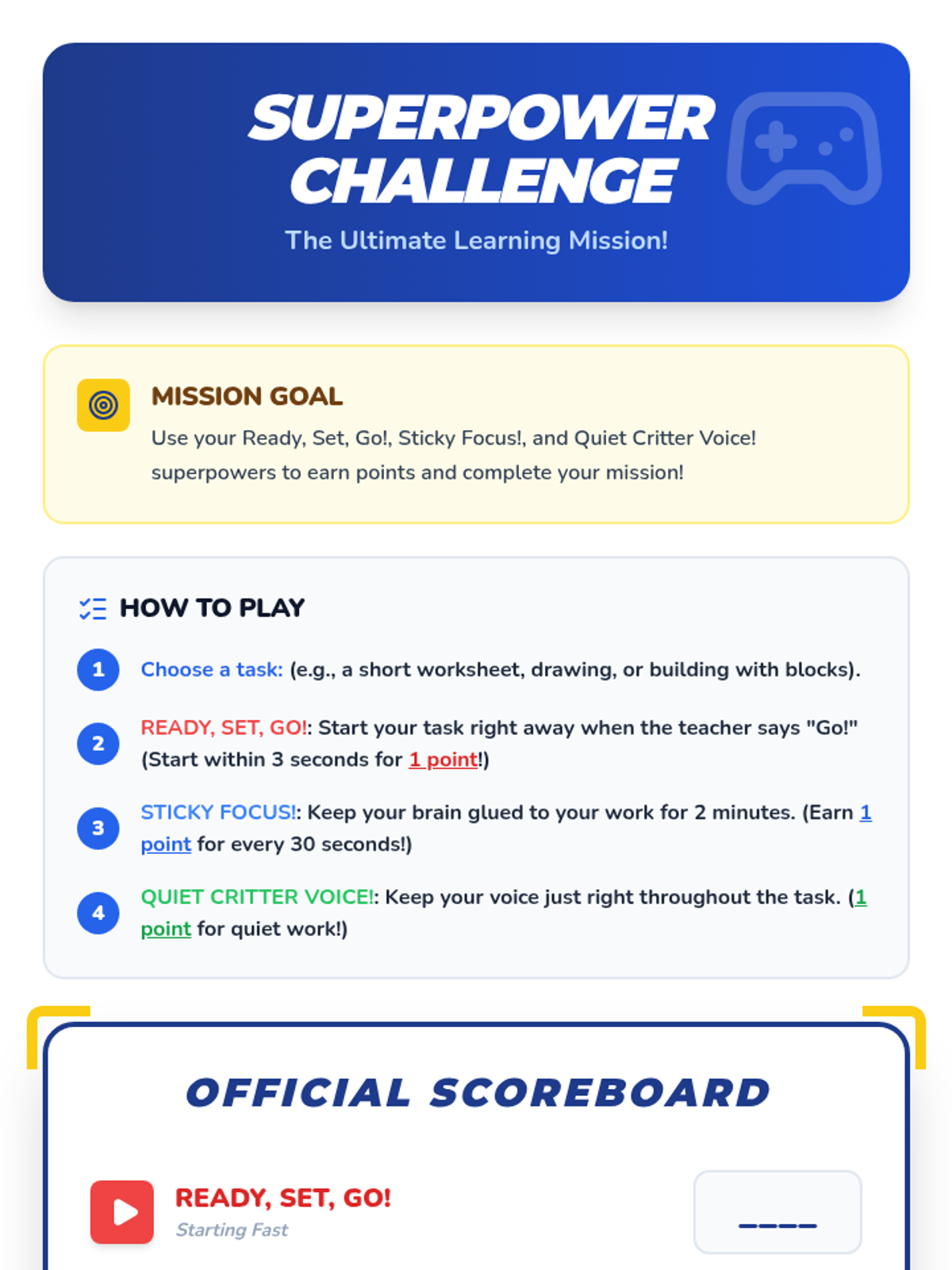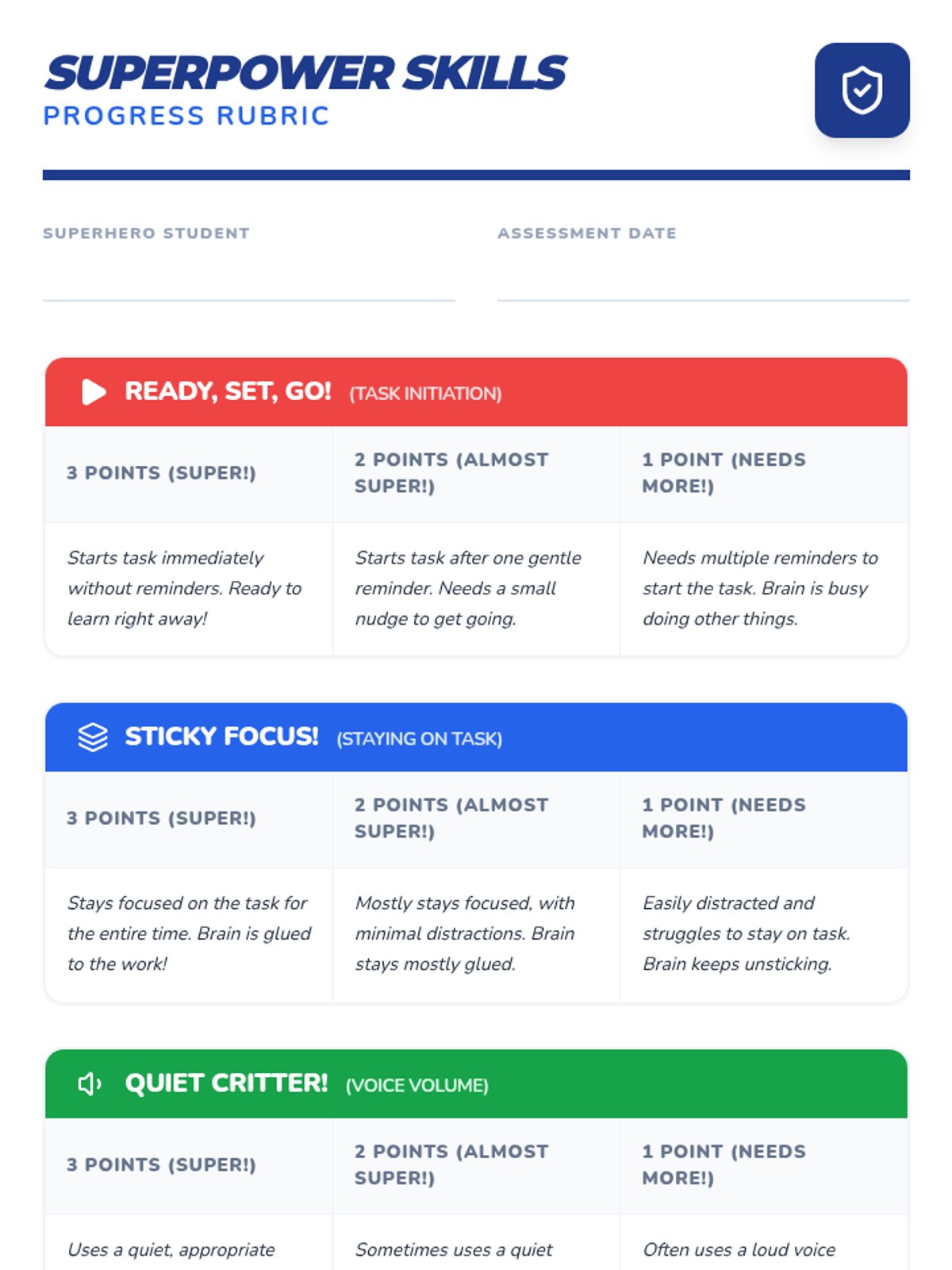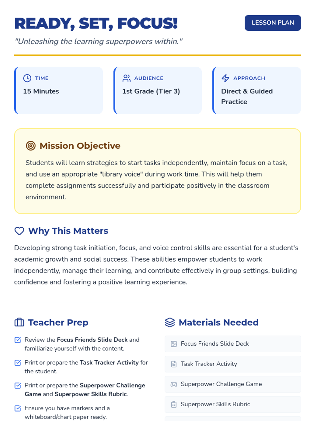 A 15-minute Tier 3 individual lesson for 1st-grade students focusing on independent task initiation, sustained attention, and appropriate voice volume through a superhero-themed approach.