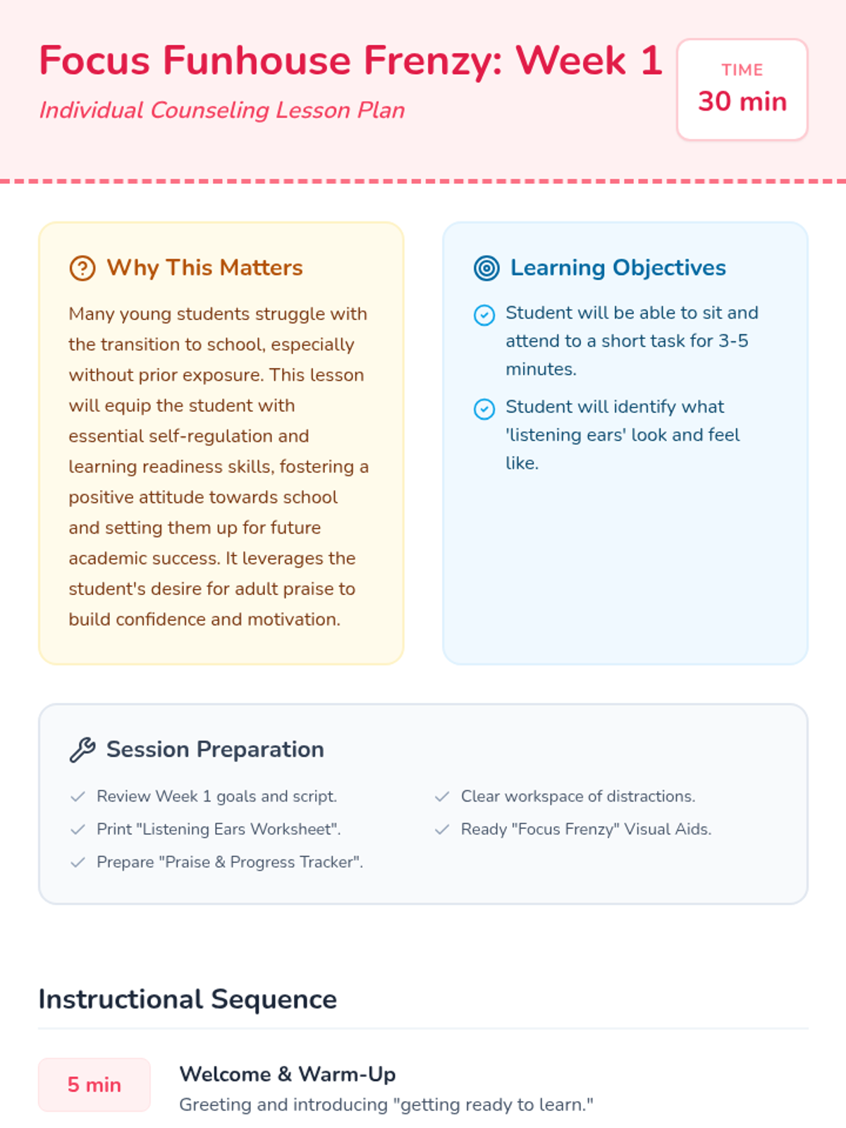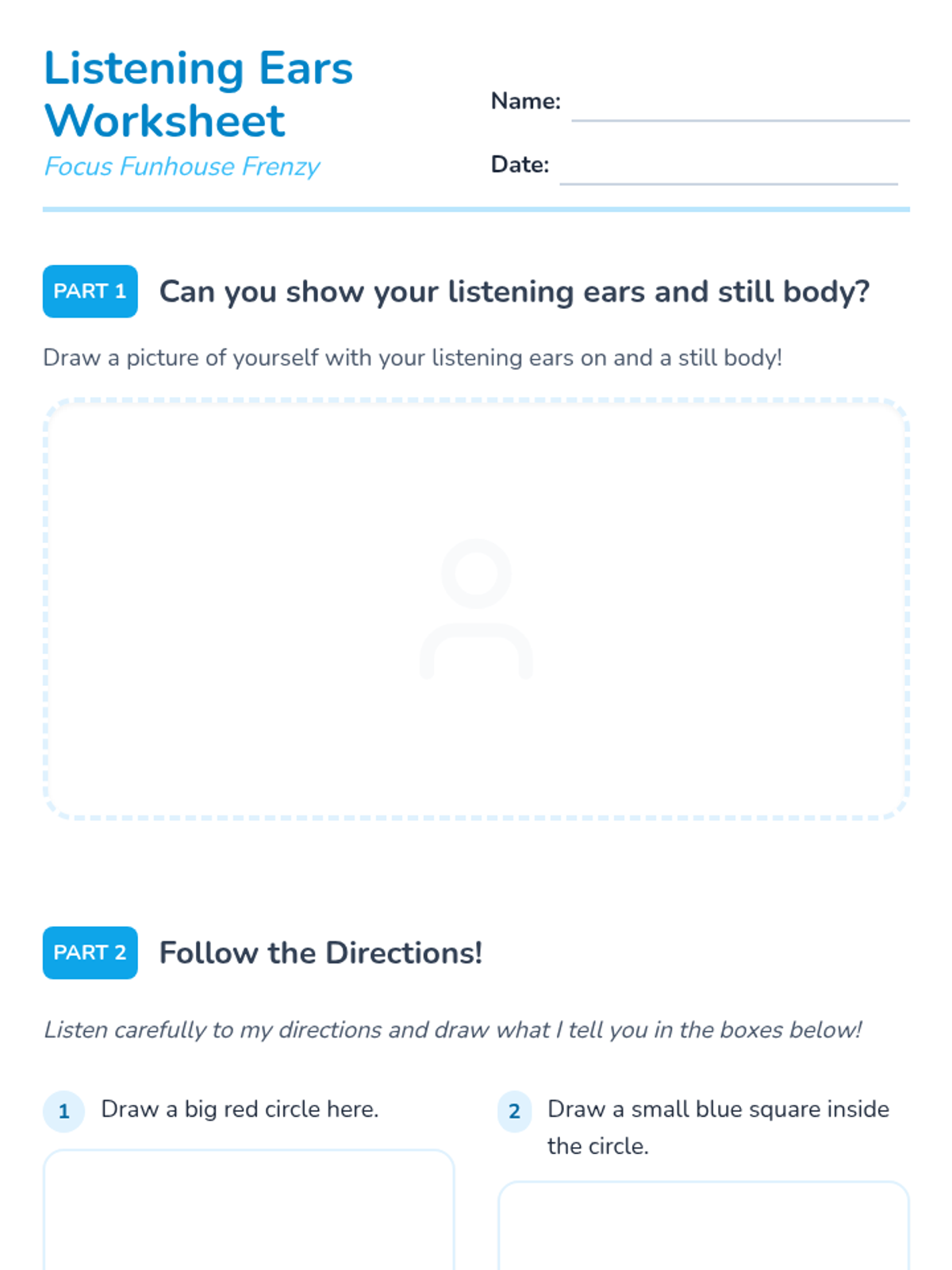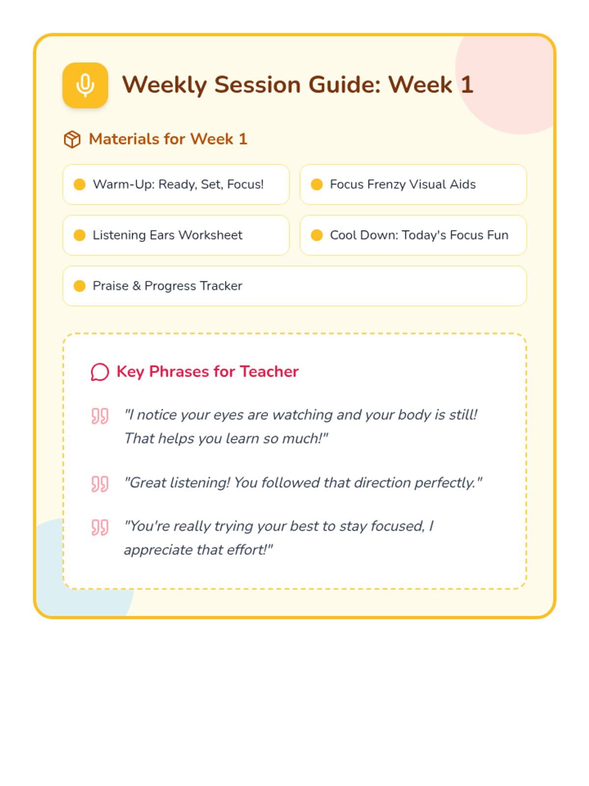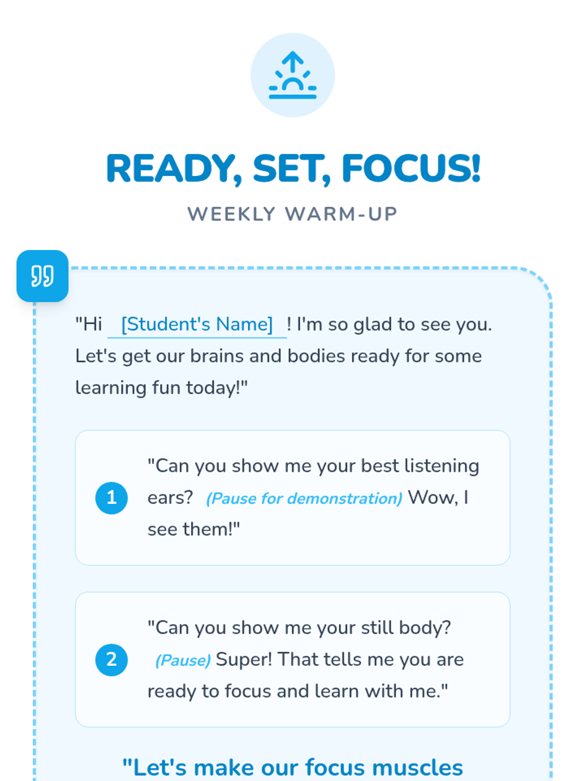 Introduces 'listening ears' and 'still bodies' to help students build basic attention skills and readiness for learning.