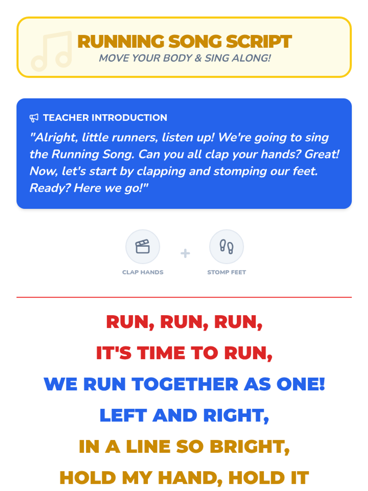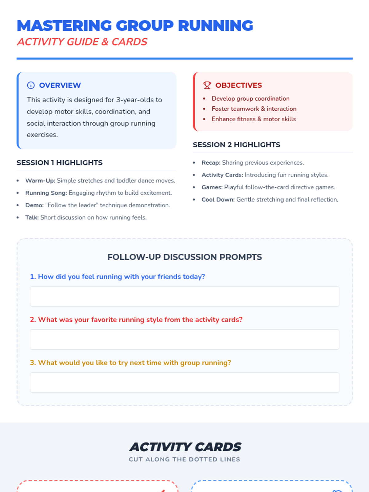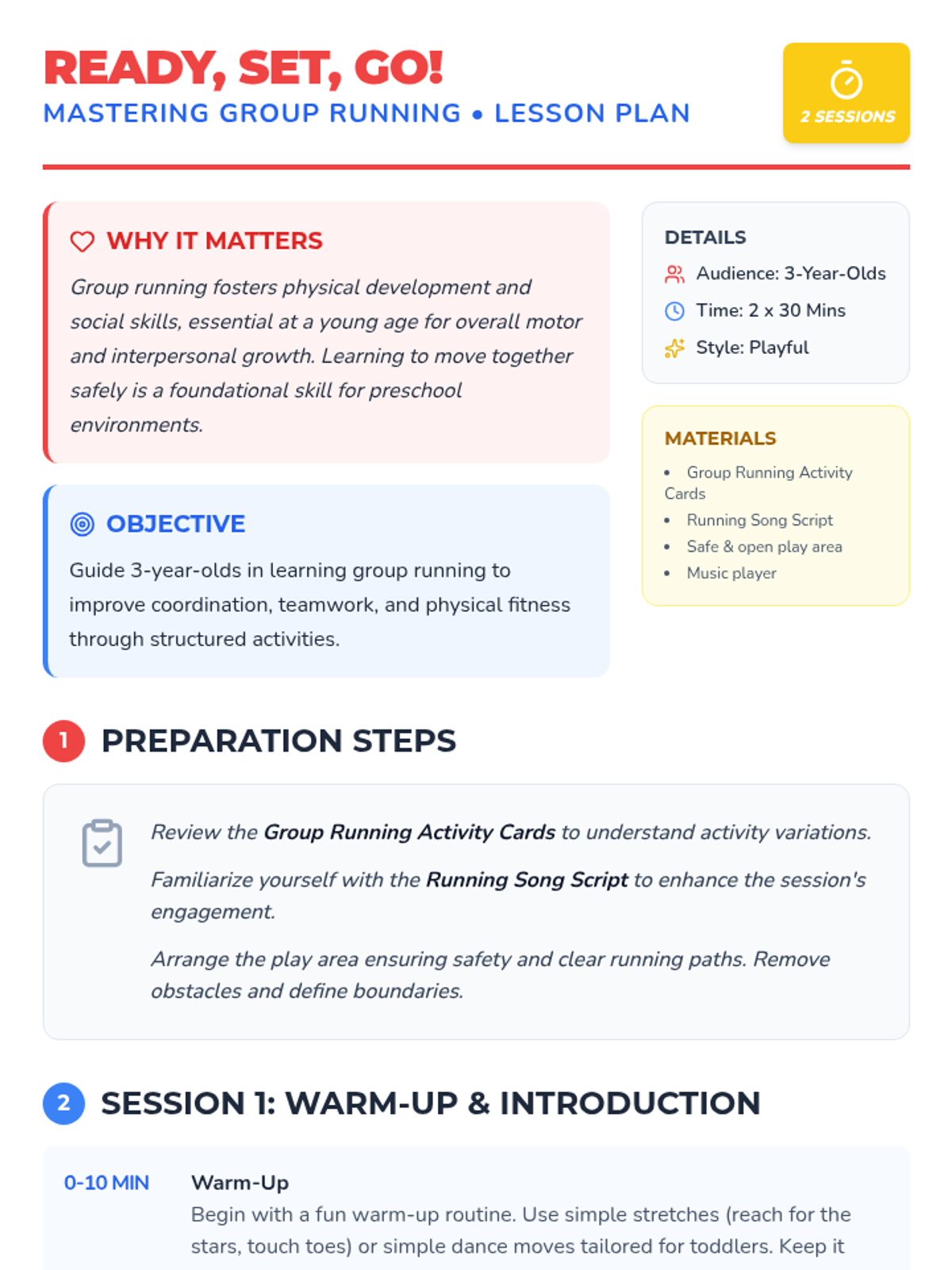 A fun, two-session physical education lesson for 3-year-olds focusing on coordination, teamwork, and basic group running skills through songs and games.