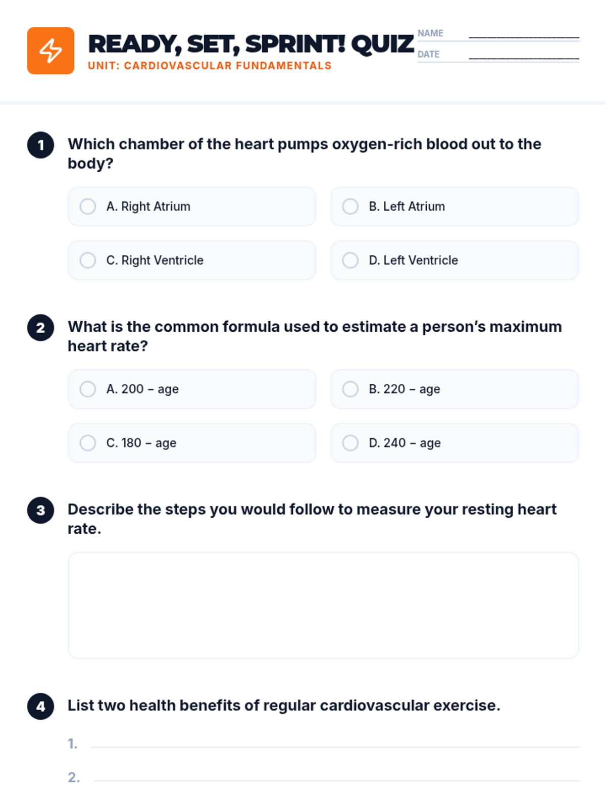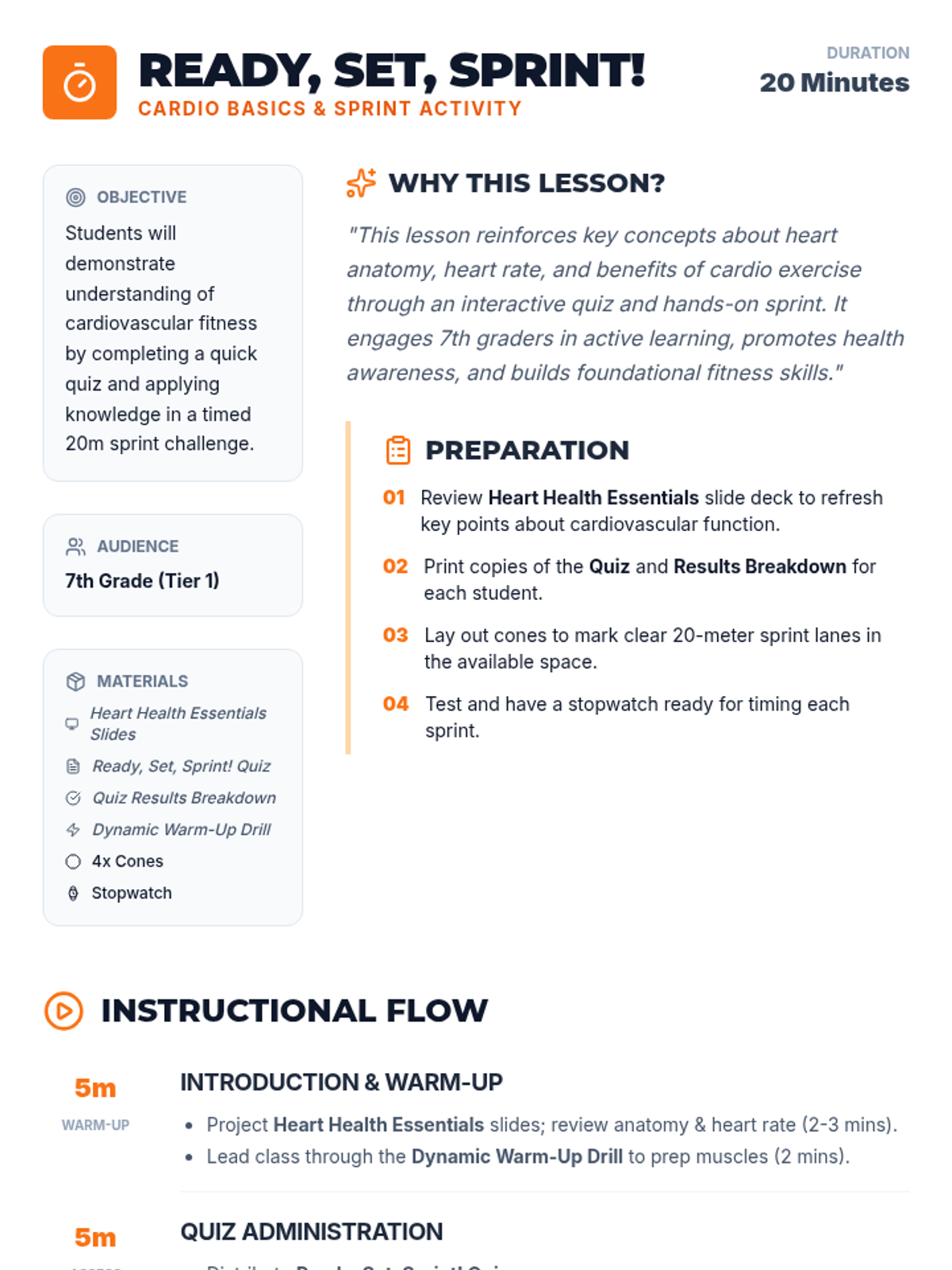 A high-energy, 20-minute Tier 1 lesson for 7th graders combining cardiovascular science with physical activity. Students learn heart anatomy and fitness benefits before completing a quiz and a timed sprint challenge.