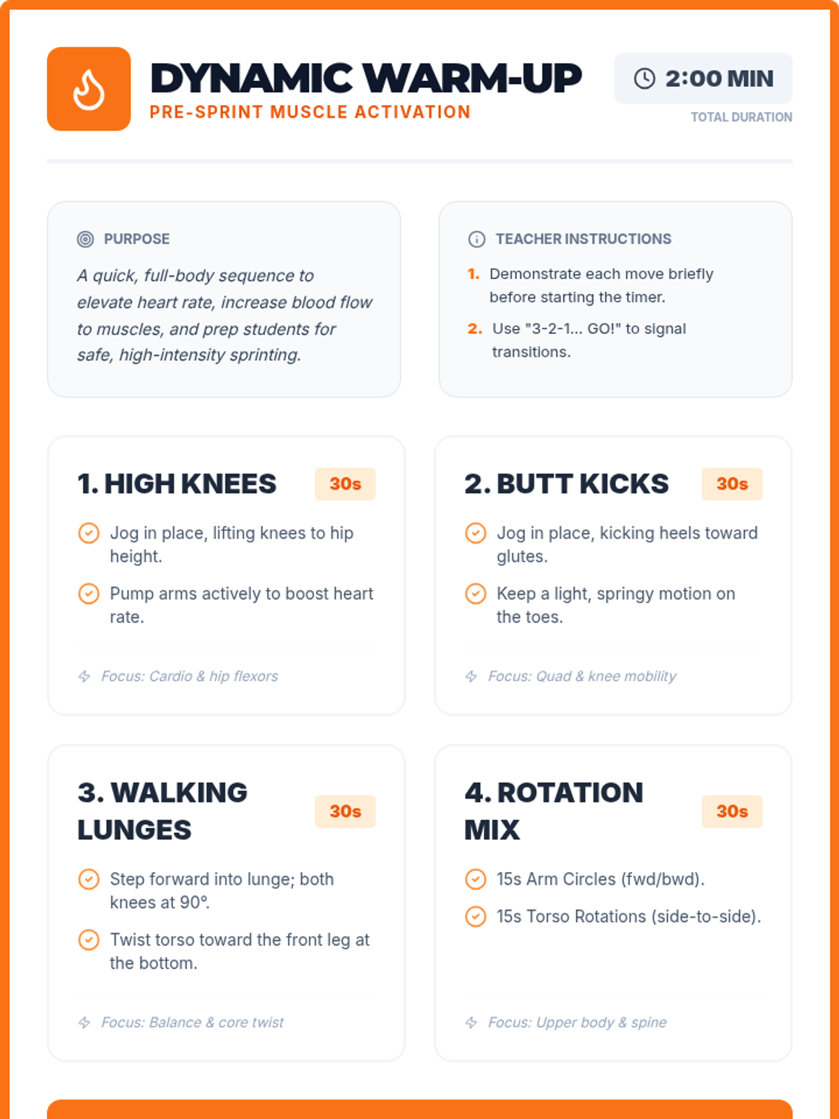 A high-energy lesson focused on sprinting biomechanics, explosive power, and form analysis for track and field. Students learn the science of speed and apply it through drills, data collection, and competitive games.