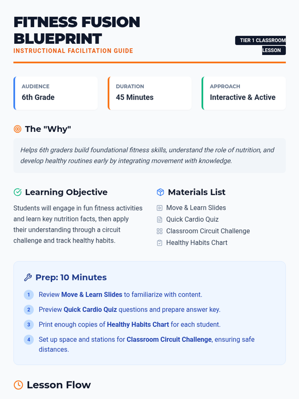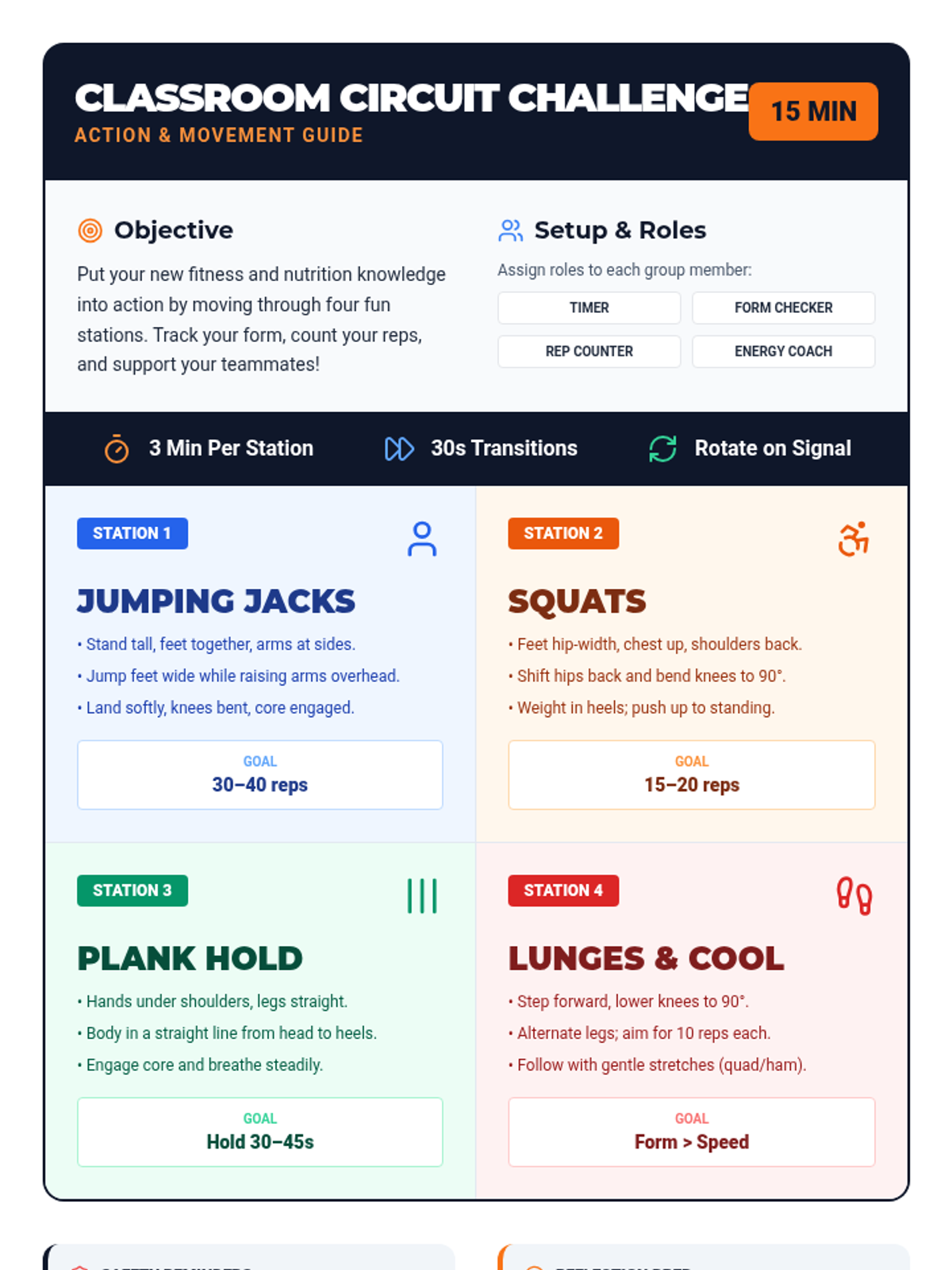 A high-energy, 45-minute introductory session that combines nutritional education with a functional fitness circuit to inspire healthy lifestyle habits in 6th graders.