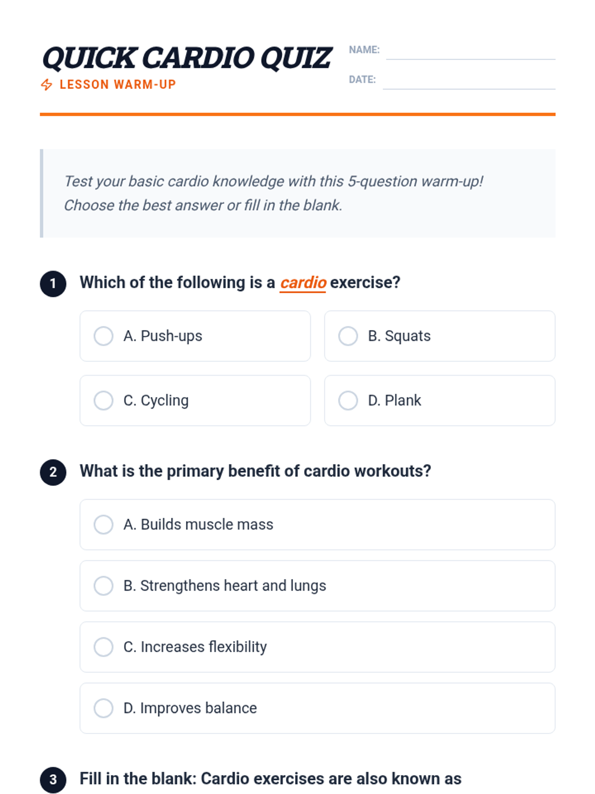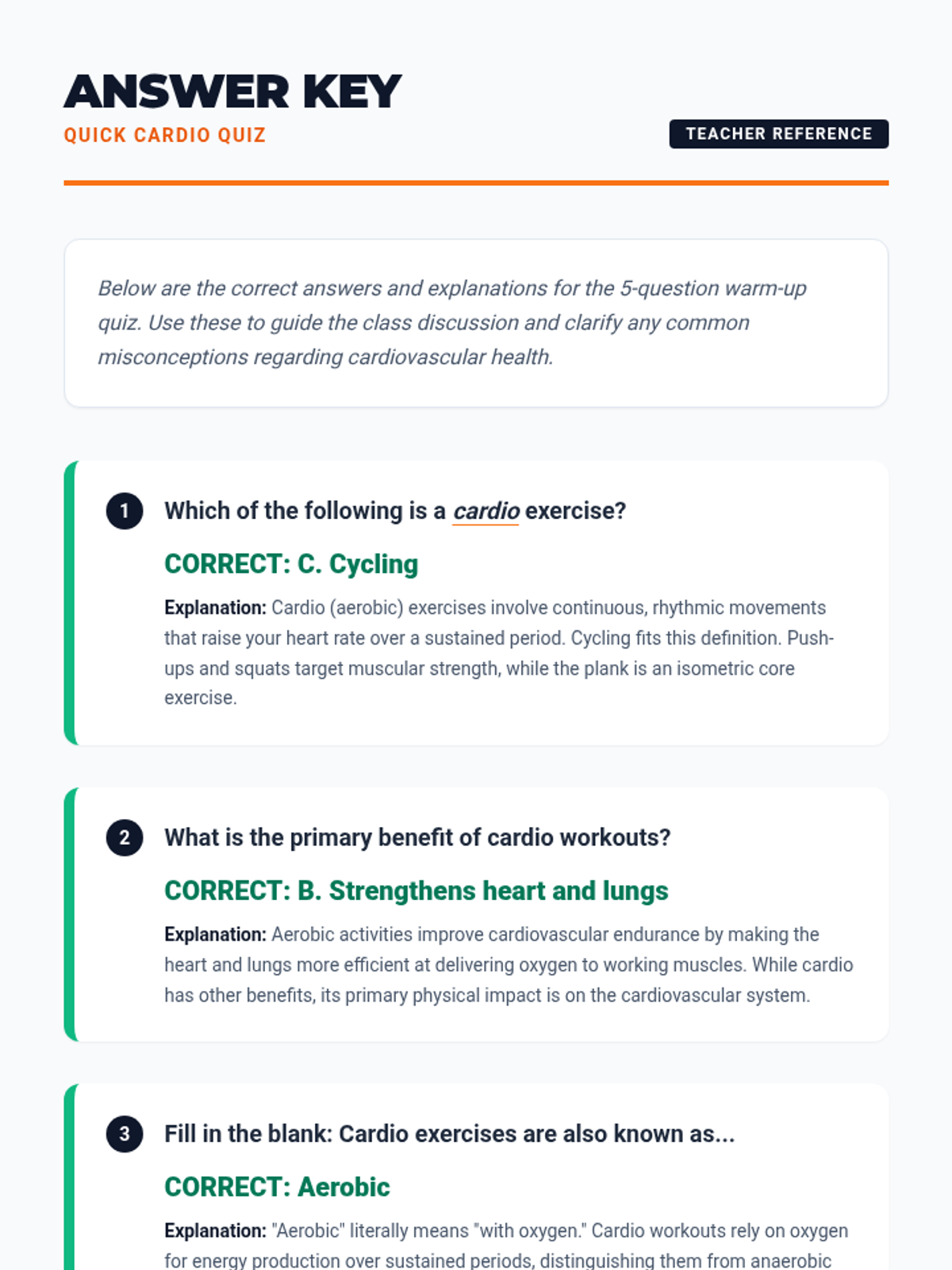 A high-energy lesson focused on understanding heart health through cardiovascular exercise, specifically walking, running, and machine-based cardio. Students will learn to monitor their heart rate and understand the benefits of aerobic activity.