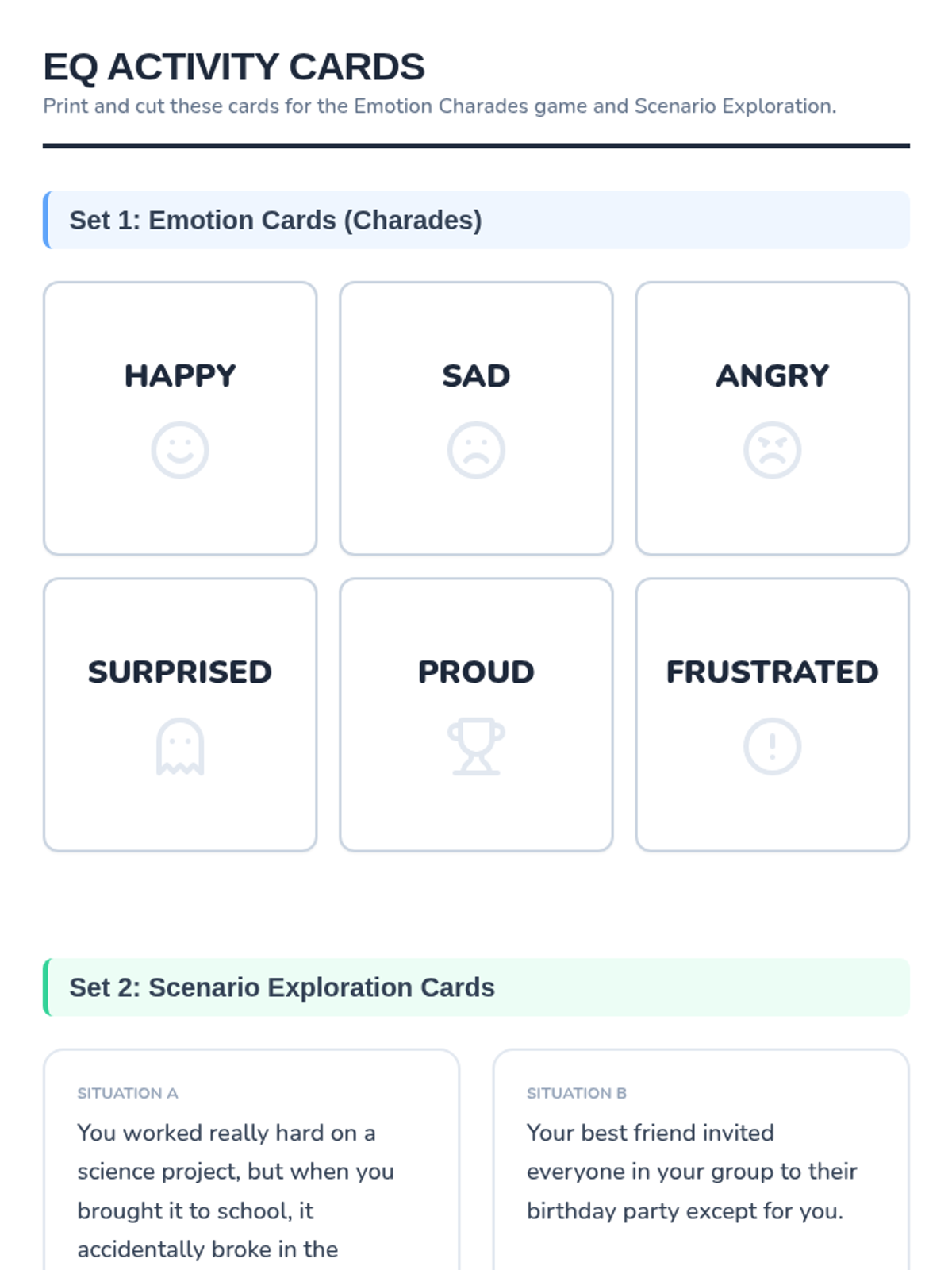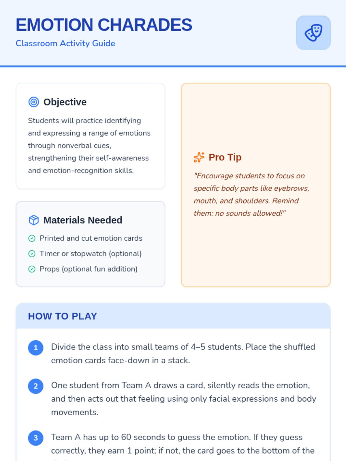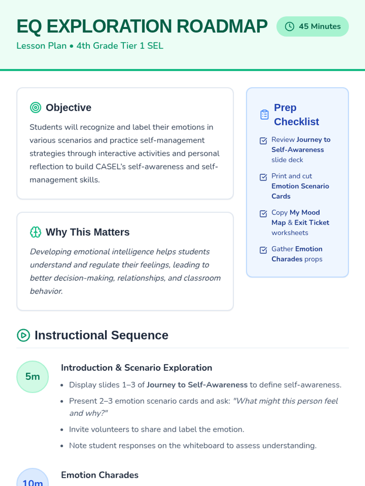 An interactive 45-minute Tier 1 lesson for 4th graders exploring emotional intelligence. Students will learn to recognize their emotions and practice self-management strategies through scenarios, charades, and reflective journaling.