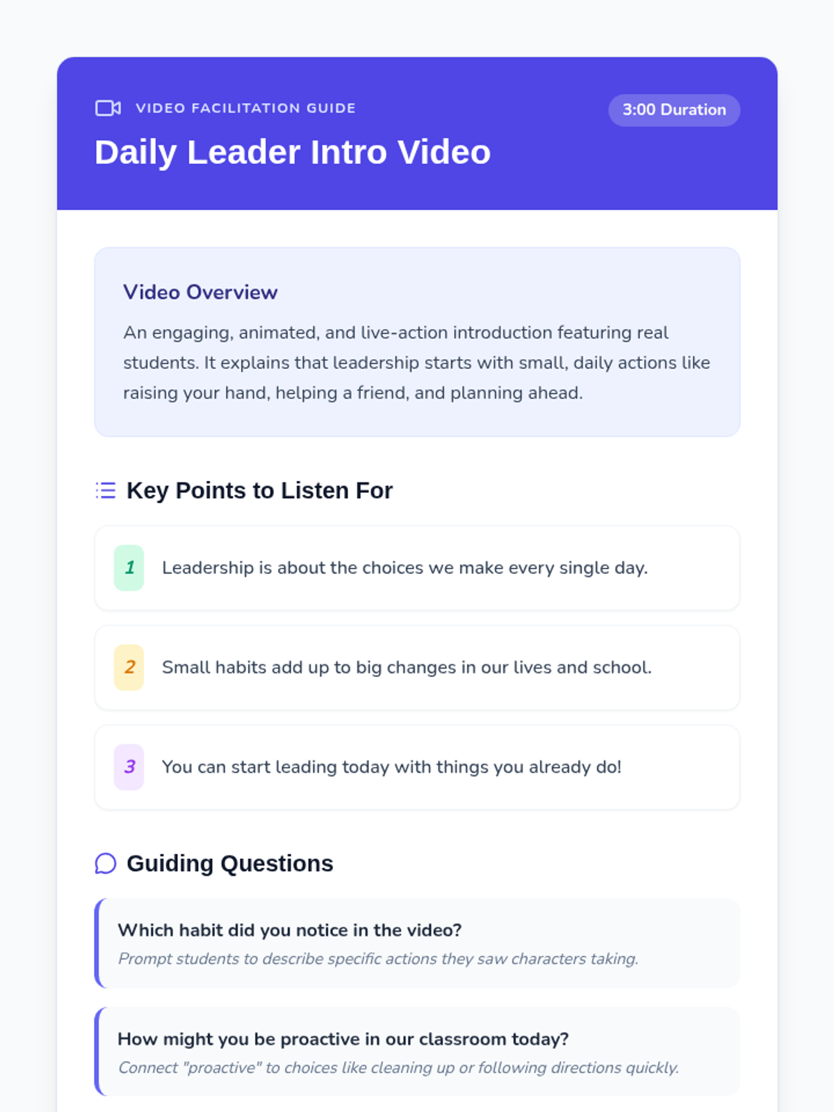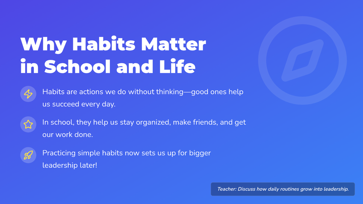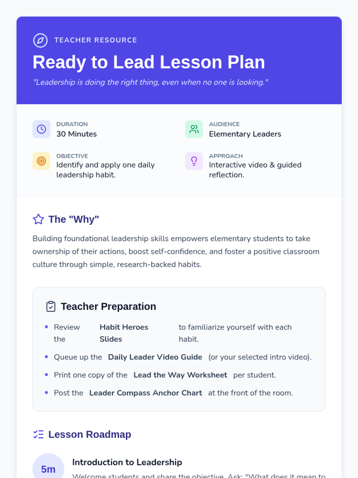 A high-energy, 30-minute introduction to personal leadership and the 7 Habits for elementary students, focusing on how daily choices build character.