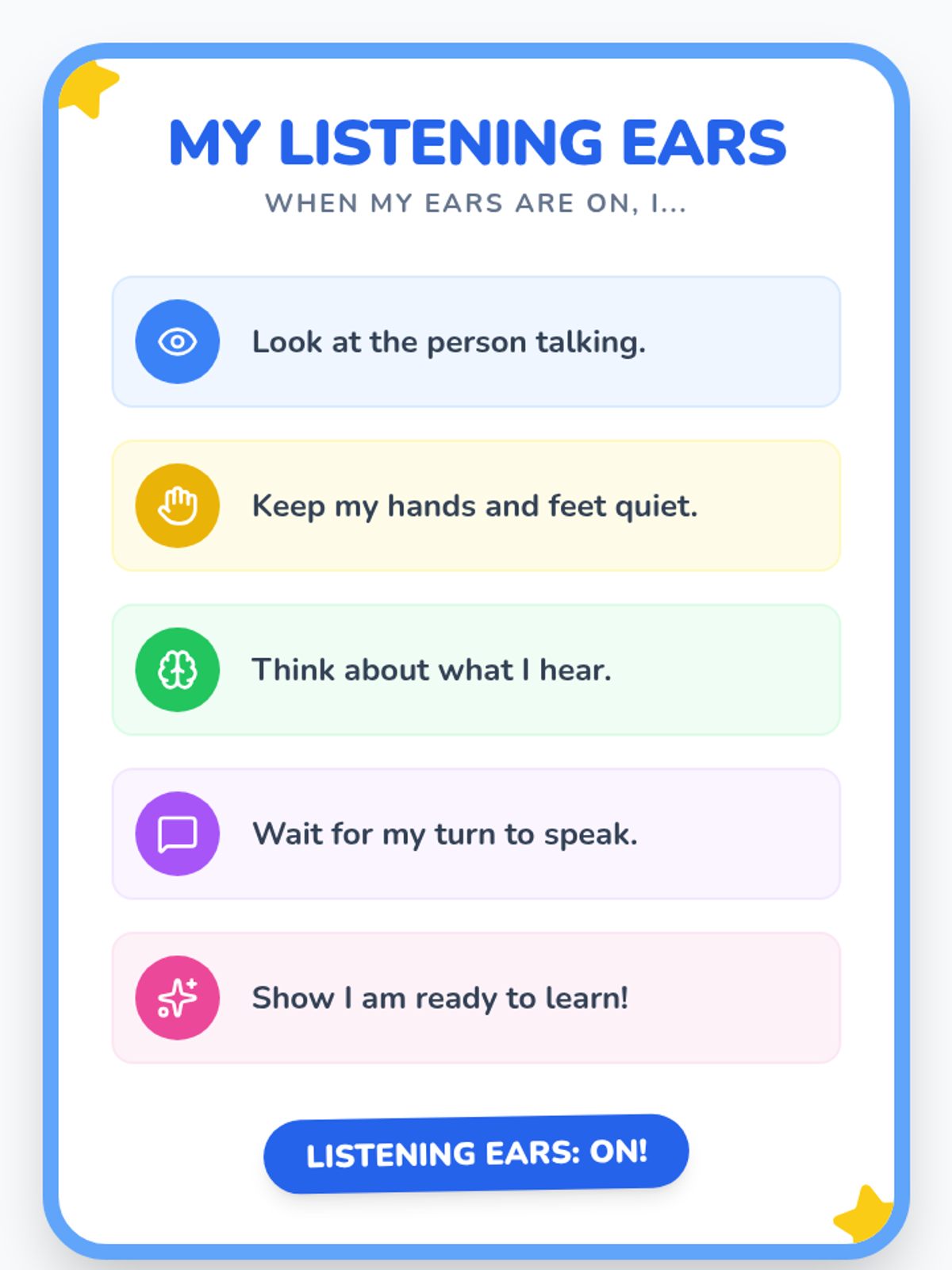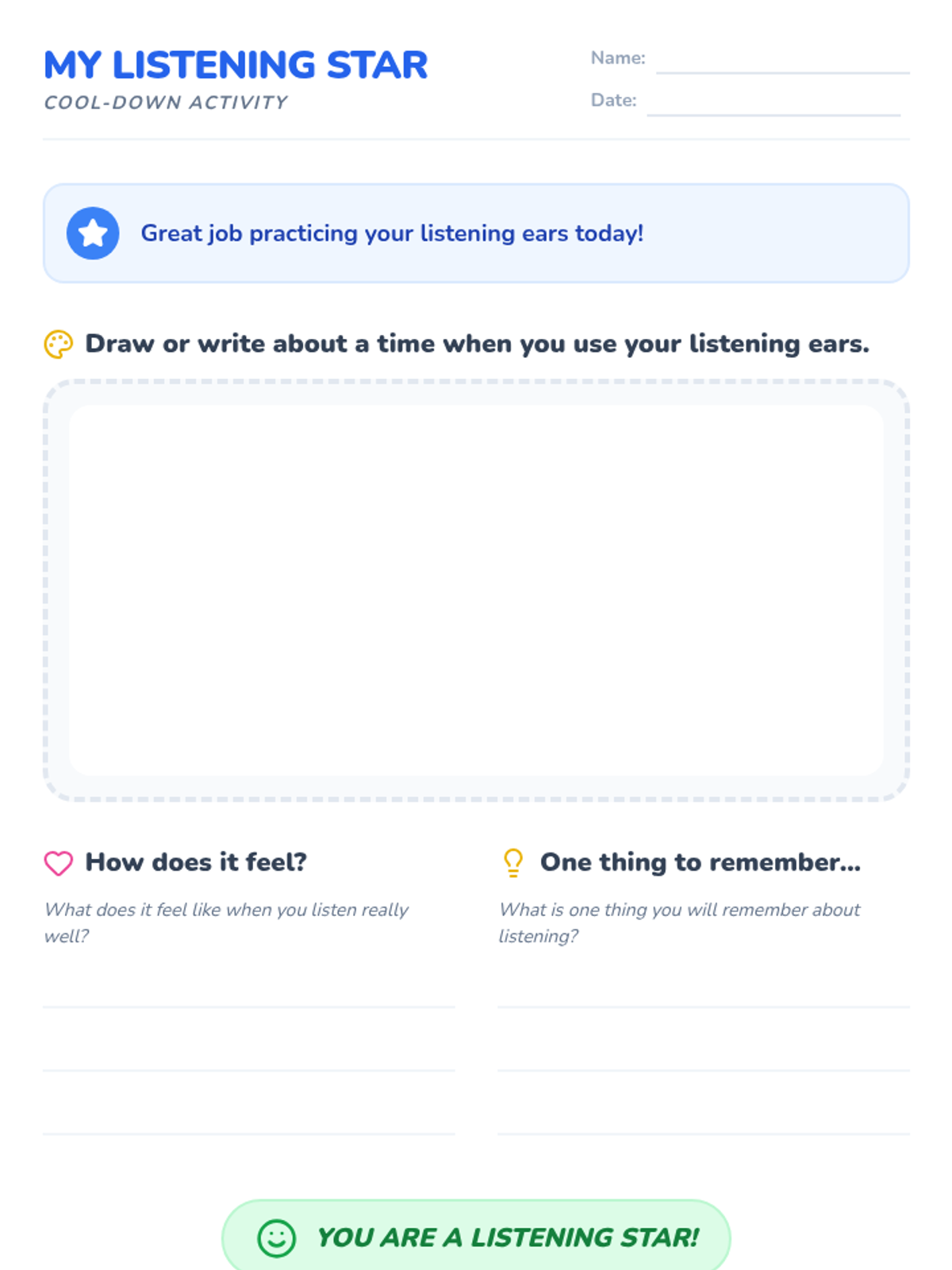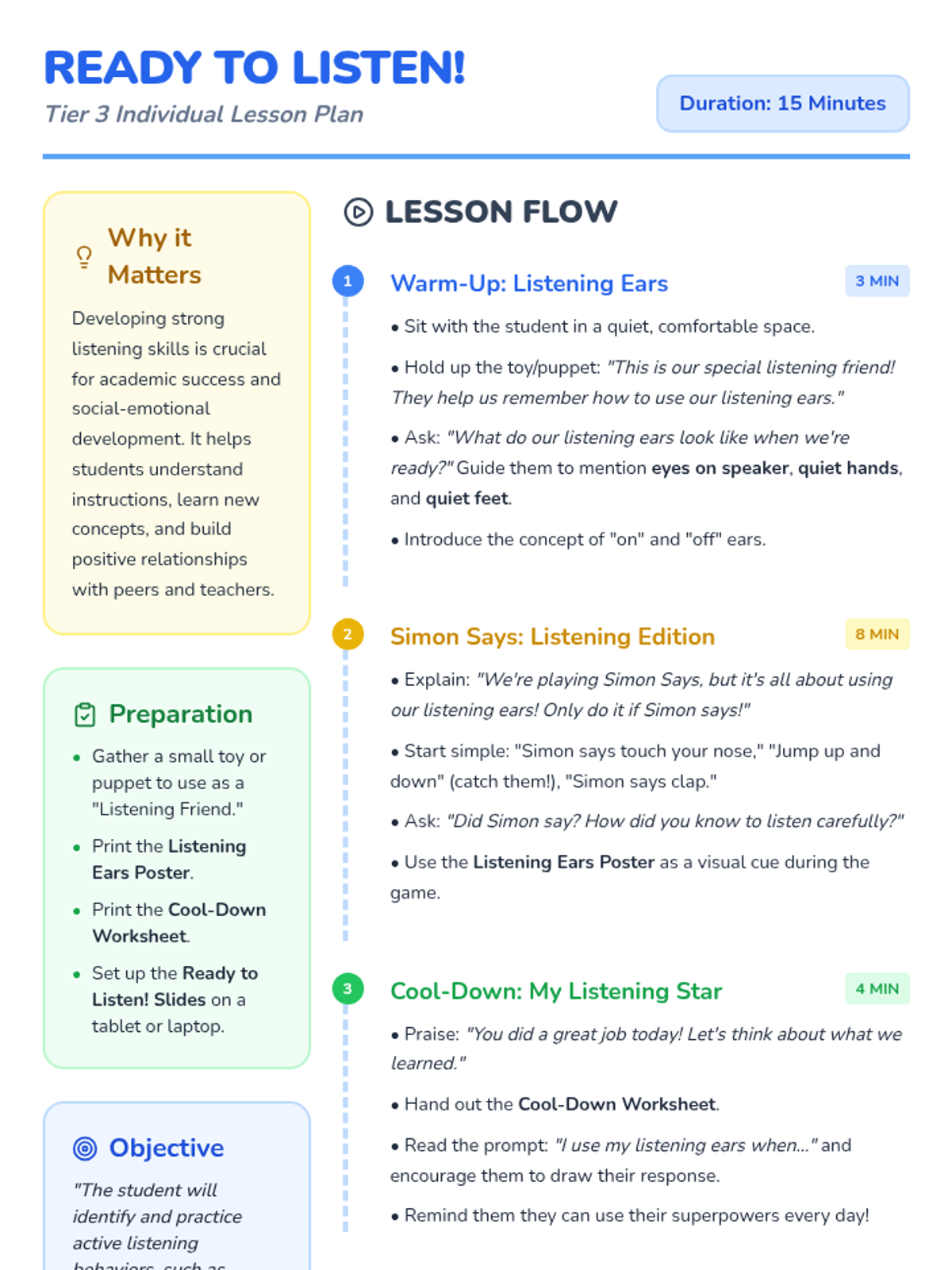 A 15-minute, one-on-one Tier 3 intervention for Kindergarten students to develop active listening skills through interactive games and visual aids.