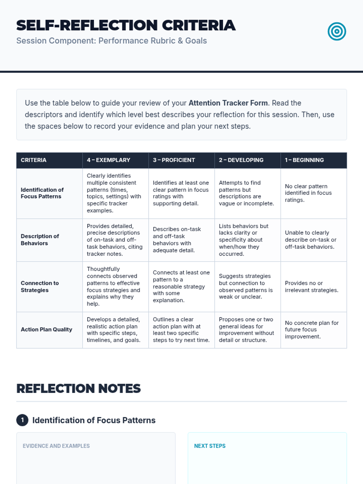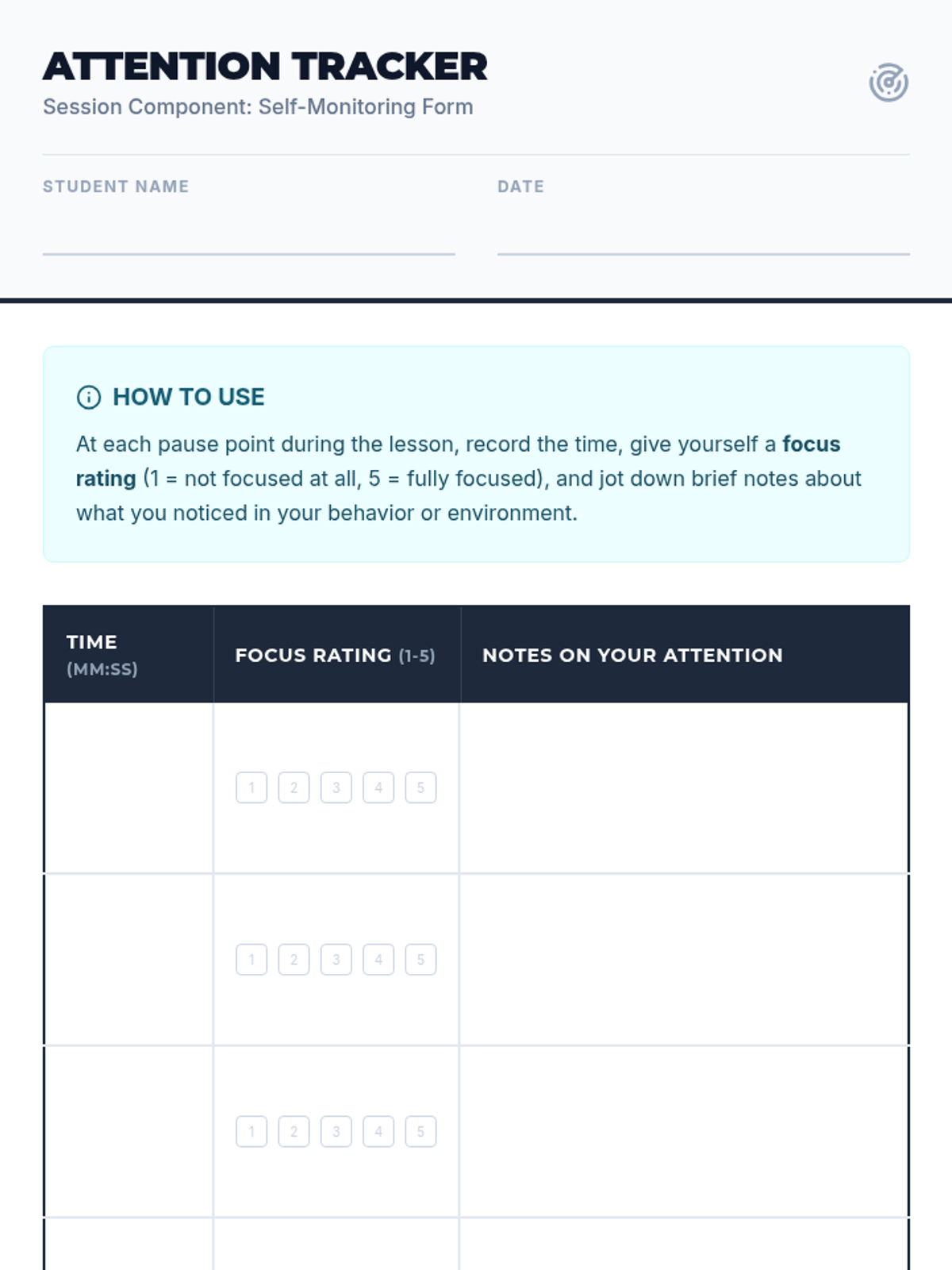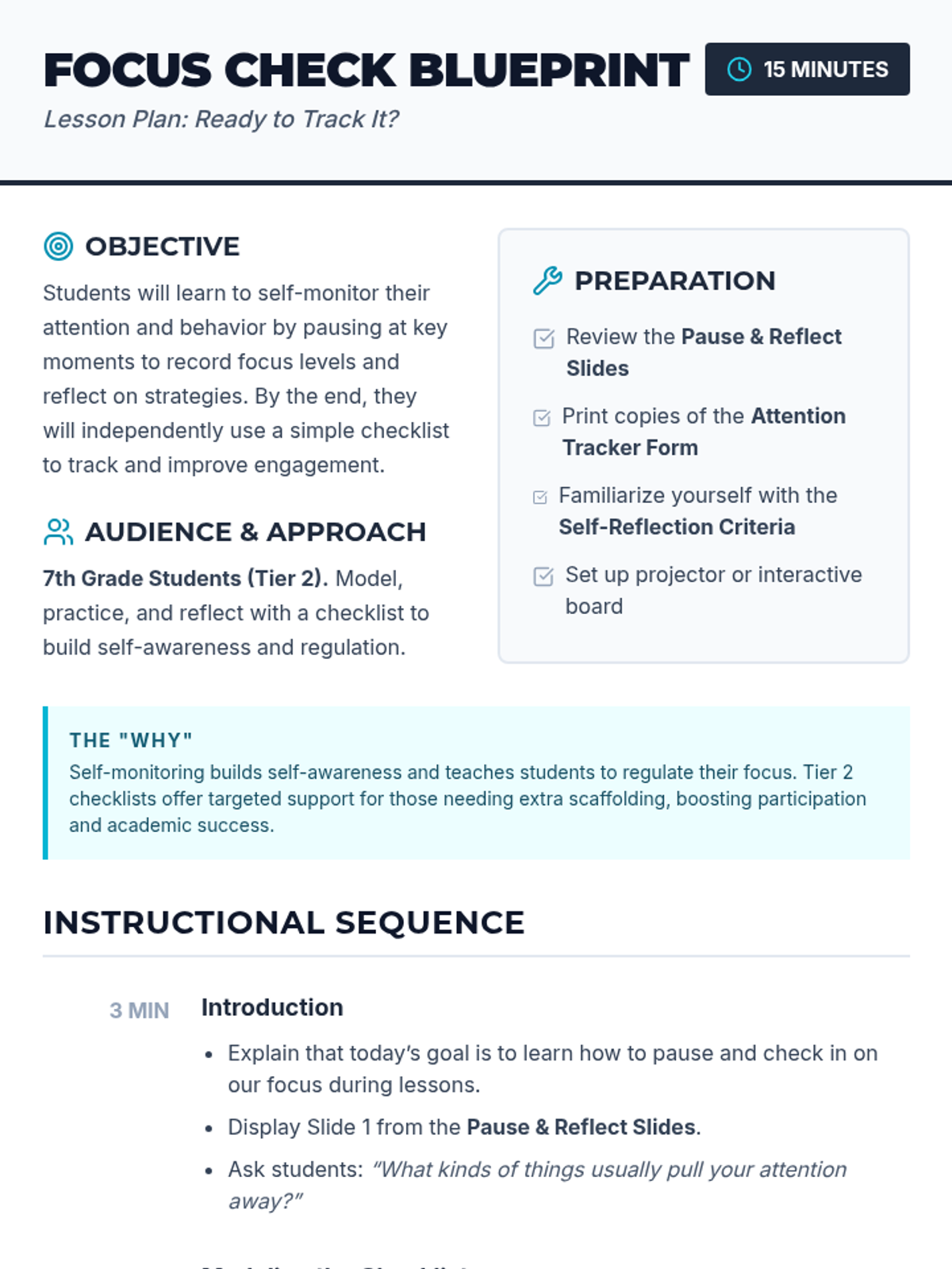 A 15-minute Tier 2 group session for 7th graders focused on self-monitoring attention and behavior using a simple checklist to improve focus and classroom participation.