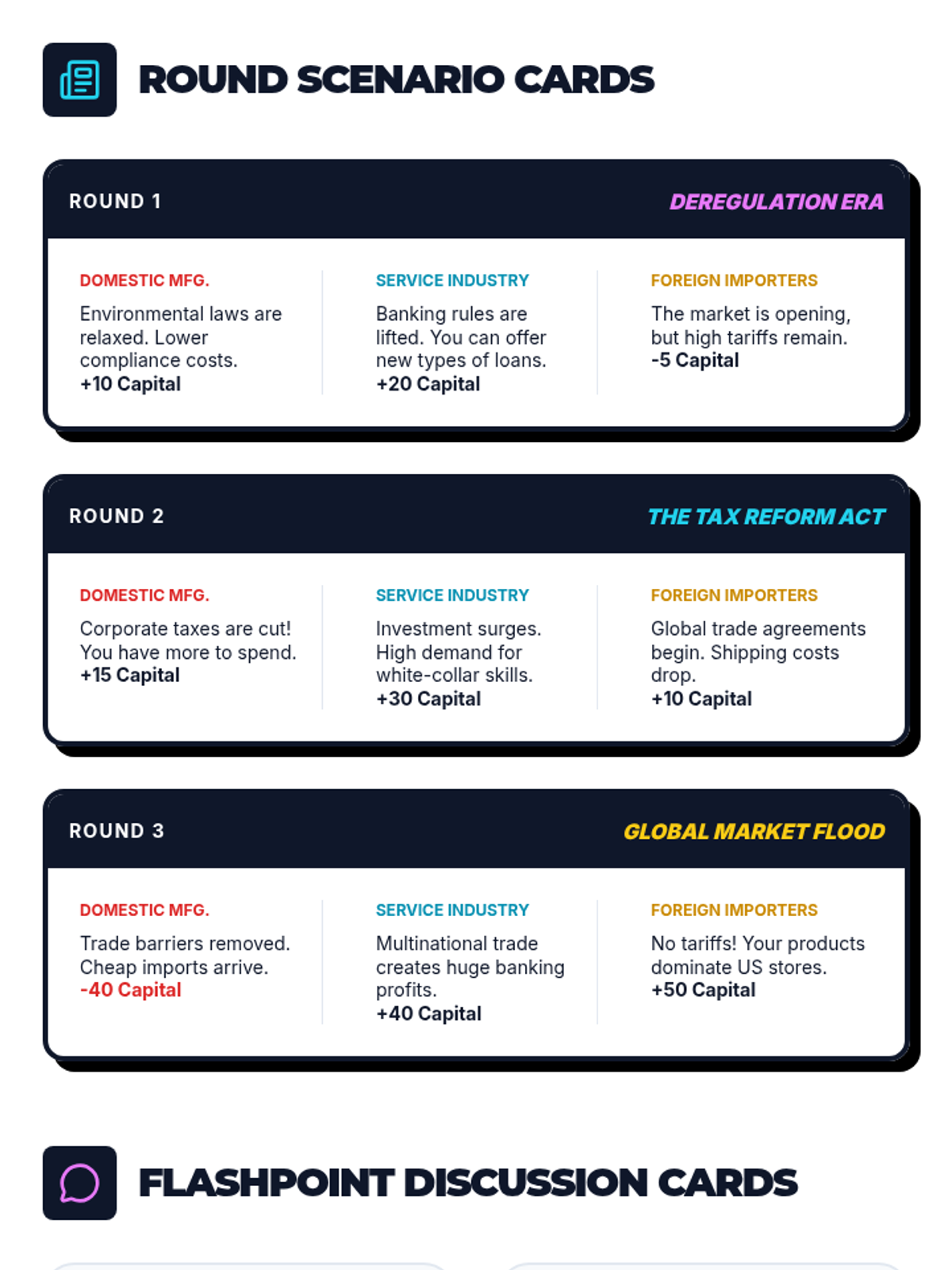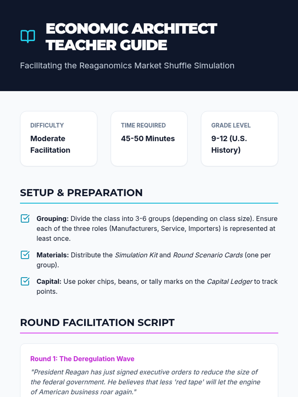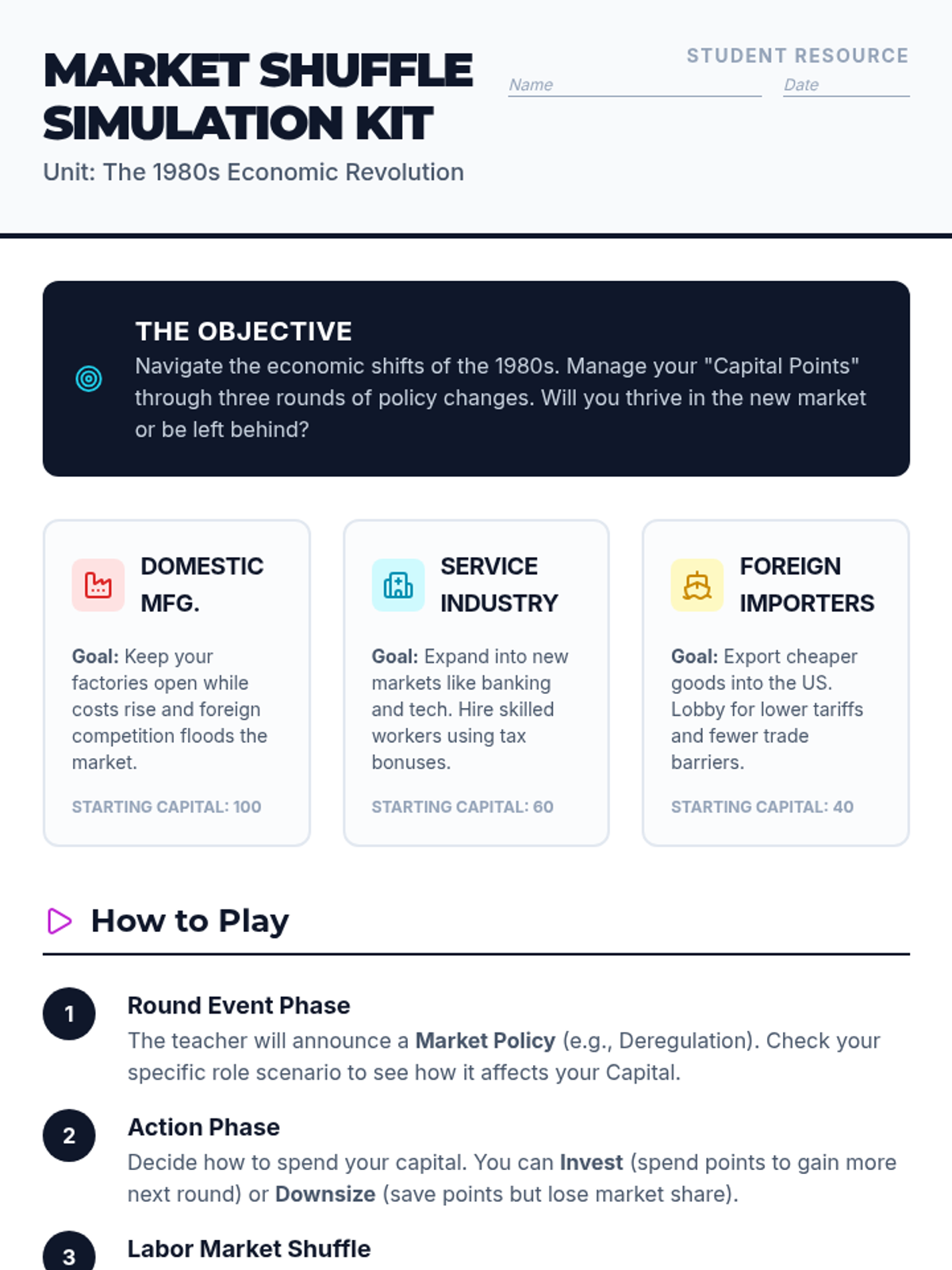 A high-school history lesson exploring the economic shifts of the 1980s through a role-play simulation and comparative video analysis. Students examine Reaganomics, deregulation, and the shift from manufacturing to a service-based economy.