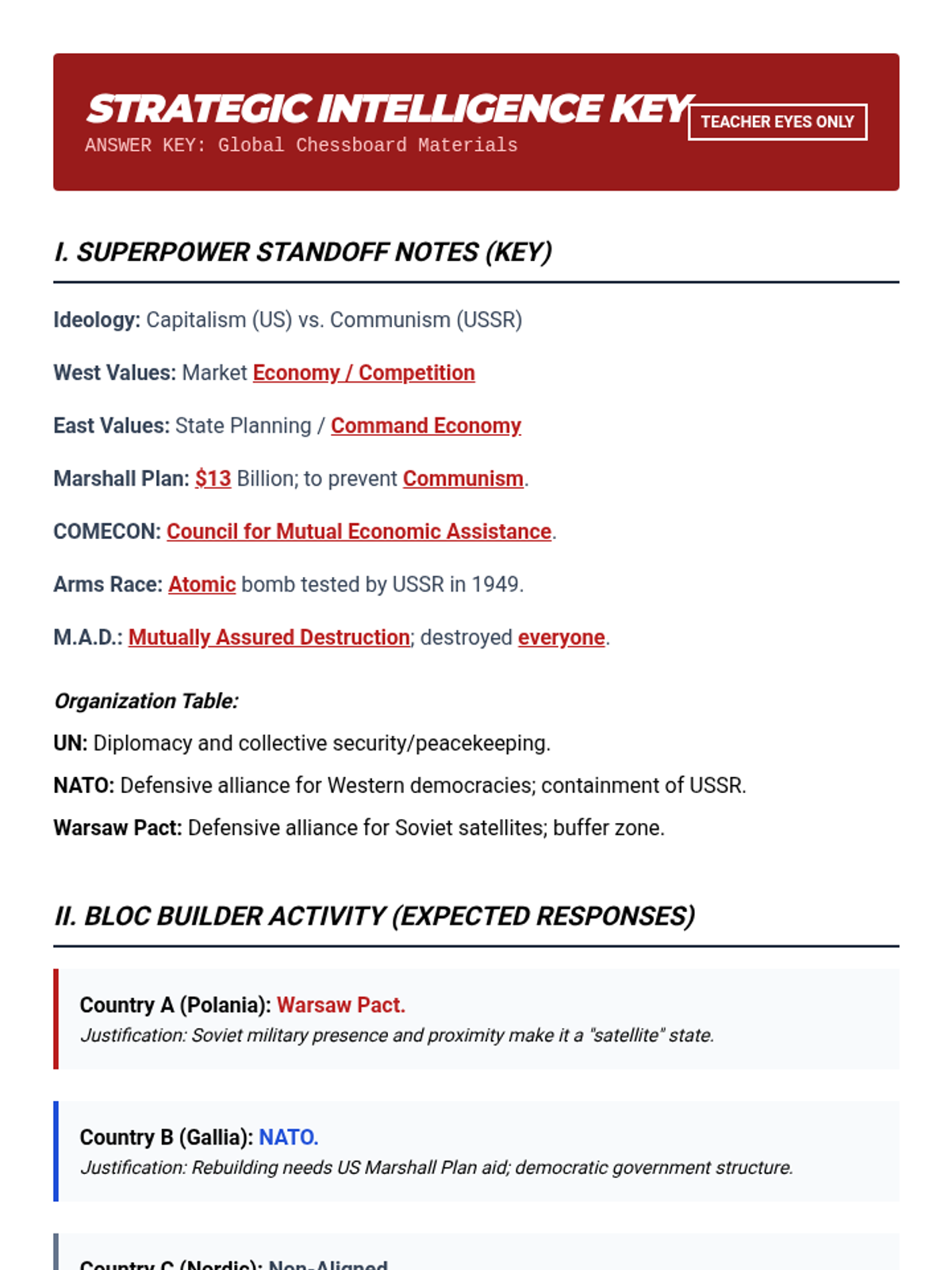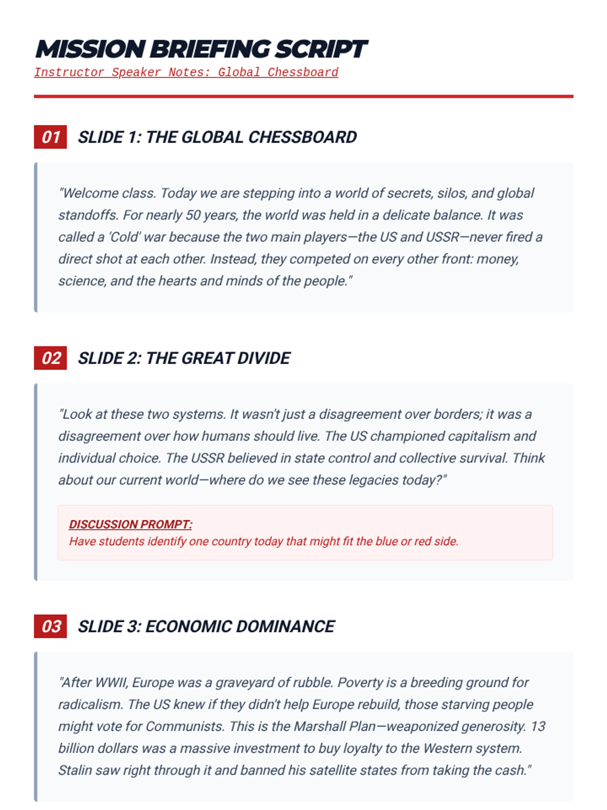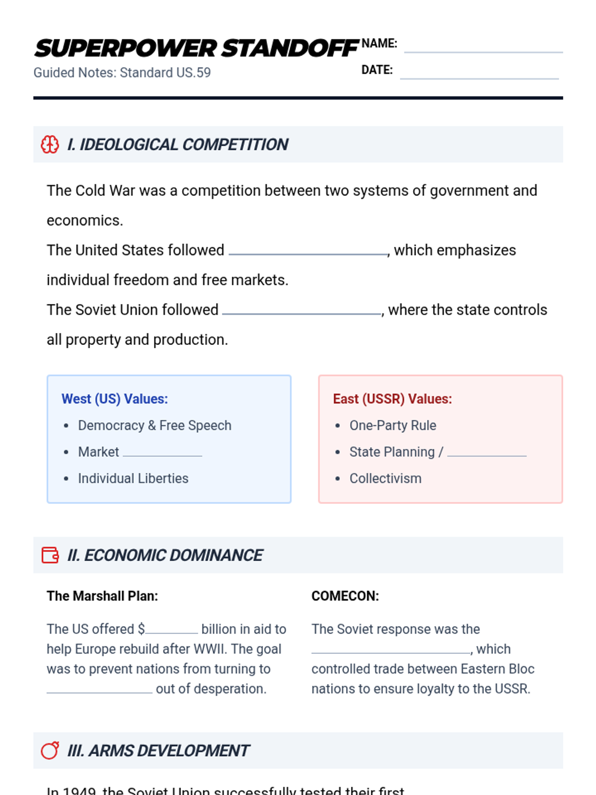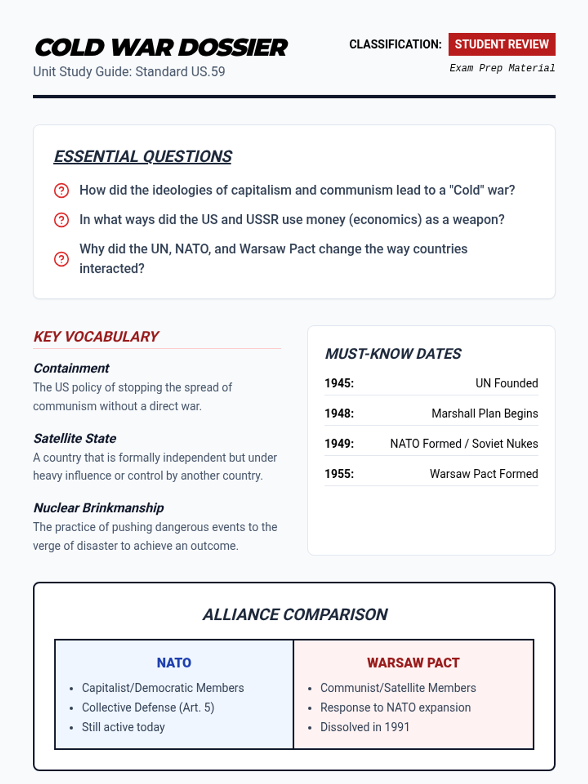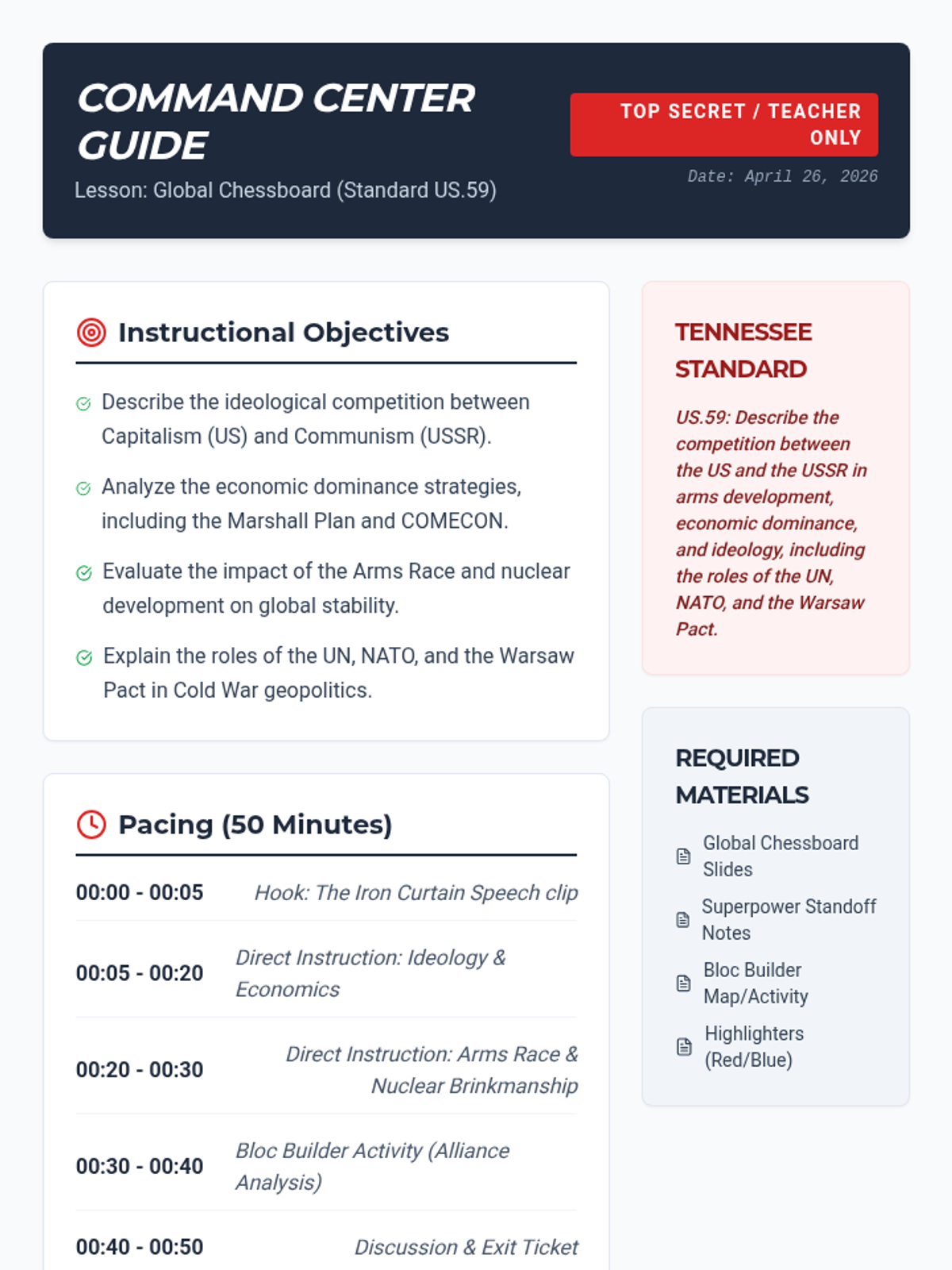 A comprehensive 50-minute lesson on the Cold War rivalry between the US and USSR, covering ideology, economic dominance, arms development, and international alliances like NATO and the Warsaw Pact.