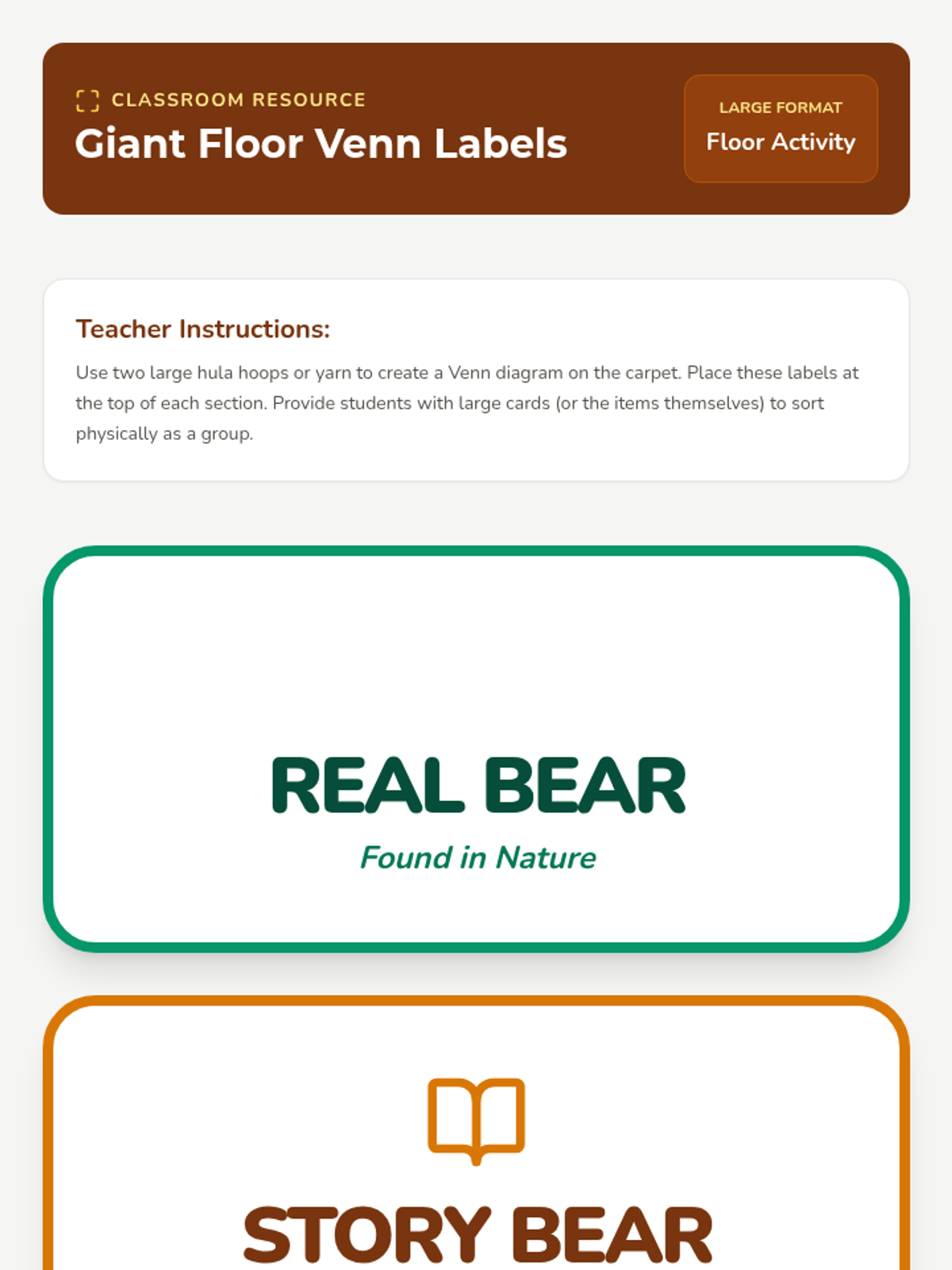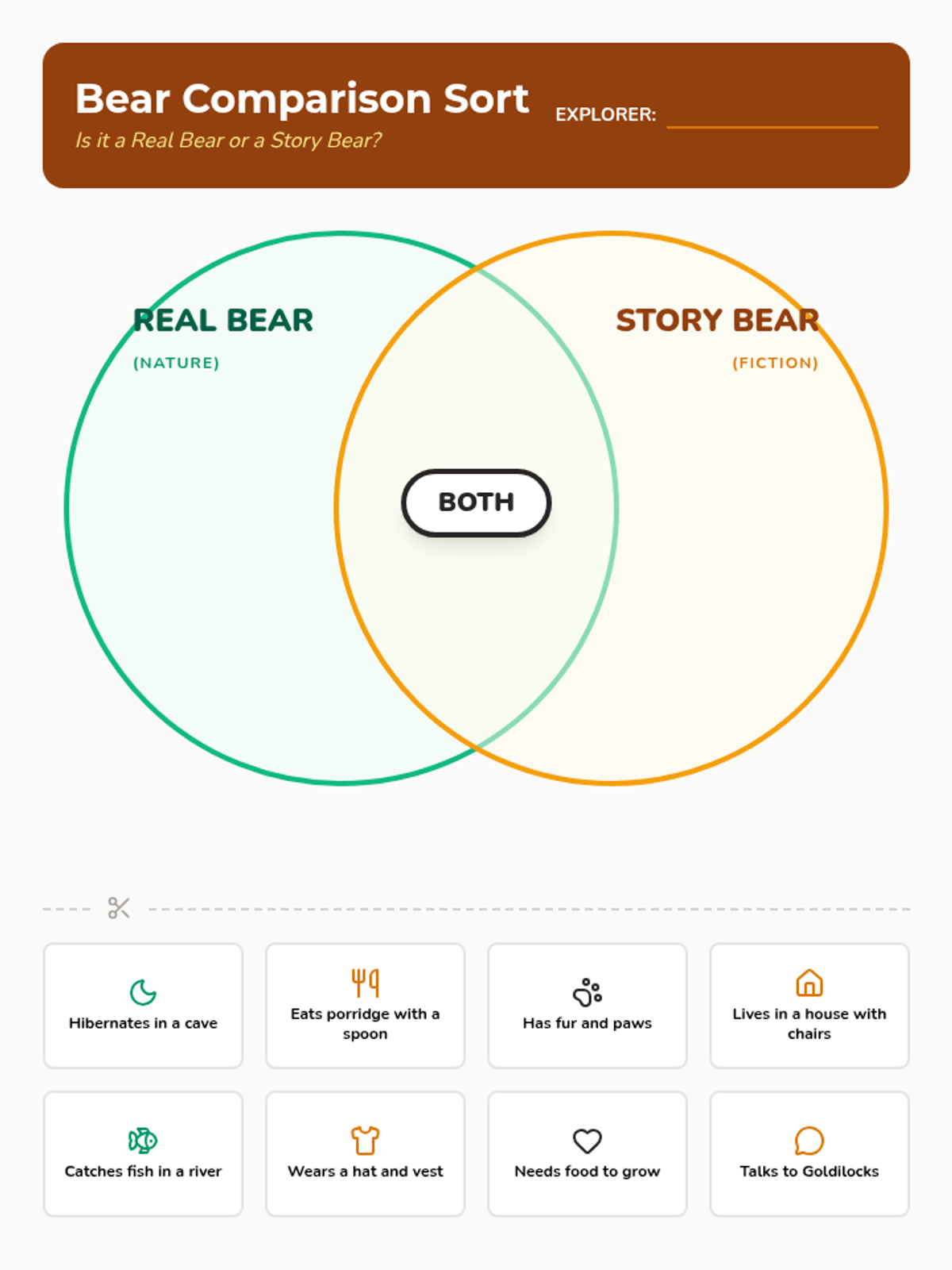 Using bears as a case study, students compare real-life behaviors with fictional tropes (like Goldilocks) using a Venn diagram.