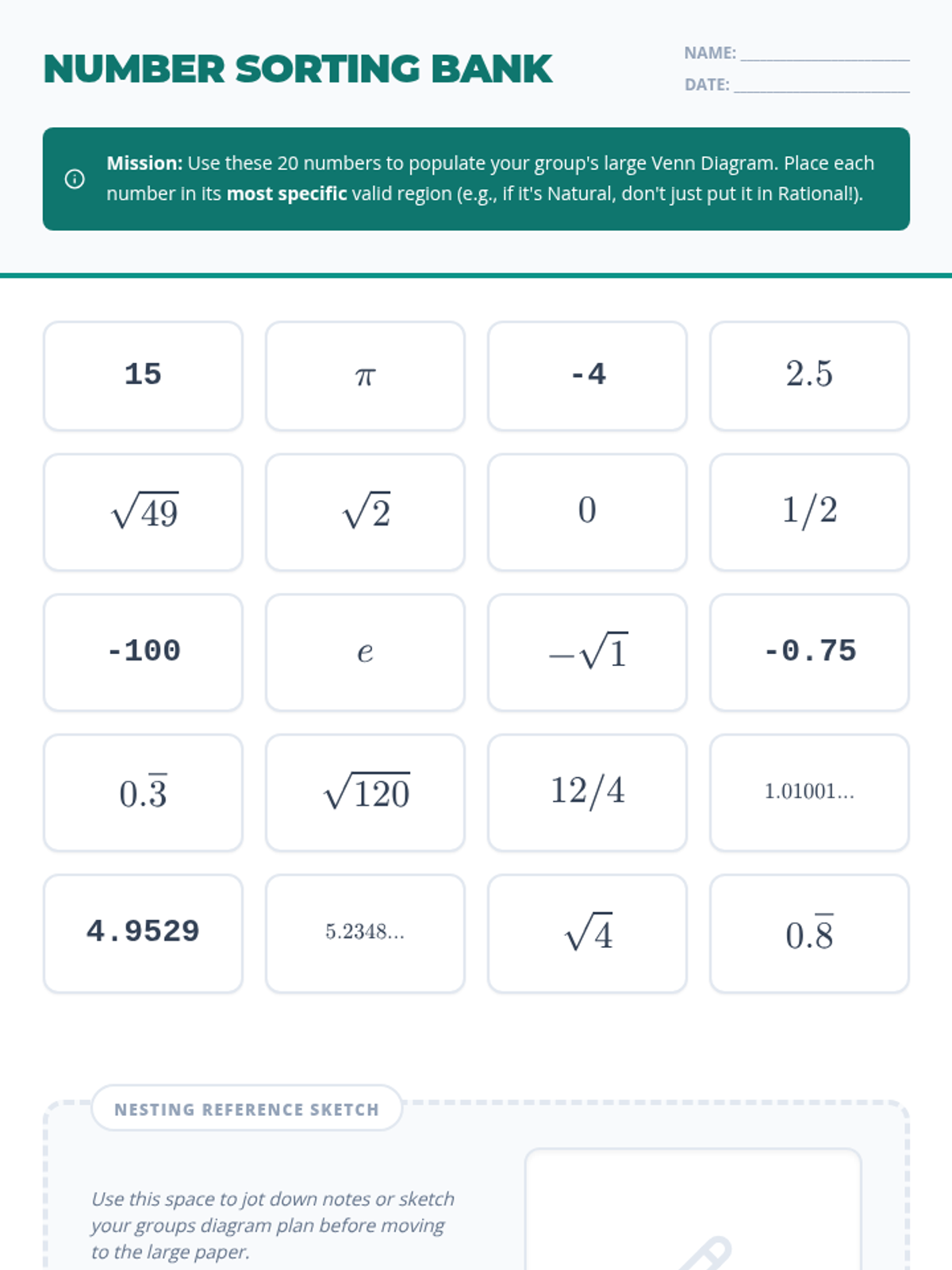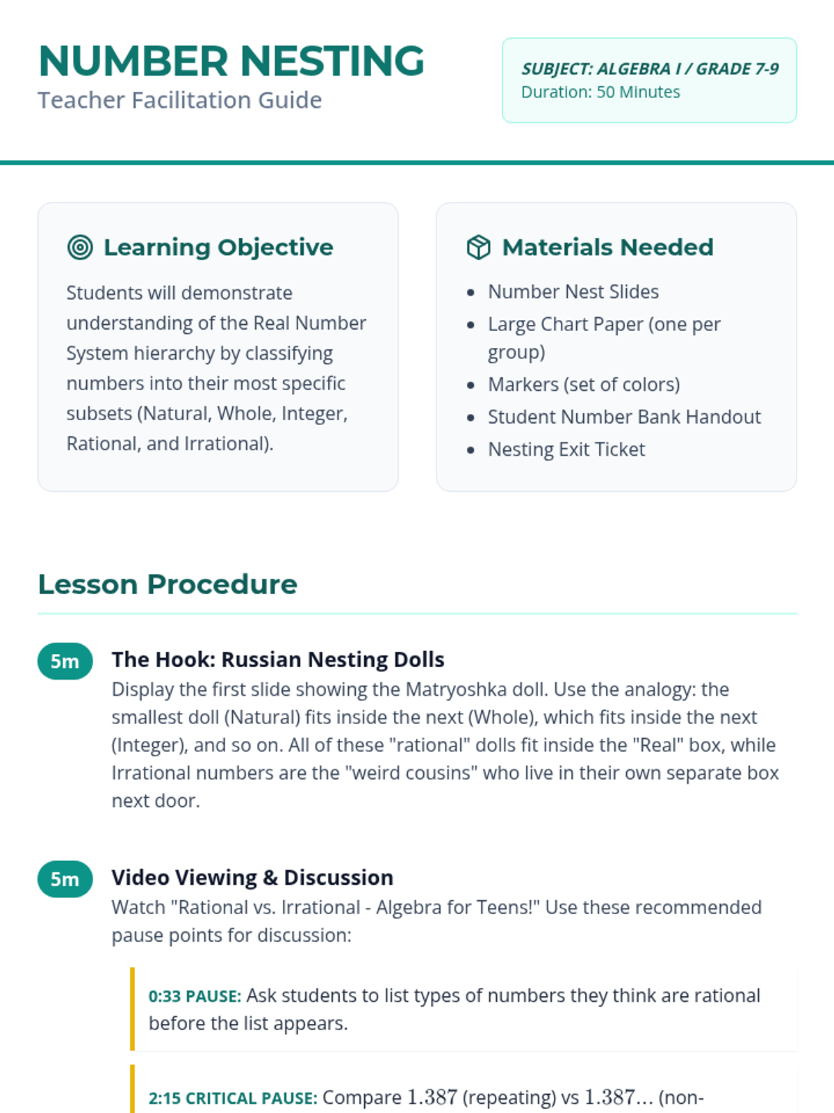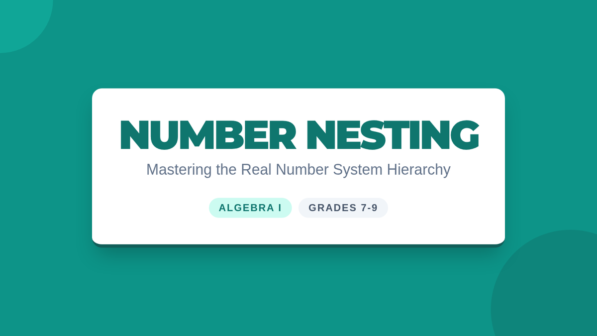 A comprehensive lesson introducing students to the hierarchy of the Real Number System, using nesting analogies and classification activities to distinguish between natural, whole, integers, rational, and irrational numbers.
