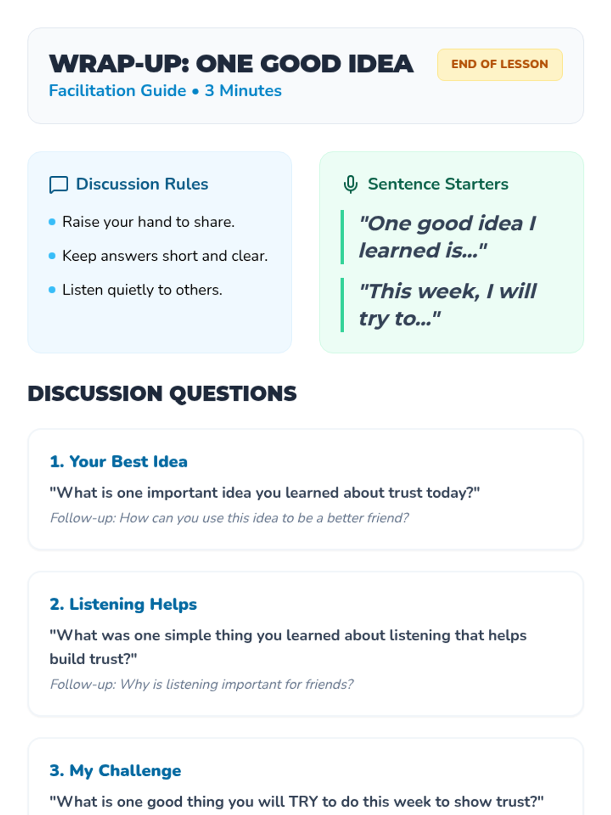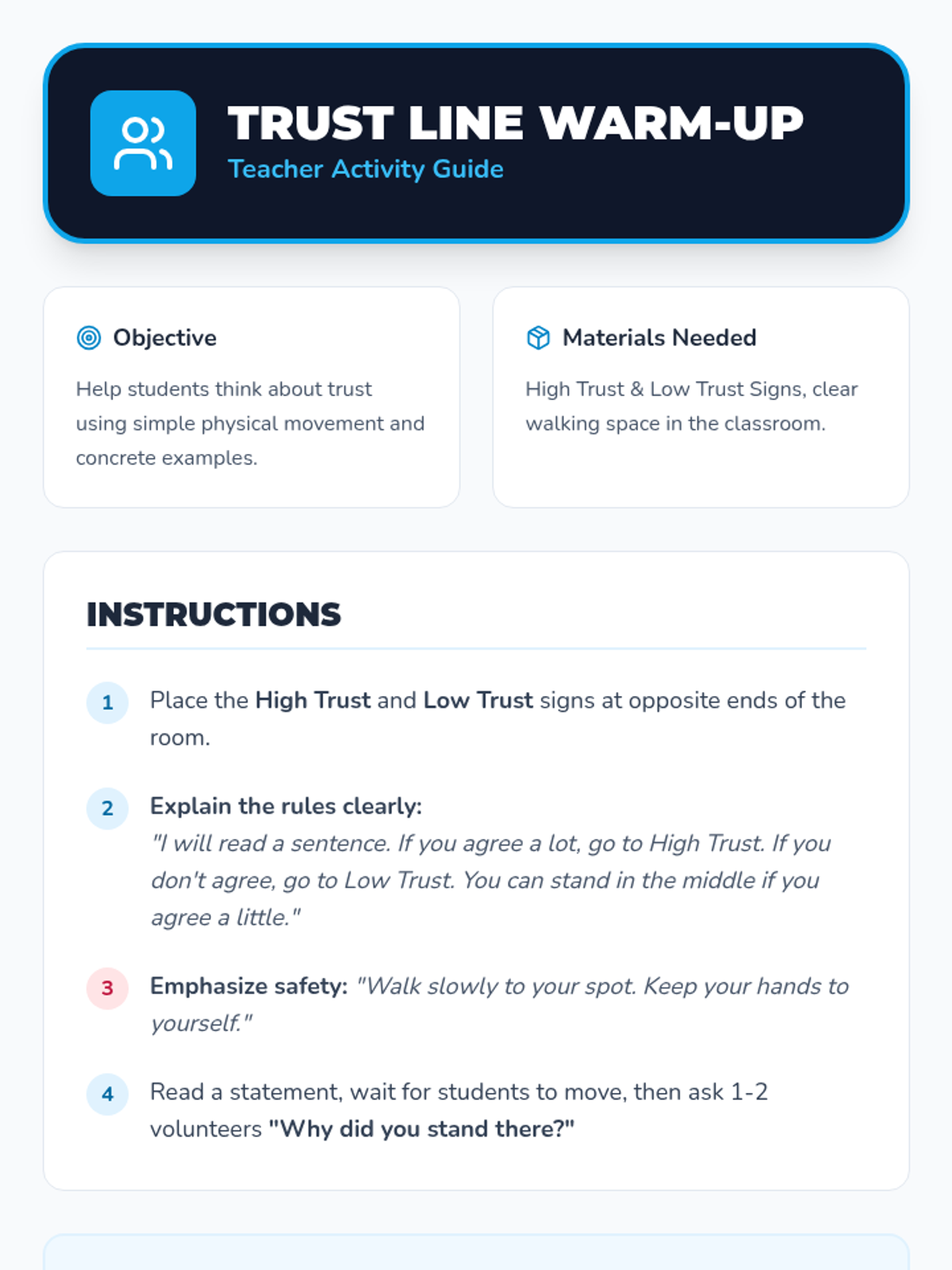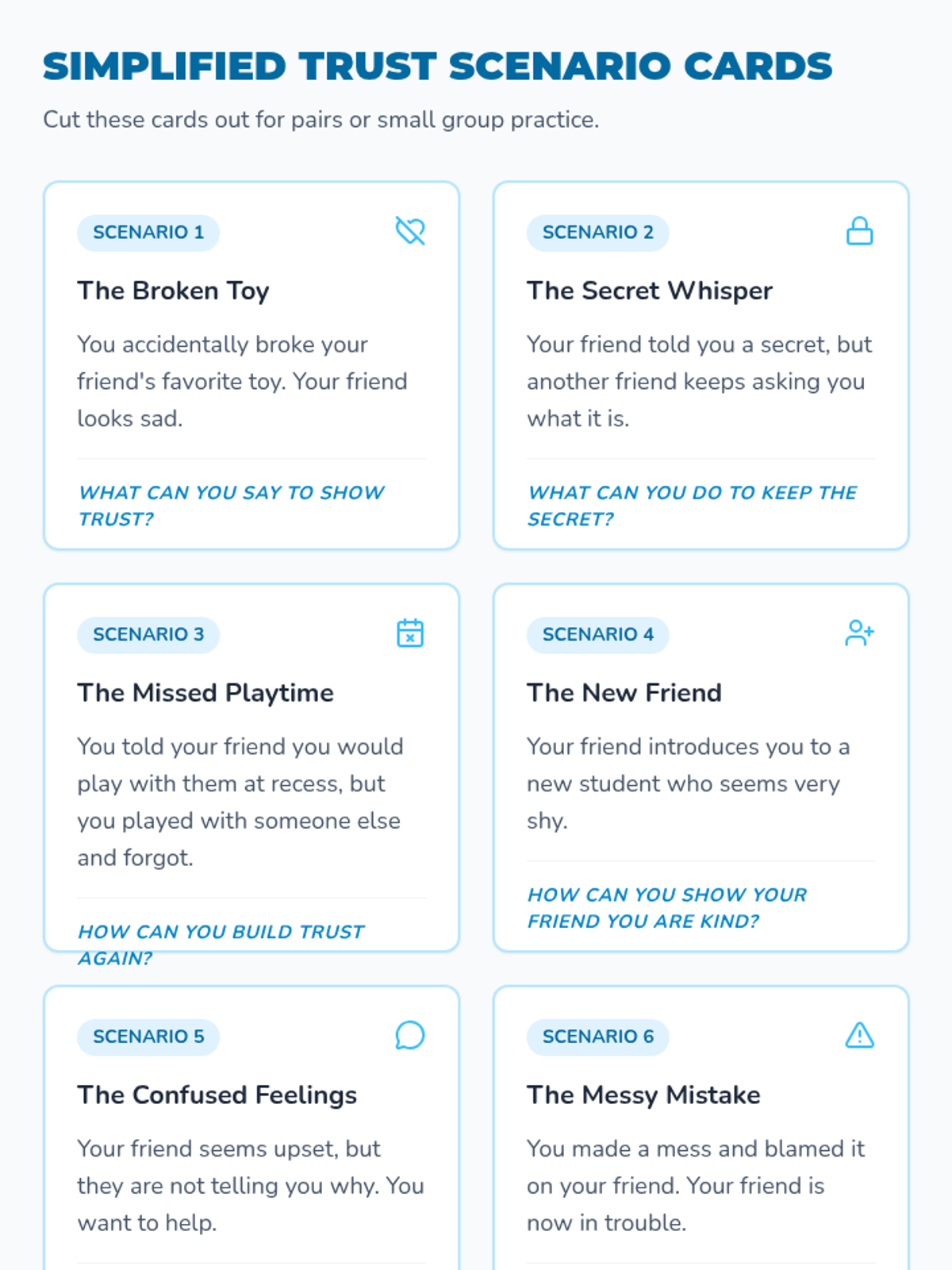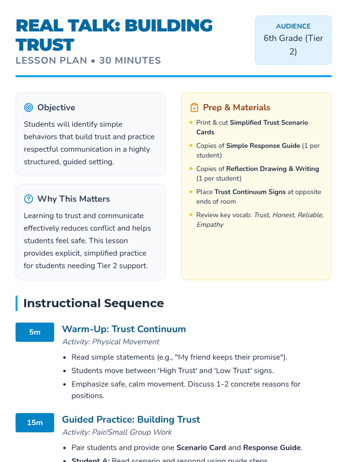 A 30-minute Tier 2 SEL lesson for 6th graders with IEPs (3rd-grade level) focusing on trust, communication, and empathy through structured activities and simplified scenarios.
