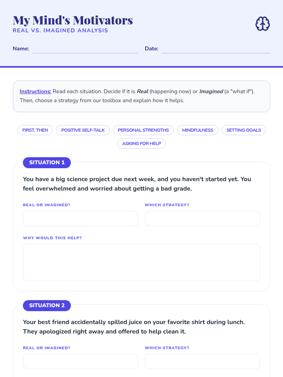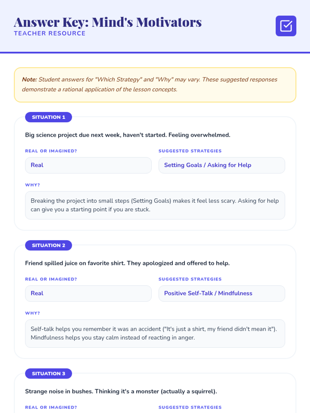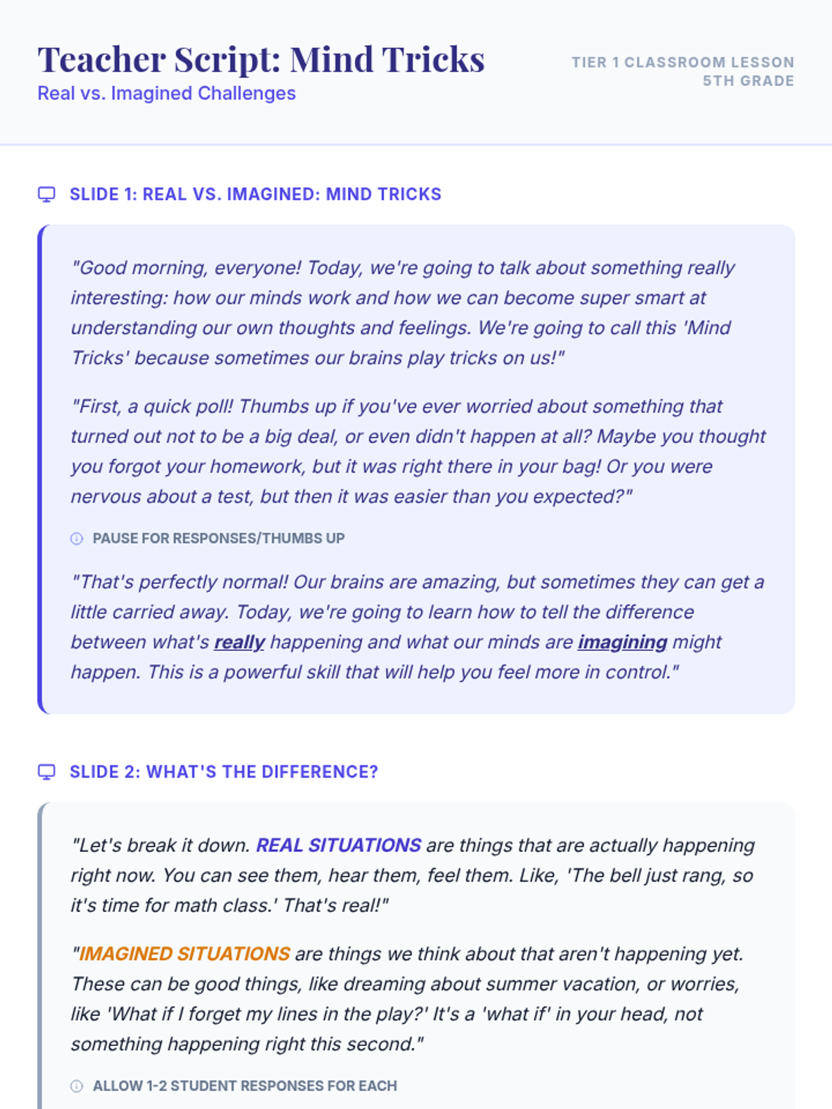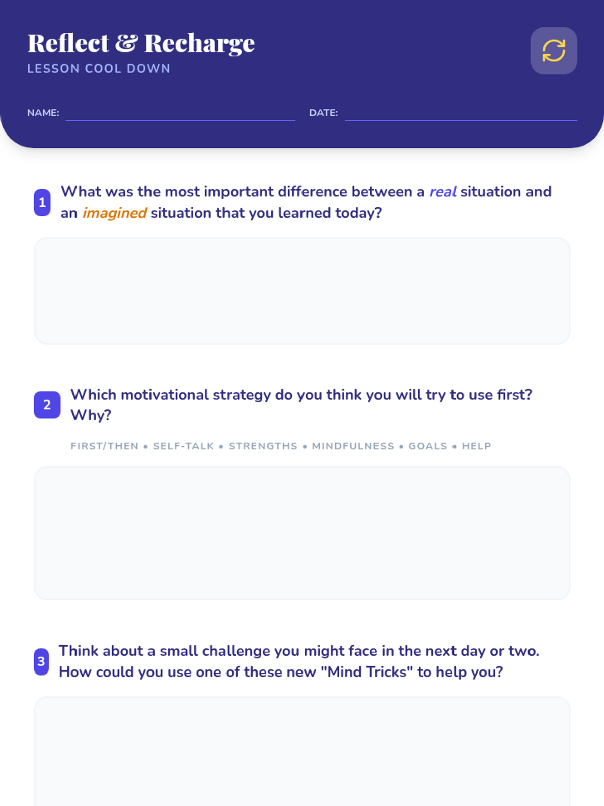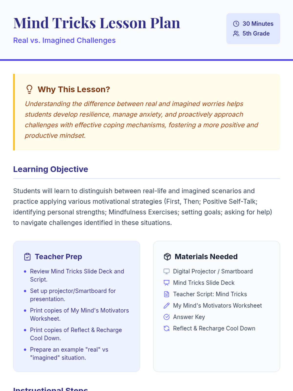 A 30-minute Tier 1 classroom lesson for 5th graders focused on distinguishing between real and imagined situations and applying practical motivational strategies to manage them effectively.