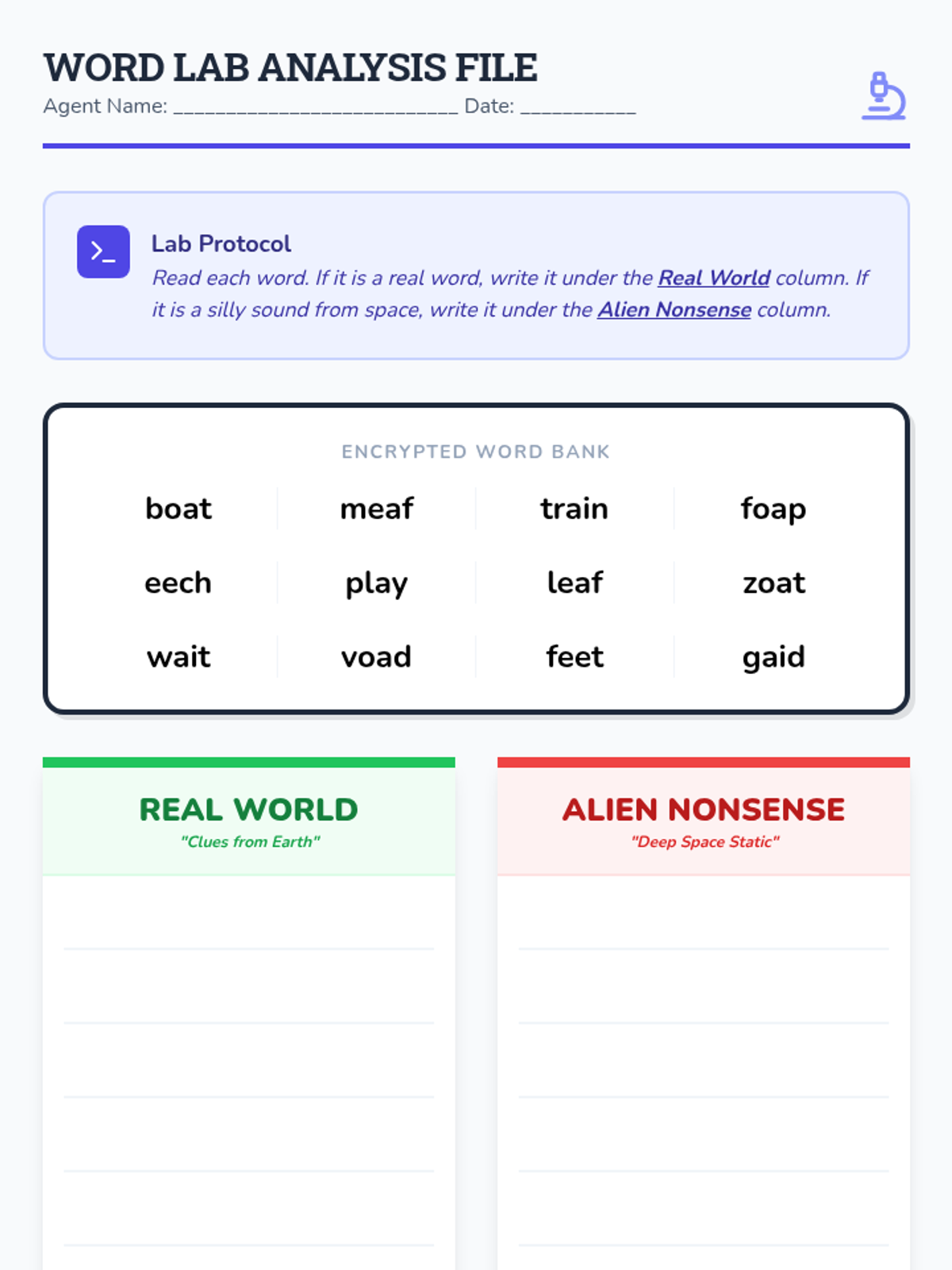 Students apply decoding skills to distinguish between real words and nonsense words using vowel team rules.