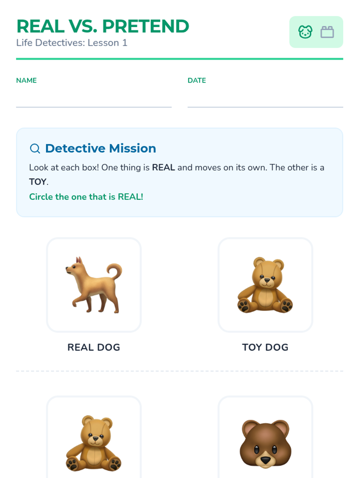 Students observe a real animal alongside a stuffed animal to identify differences in movement and responsiveness, learning that living things move on their own.