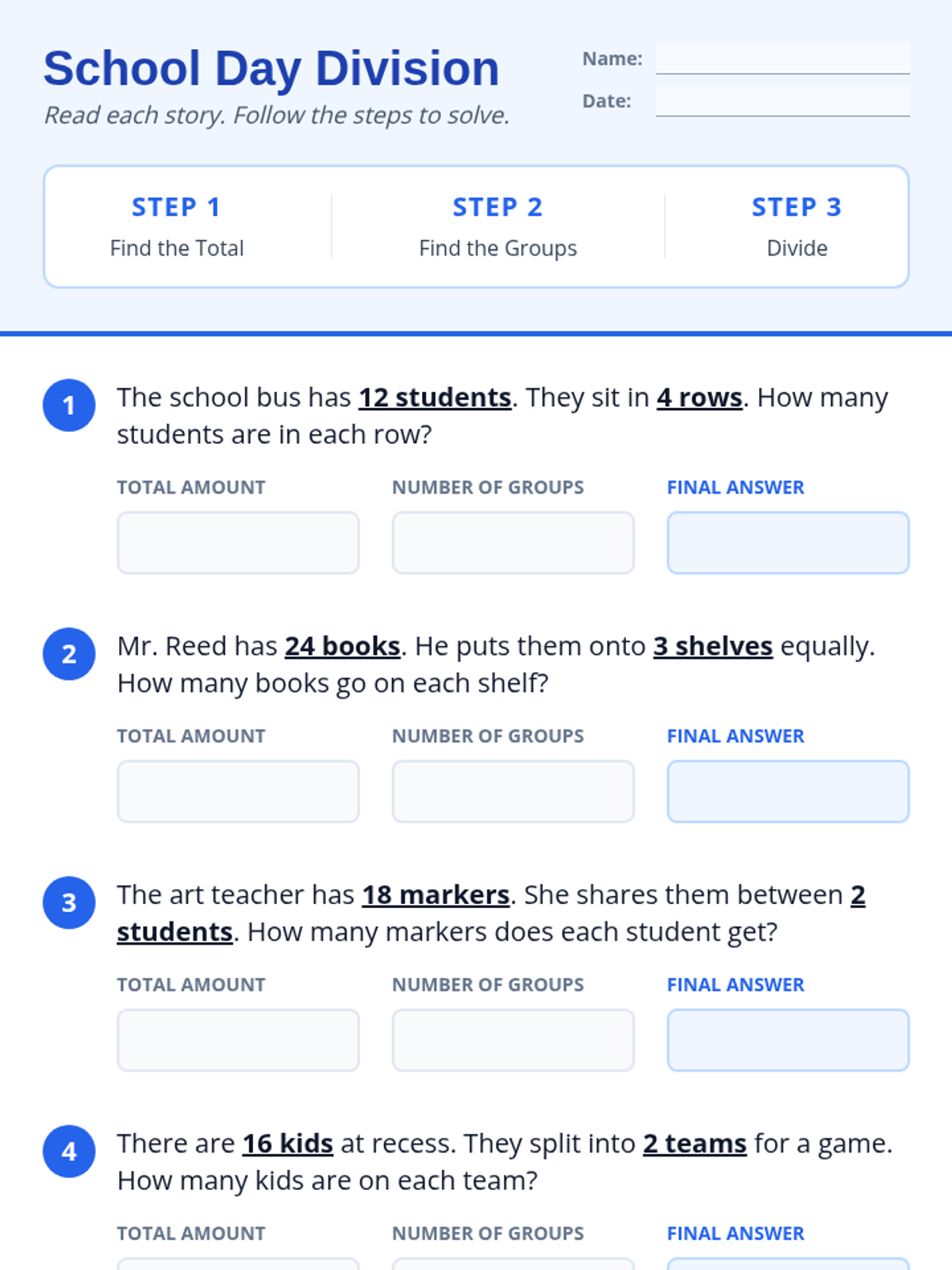 A lesson focused on breaking down simple division word problems into manageable steps using familiar school and errand scenarios. Designed with structured supports for a 4th-grade student with autism.