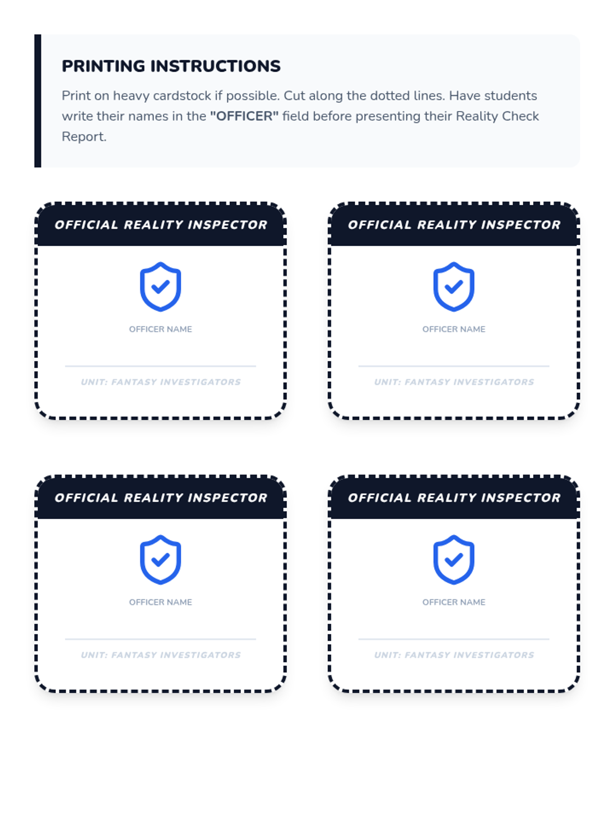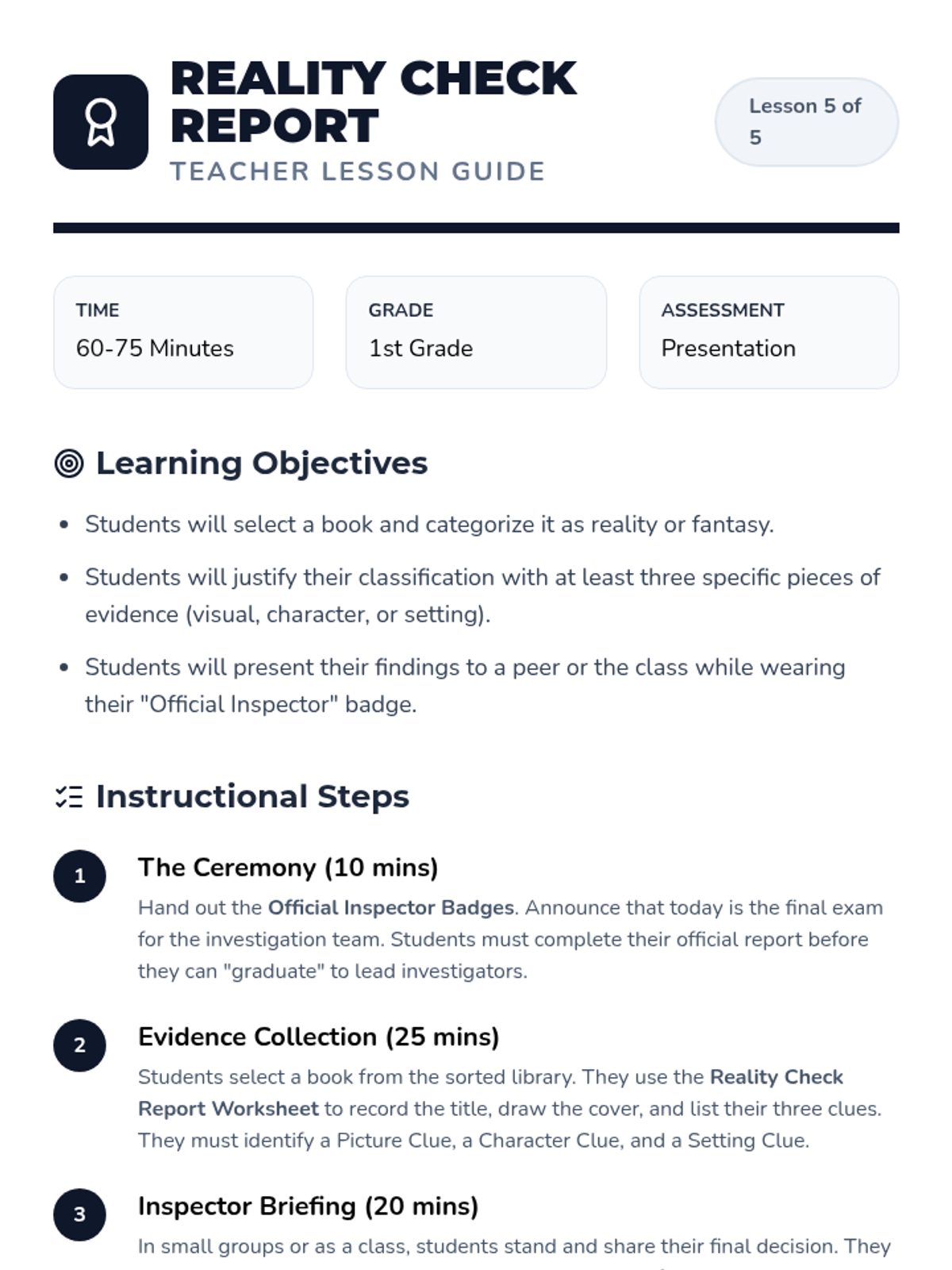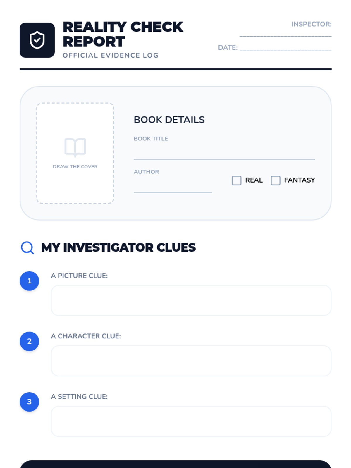 Students justify their classification of a book as reality or fiction using specific evidence in an "Official Inspector" report.
