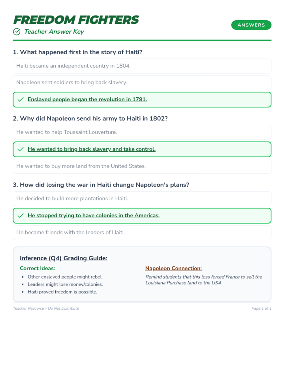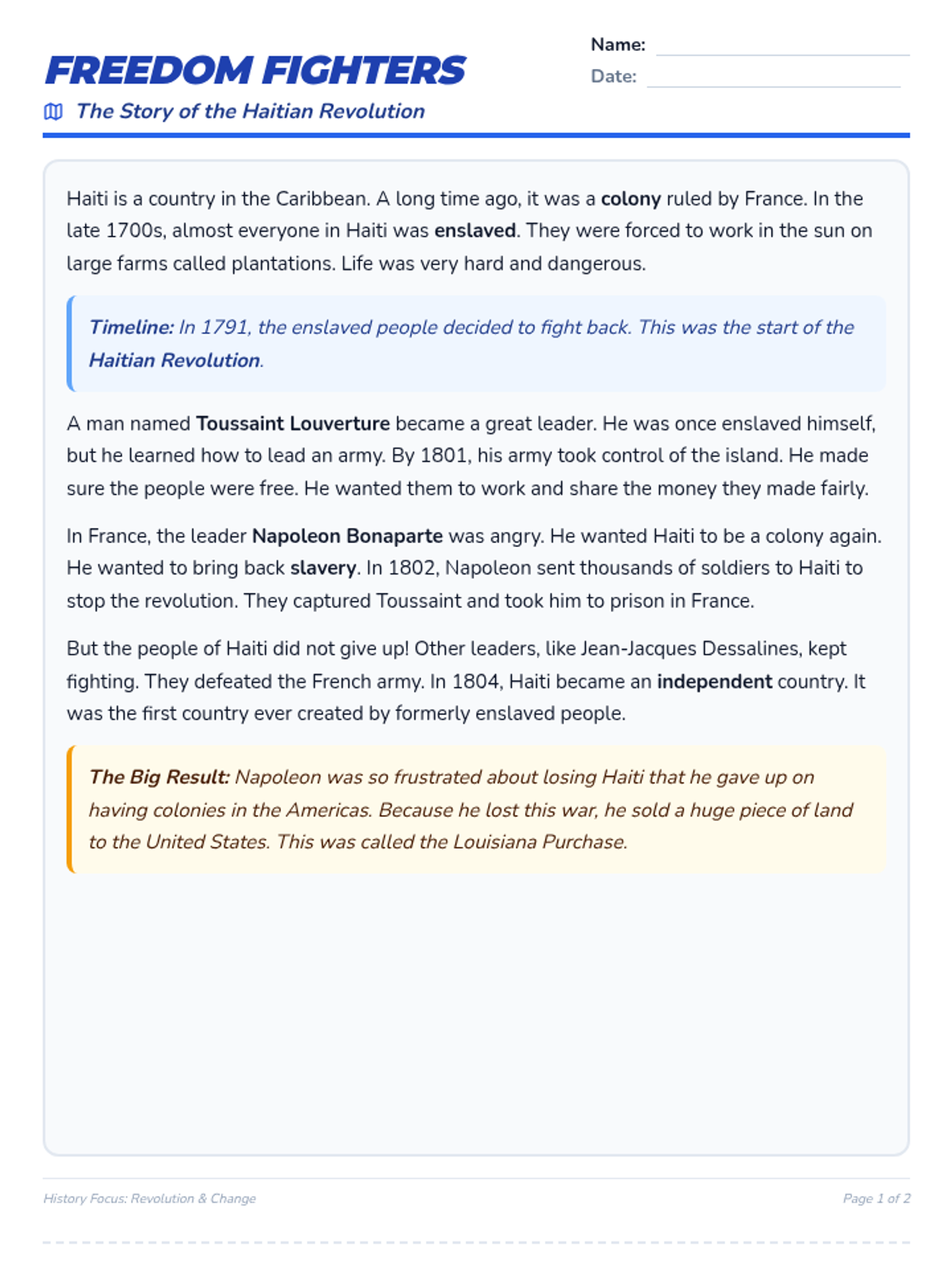 A lesson focused on the Haitian Revolution, its key figures like Toussaint Louverture, and the broader impact of the revolution on France's colonial ambitions in the Americas. Optimized for 5th-grade reading levels, English Language Learners, and students in special education.