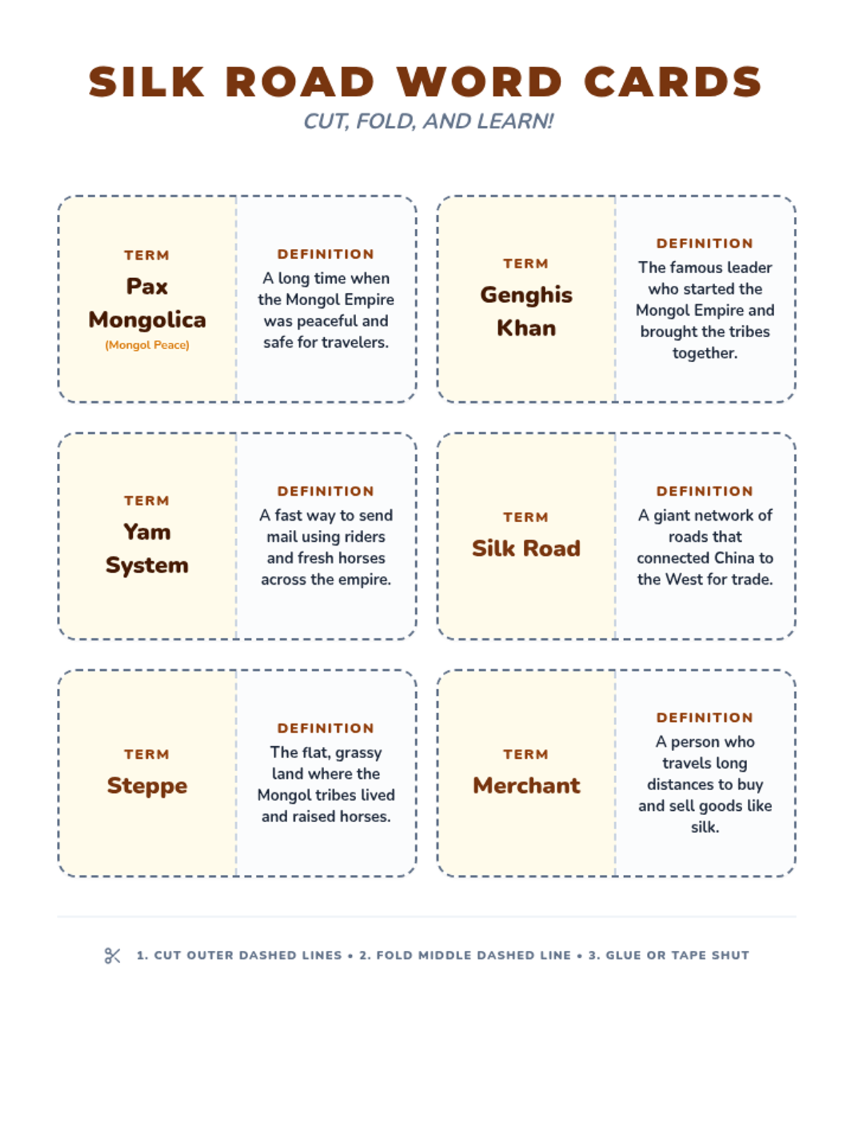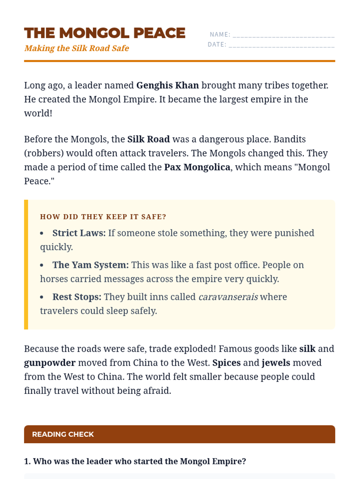 This introductory lesson explores how the Mongol Empire made the Silk Road safe and busy. It uses simple language to explain the 'Mongol Peace,' their fast mail system, and the trade of famous goods.